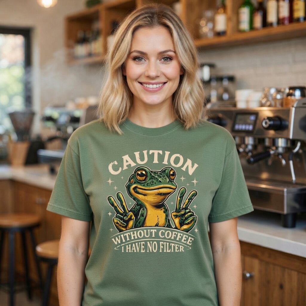Distressed Print Caution Without Coffee I Have No Filter - Funny Frog T-Shirt