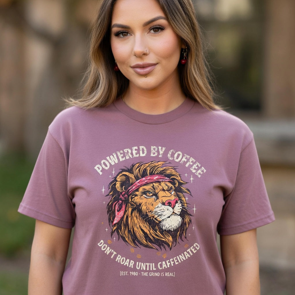 Distressed Print Powered by Coffee Lion T-Shirt — Don't Roar Until Caffeinated Graphic Tee