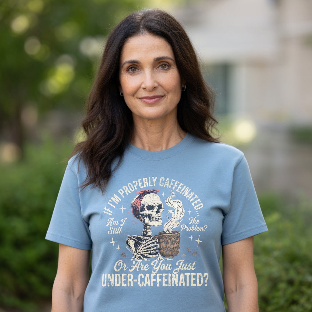 Distressed Print Caffeinated Skull T-Shirt — “If I'm Properly Caffeinated…Are You Just Under‑Caffeinated?”
