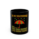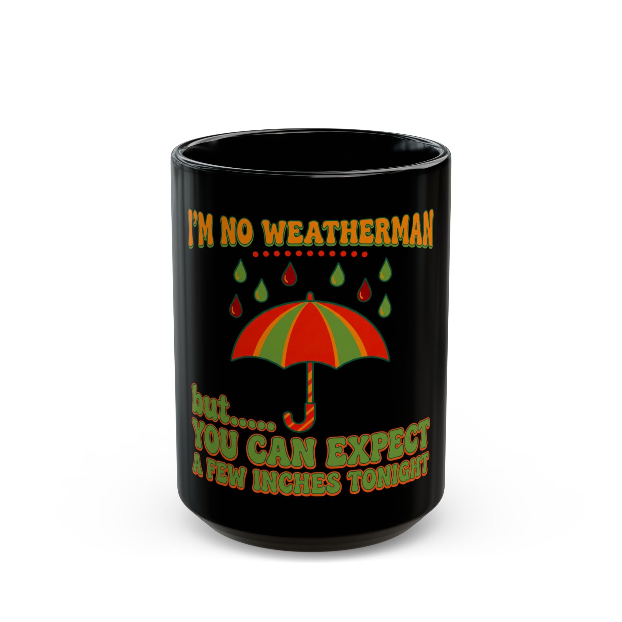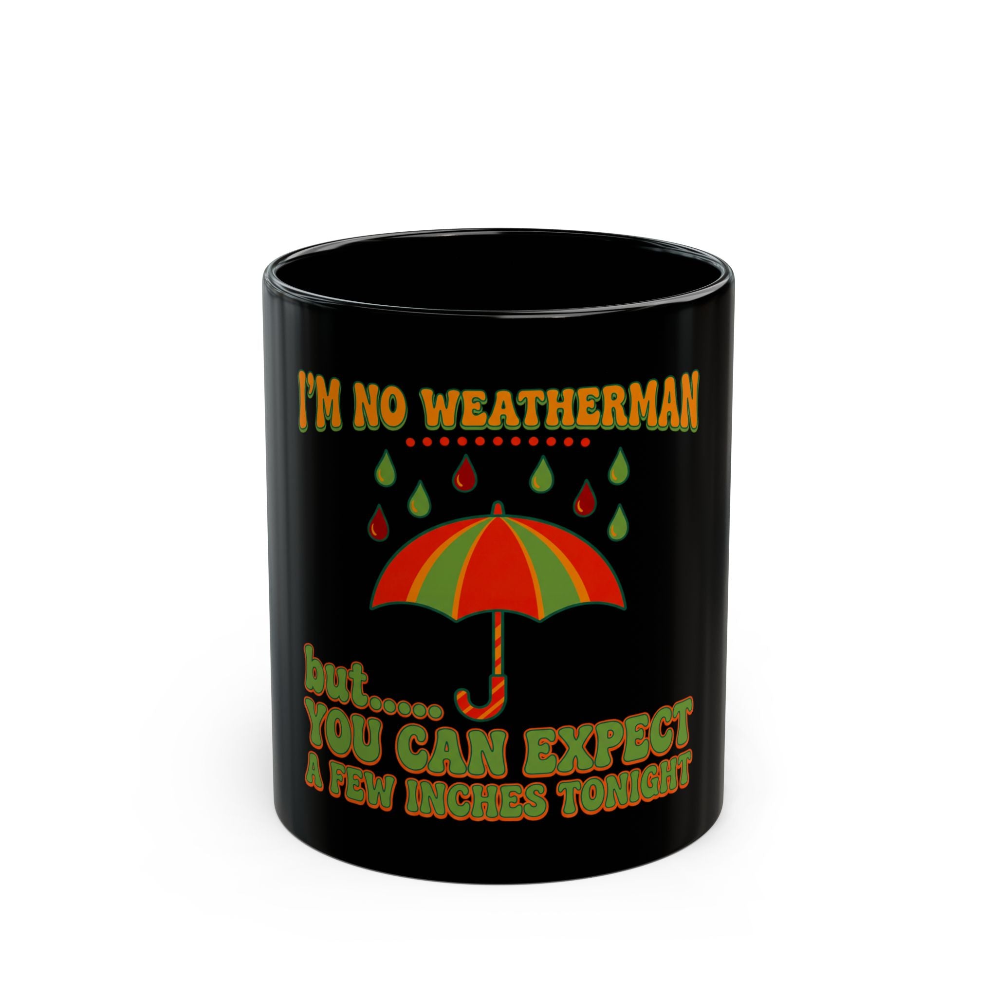 Start your morning with a splash of humor and your absolute favorite brew. This cheeky, weather-inspired black ceramic coffee mug is designed for those who love a good laugh alongside their daily dose of caffeine. Featuring the playful phrase "I'm No Weatherman, But You Can Expect A Few Inches Tonight" paired with a colorful retro umbrella and raindrops, this mug brings instant joy to your daily routine. Whether you are quietly sipping a dark roast on a rainy morning or enjoying a soothing evening herbal tea, this whimsical cup perfectly blends cozy comfort with a hilarious conversation starter.