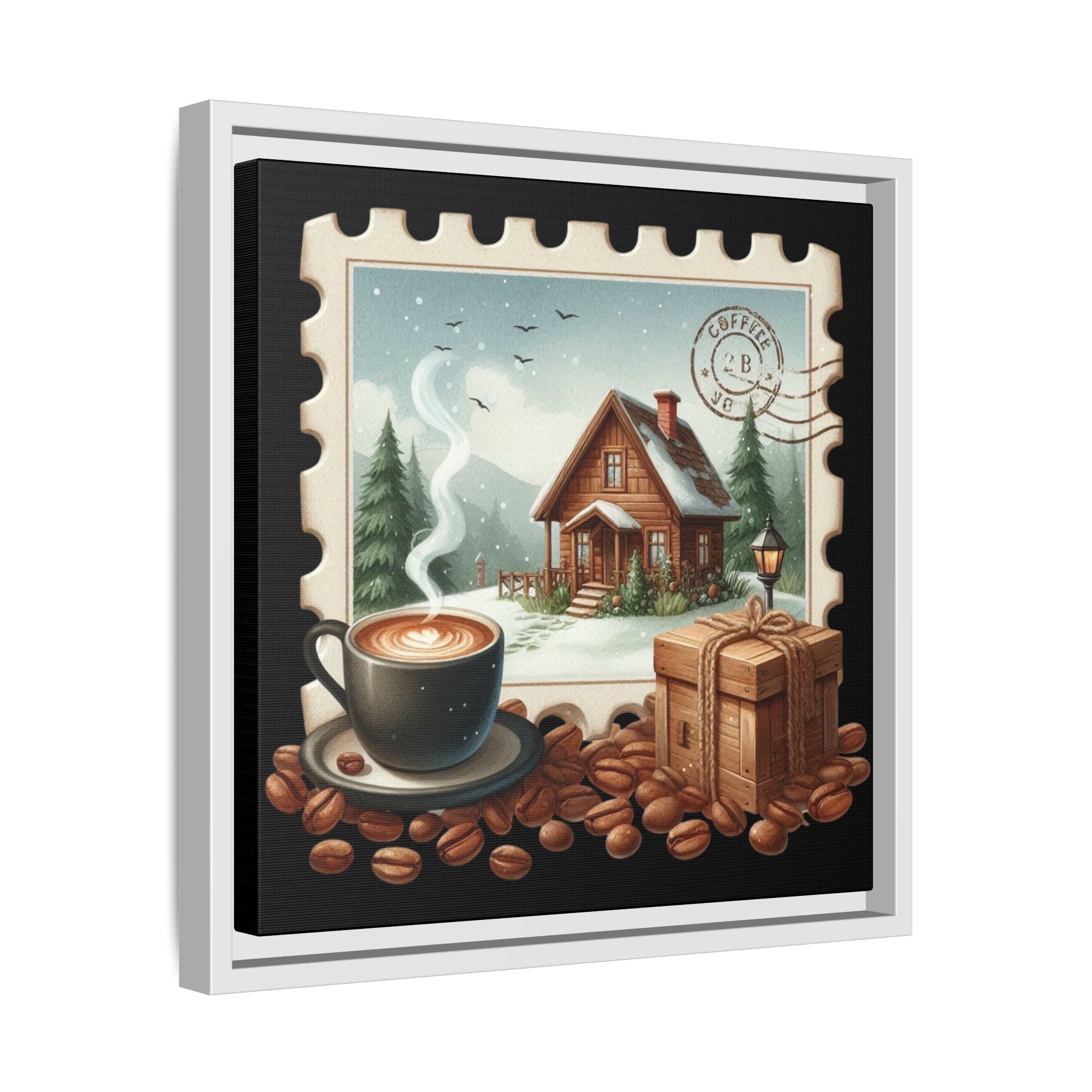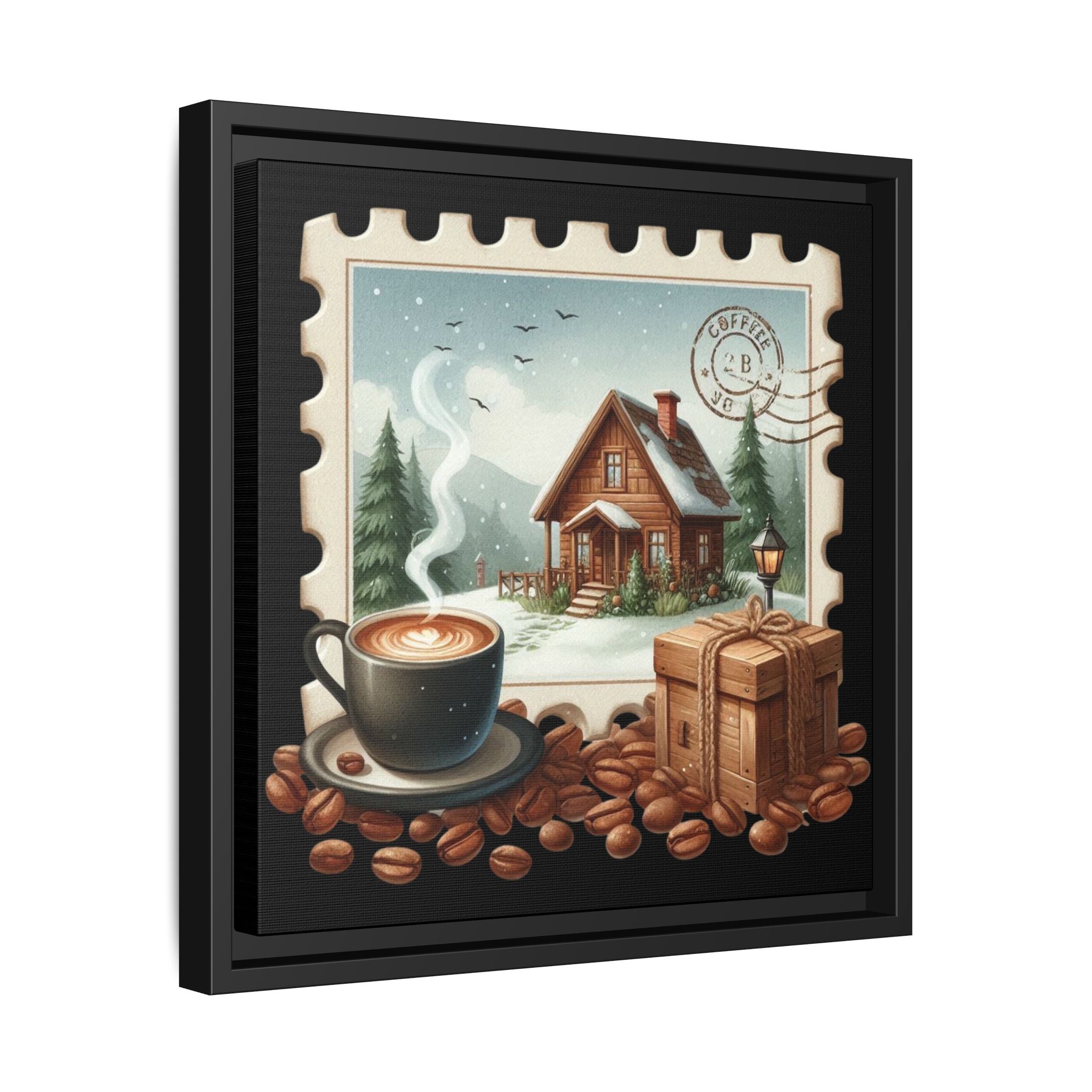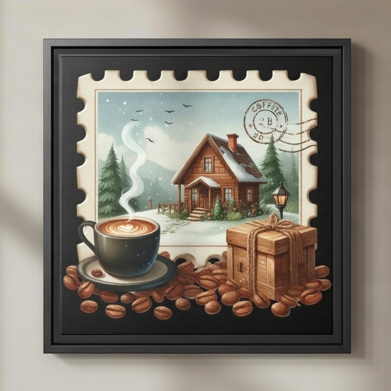 This framed matte canvas brings a warm, homey moment to your wall — imagine a steaming cup of coffee beside a snow-kissed cabin, rendered like a vintage postage stamp. The image invites slow mornings, cozy conversations, and the quiet comfort of a winter retreat. Lightweight yet sturdy, the black pine frame and sawtooth hanger make it simple to place above a kitchen shelf, beside a reading nook, or in a cabin entryway. Colors stay vivid thanks to Greenguard Gold-certified inks and a special canvas coating, so the little details — steam rising, wood grain, coffee beans — keep their charm over time. It’s for people who collect cozy moments and want a small, framed scene that feels like coming home every time they glance at it.
