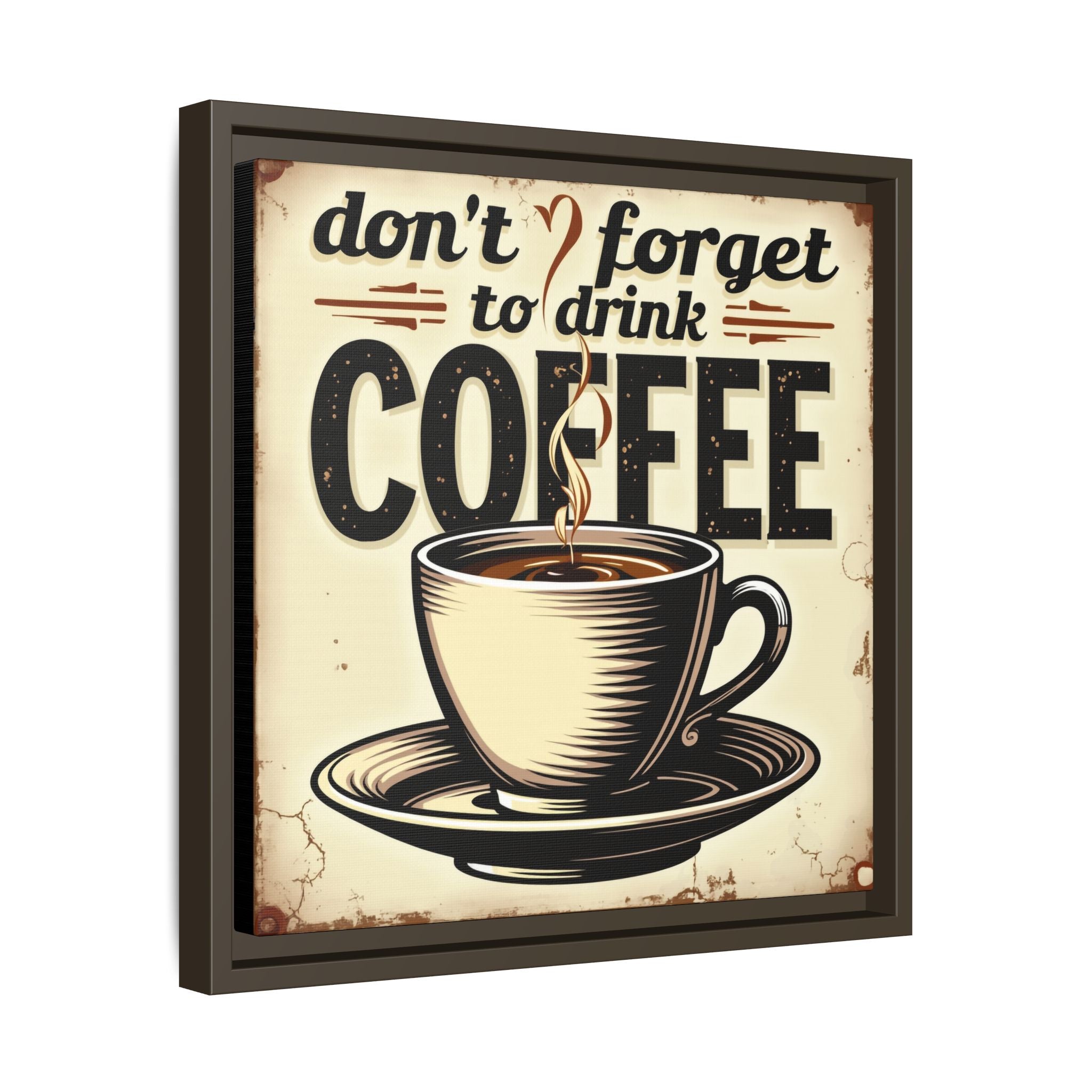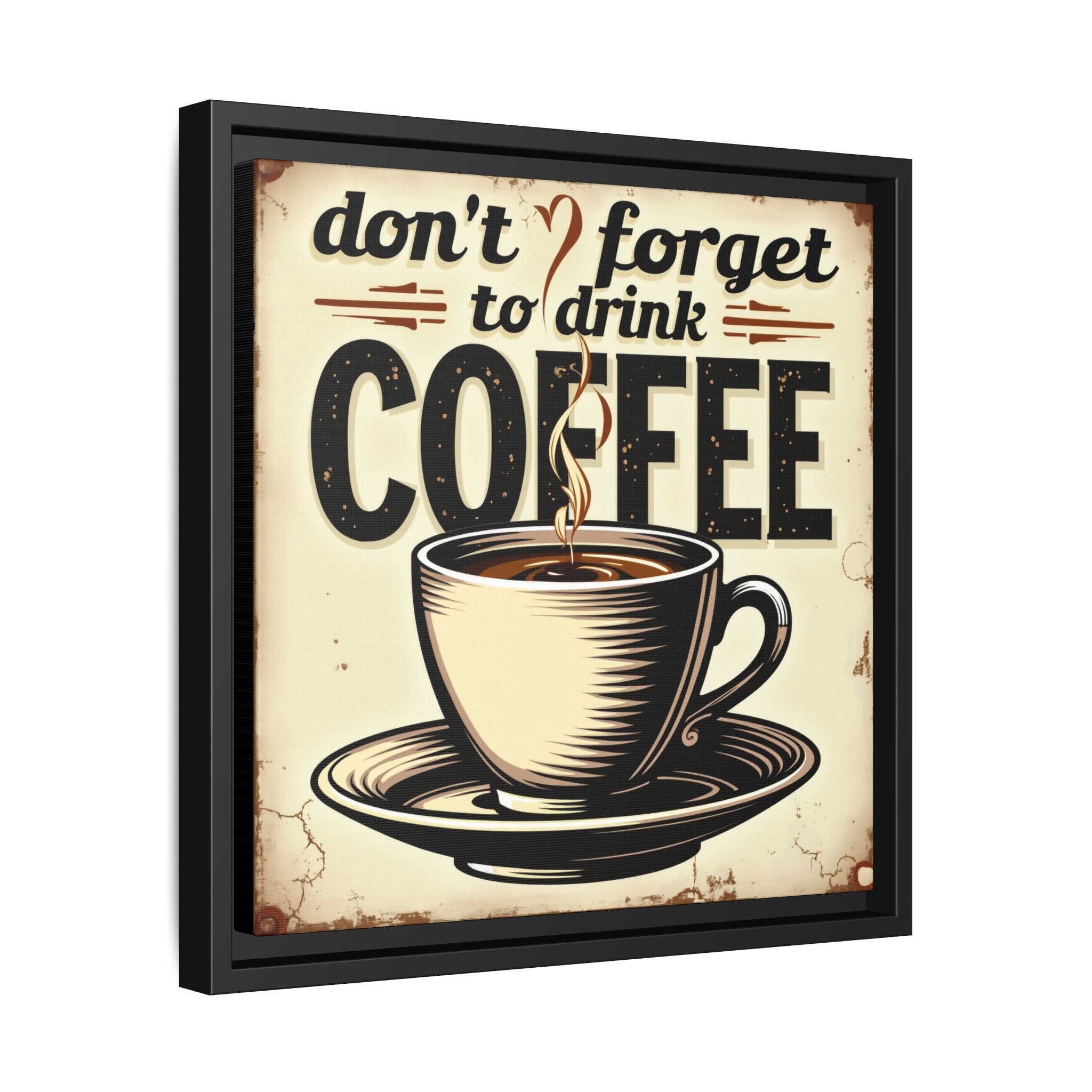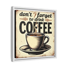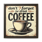 This framed matte canvas brings a warm, vintage coffee-shop vibe to your wall. A steaming cup and bold retro lettering — "don't forget to drink COFFEE" — create a cozy, wakeful moment every time you pass by. The muted cream background and distressed edges feel lived-in, like a favorite café sign nailed above the espresso machine. Mounted on a slim pine frame with sawtooth hardware, it hangs easily in kitchens, breakfast nooks, or behind a home coffee bar. The rich inks and textured canvas catch light softly, making the illustration pop without glare. It’s the kind of piece that starts mornings with a small, cheerful nudge and anchors casual, everyday spaces with vintage charm.