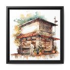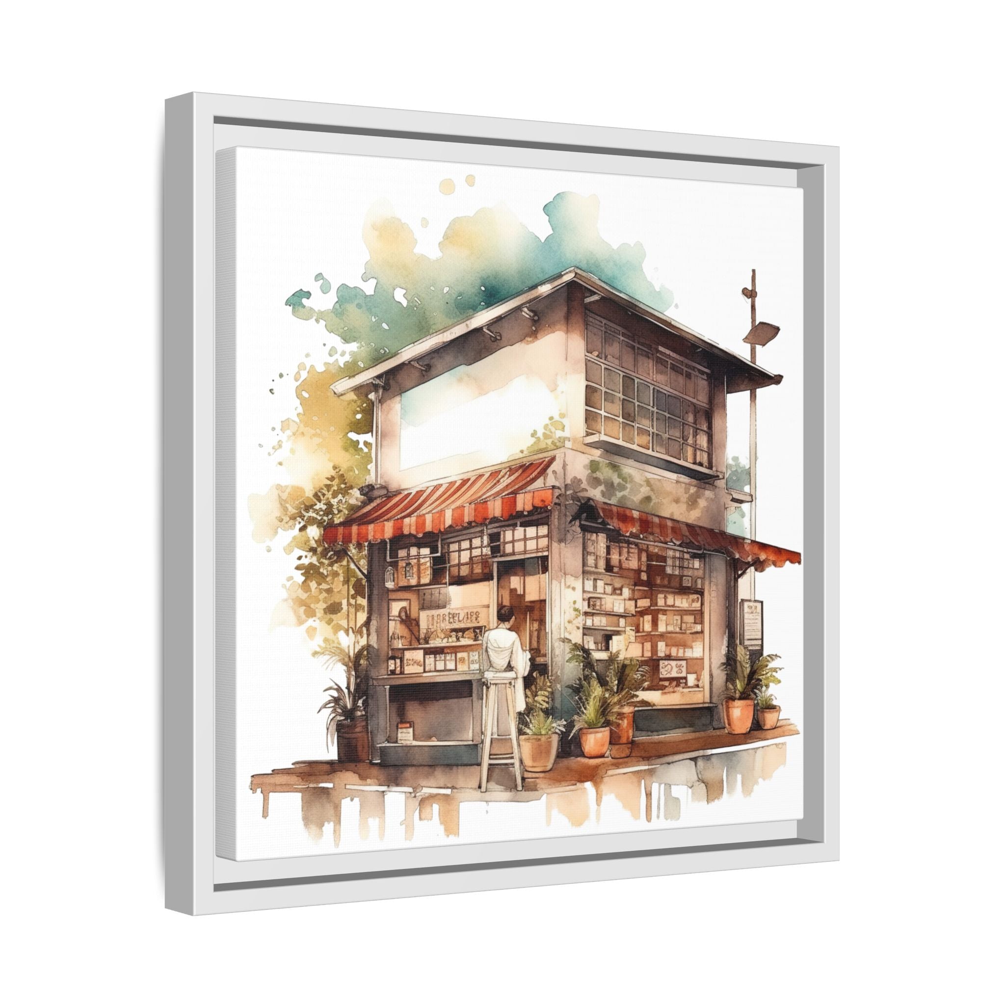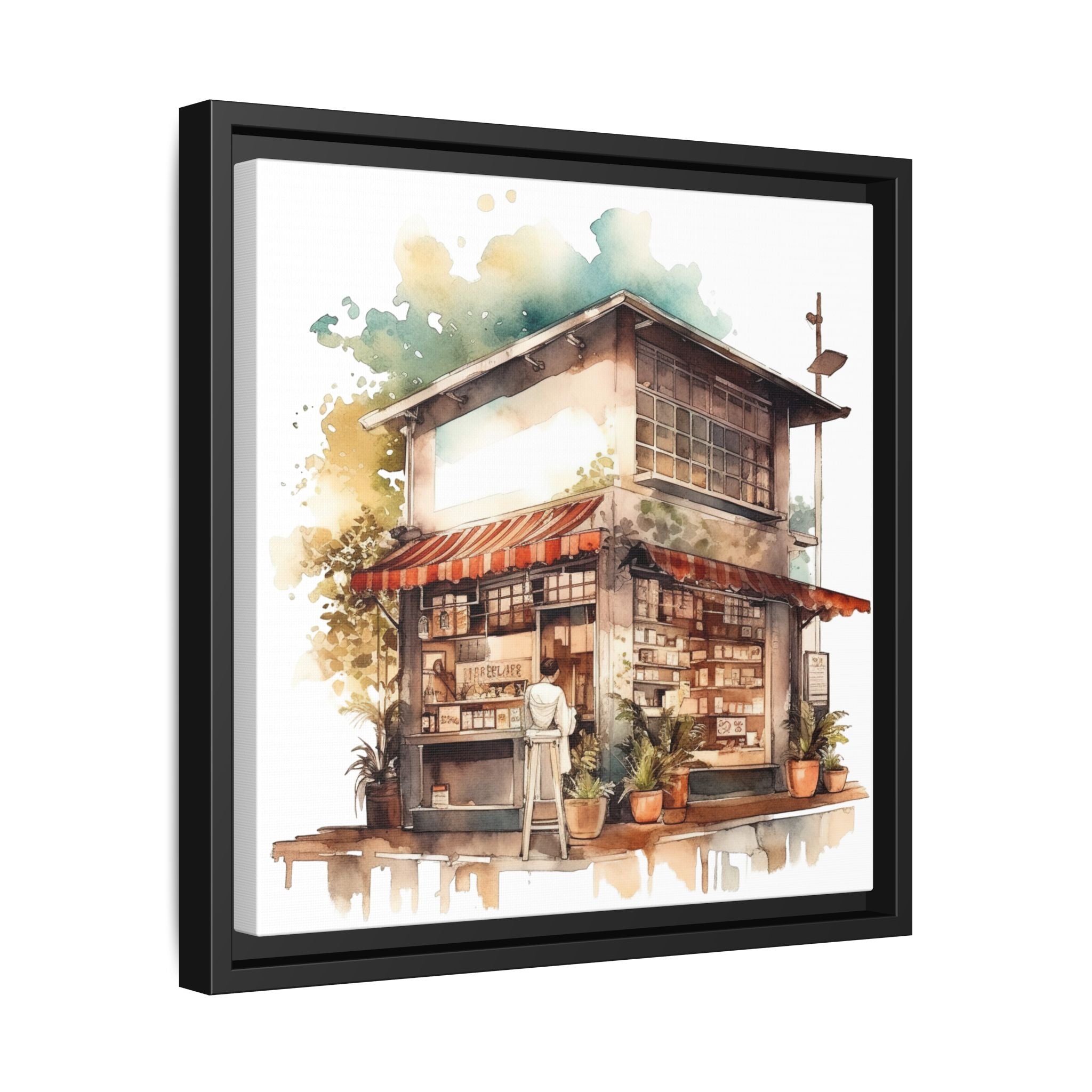 A framed matte canvas print that brings a quiet, sunlit street corner into your home. The watercolor-style illustration captures a small, layered storefront—potted plants crowd the steps, an awning shades rows of goods, and warm light pools across weathered wood. The black frame gives the piece a contemporary edge while the matte finish keeps the colors soft and painterly. Hang it where you want a gentle, nostalgic pause: a reading nook, kitchen wall, or entryway that welcomes slow moments and everyday stories.
