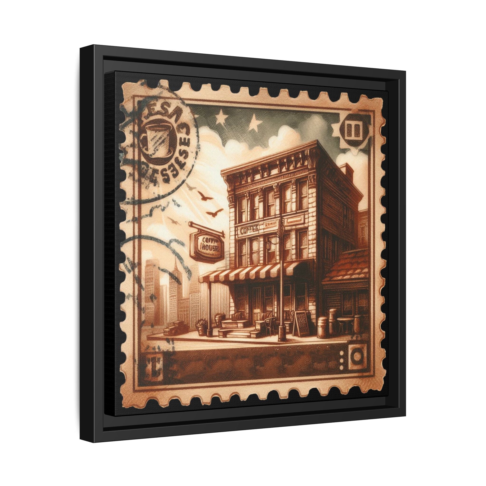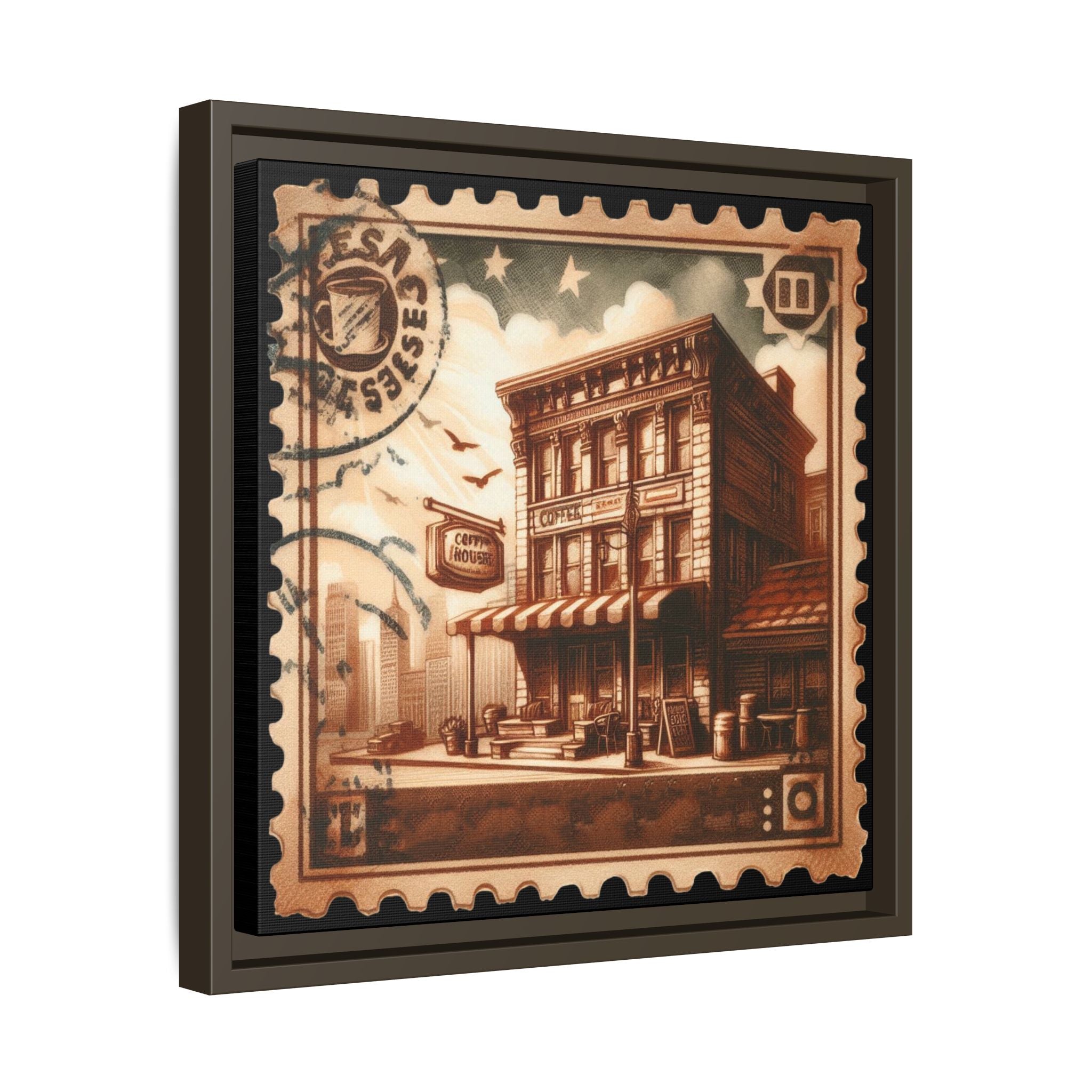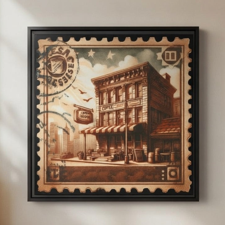 This matte canvas framed print brings a warm, vintage-stamp aesthetic into your space. The sepia tones and detailed illustration evoke slow mornings on a quiet city corner—coffee steam rising, old storefront facades, distant skyline silhouettes. Mounted on a slim pine frame with a textured matte finish, the piece reads like a curated relic: nostalgic but fresh. It hangs easily with included sawtooth hardware and works as a focused accent on a gallery wall, above a console, or in a cozy reading nook where quiet stories and slow rituals happen.