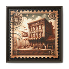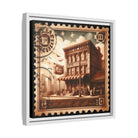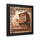 Vintage Postage Stamp Cityscape Framed Canvas Print | 14x14 Pine Frame