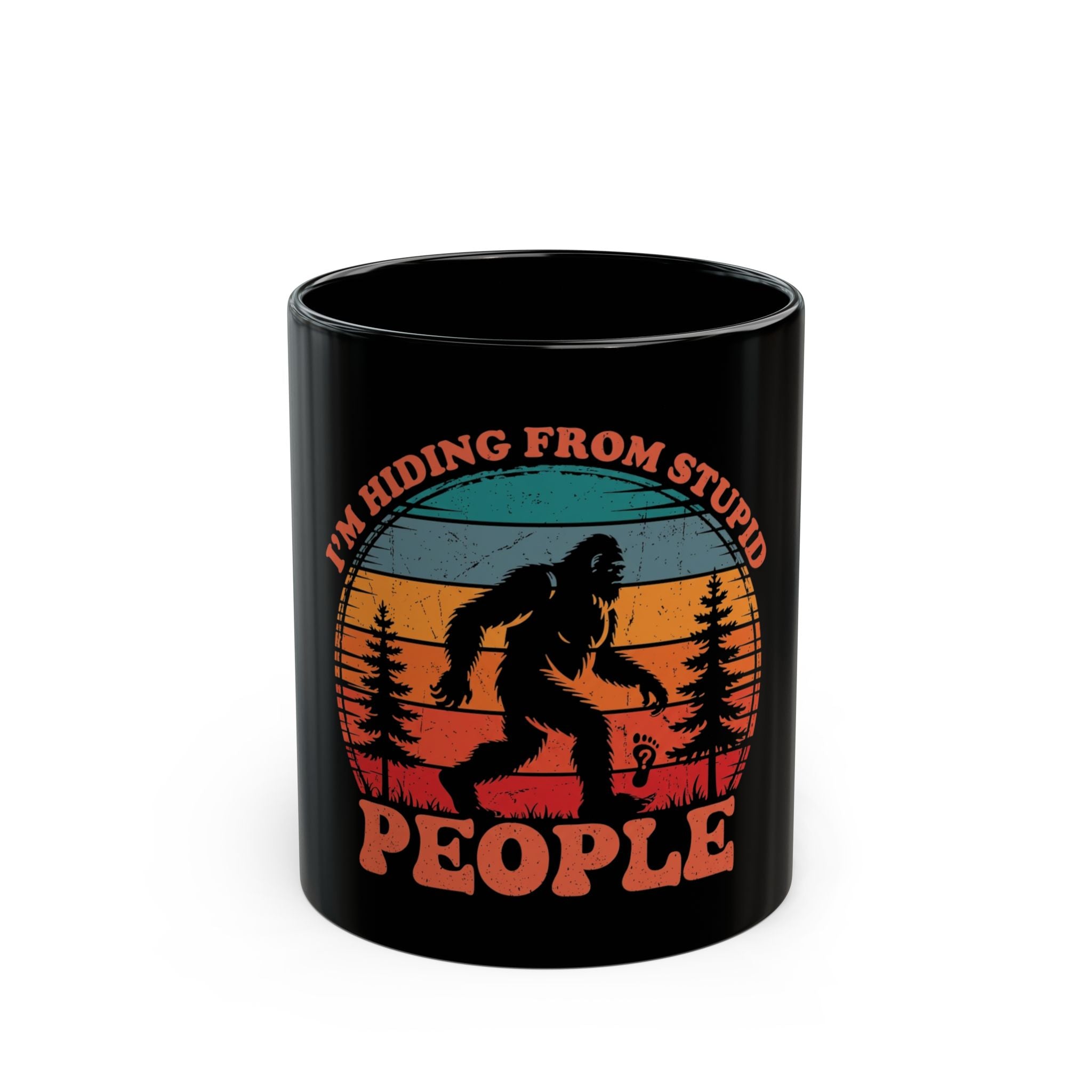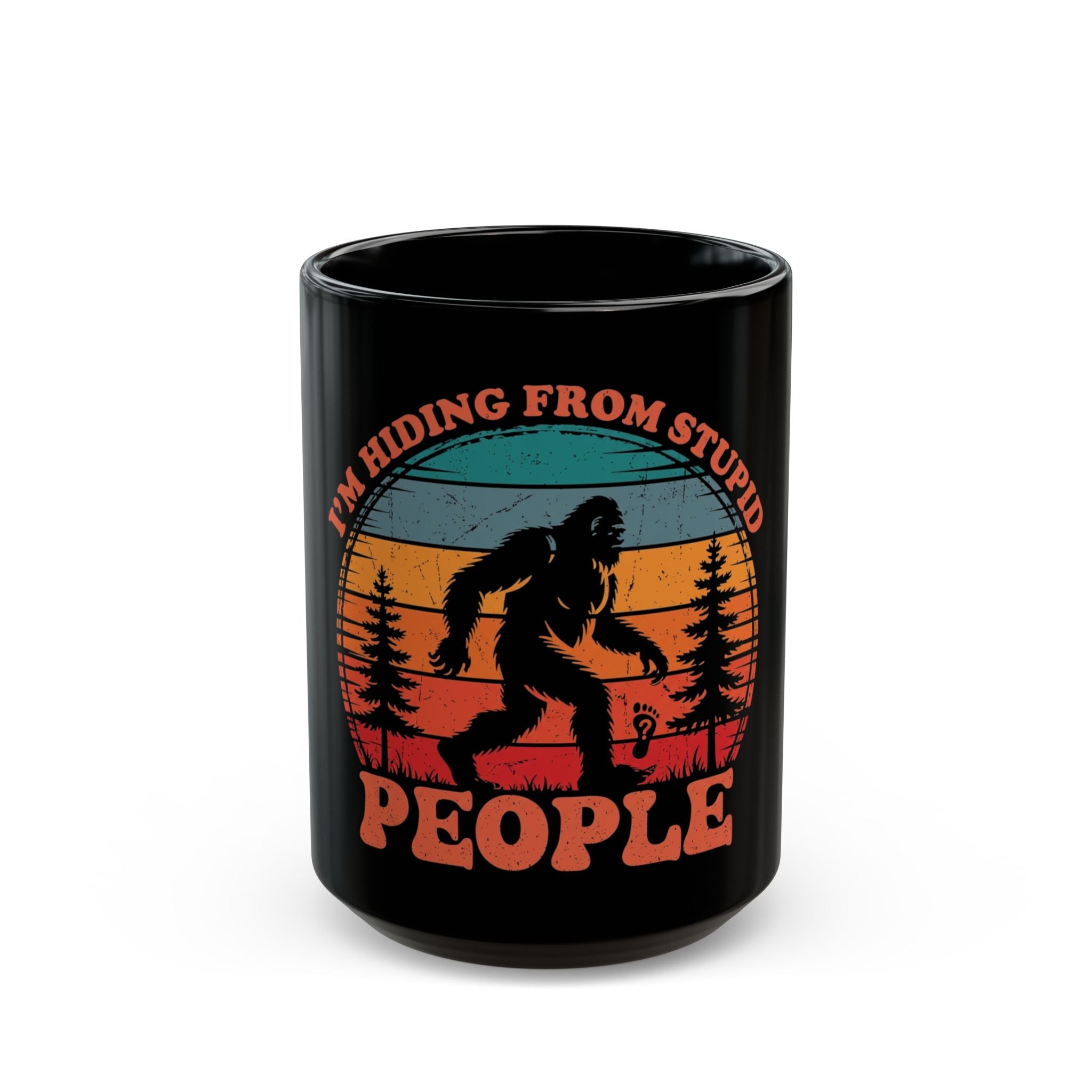 Embrace your inner introvert and love for the outdoors with this funny Bigfoot coffee mug! Featuring a retro vintage sunset, pine tree silhouettes, and a wandering Sasquatch, this black ceramic cup proudly declares, "I'm Hiding From Stupid People."