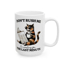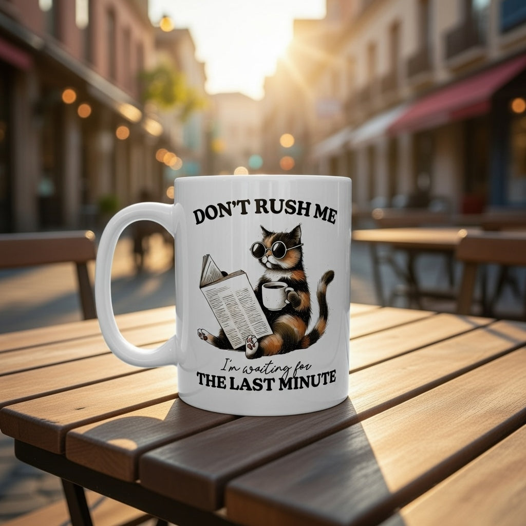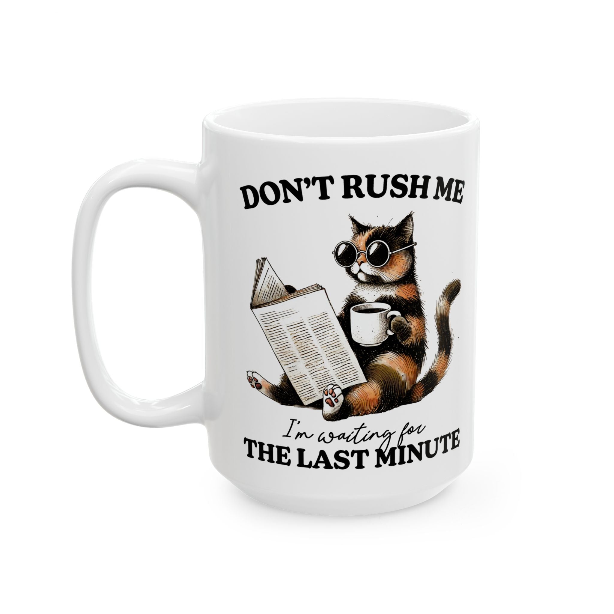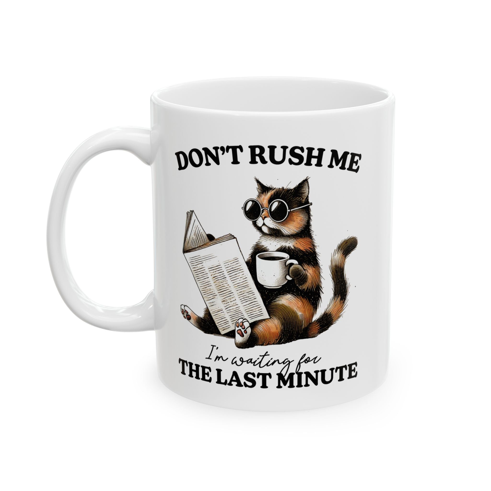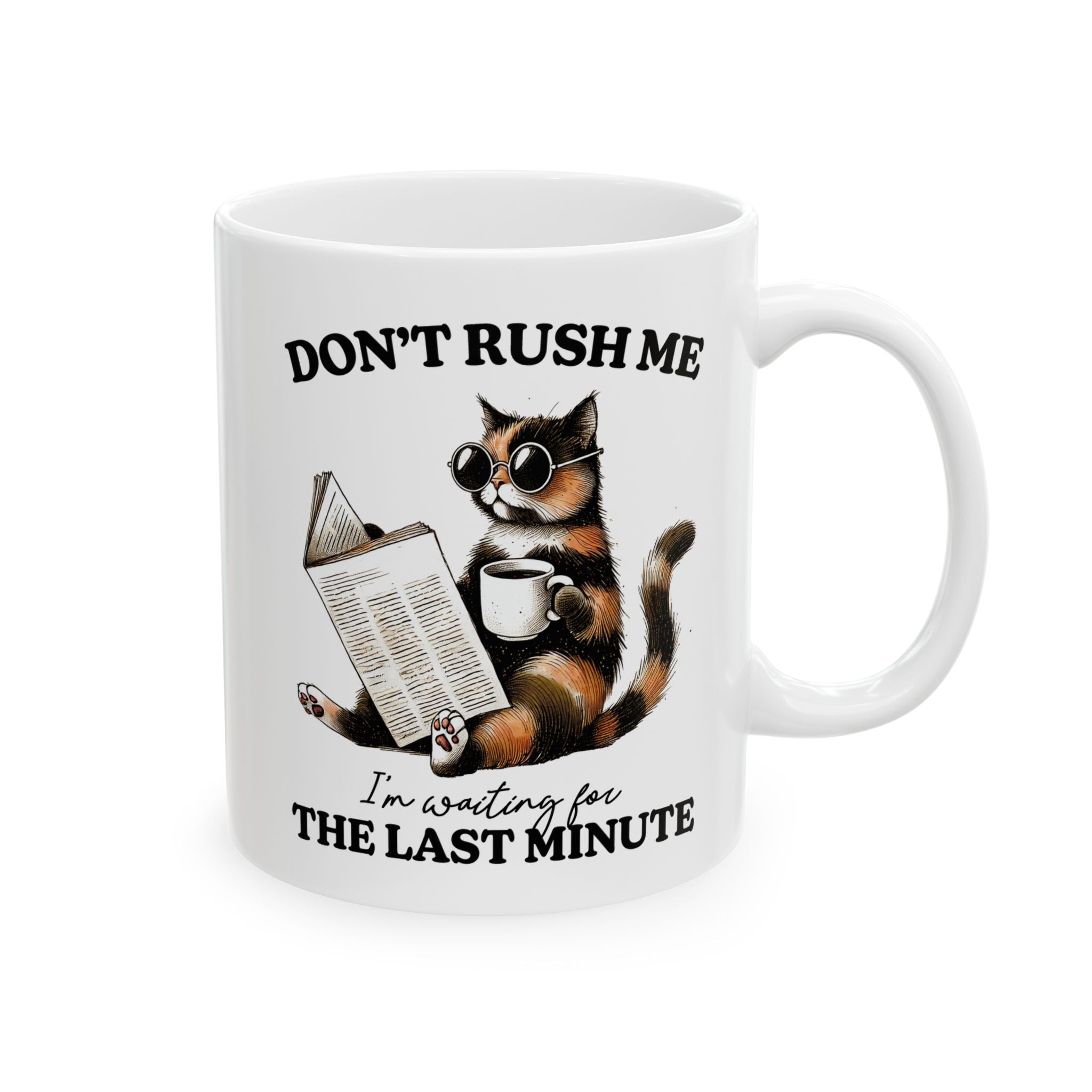 Embrace your inner lazy cat with this hilarious "Don't Rush Me" coffee mug. Featuring a relaxed feline and the relatable slogan "I'm waiting for the last minute," this cup is the purr-fect gift for anyone who operates on their own schedule. Whether you're a cat lover, a master procrastinator, or just hate being hurried, this ceramic mug is sure to bring a smile to your morning routine.