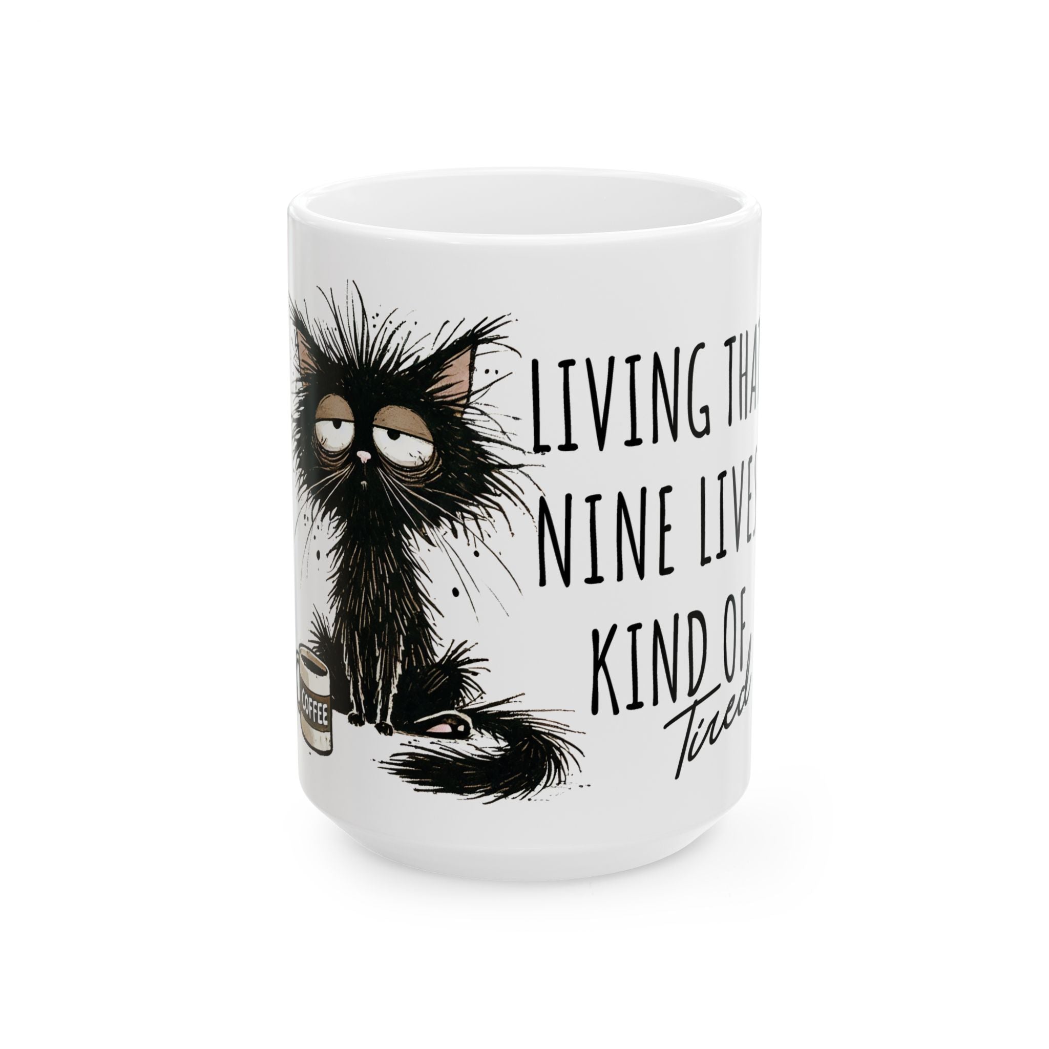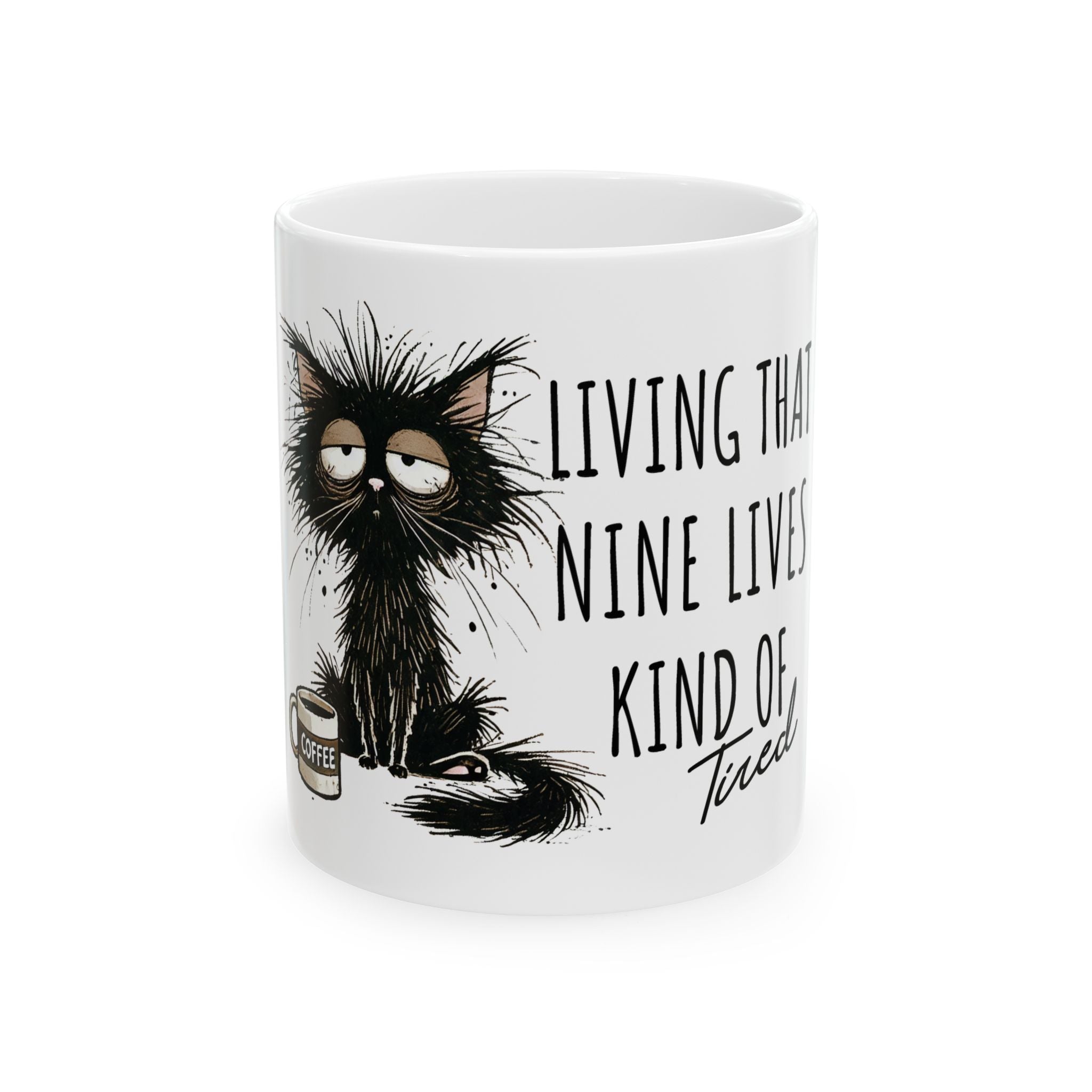 Printify Funny Cat Coffee Mug | Nine Lives Kind of Tired Ceramic Cup