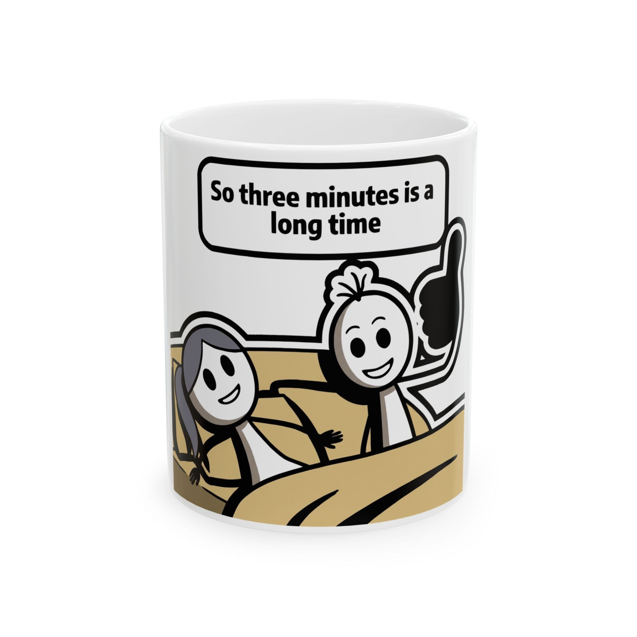 This Ceramic Mug 11oz and Ceramic Mug 15oz series features a clever comic strip of a couple in bed, capturing that moment where three minutes feels like an eternity. It is a durable piece of drinkware made from high-quality white ceramic with a glossy finish. The ergonomic C-handle ensures a comfortable grip, while the lead and BPA-free construction lets you focus on the punchline.