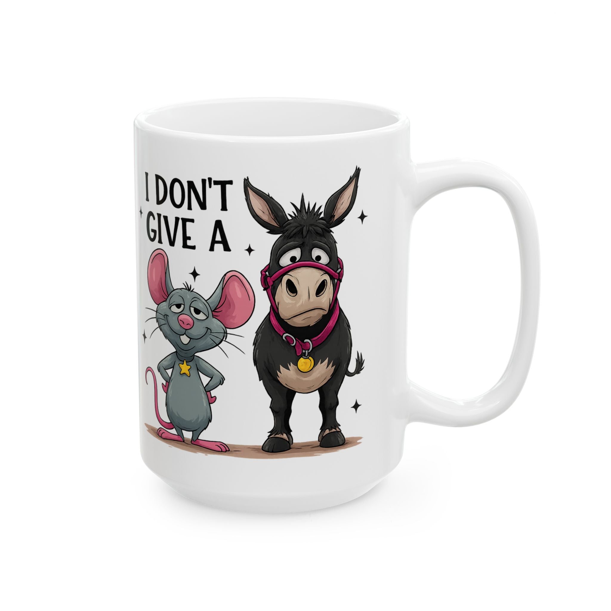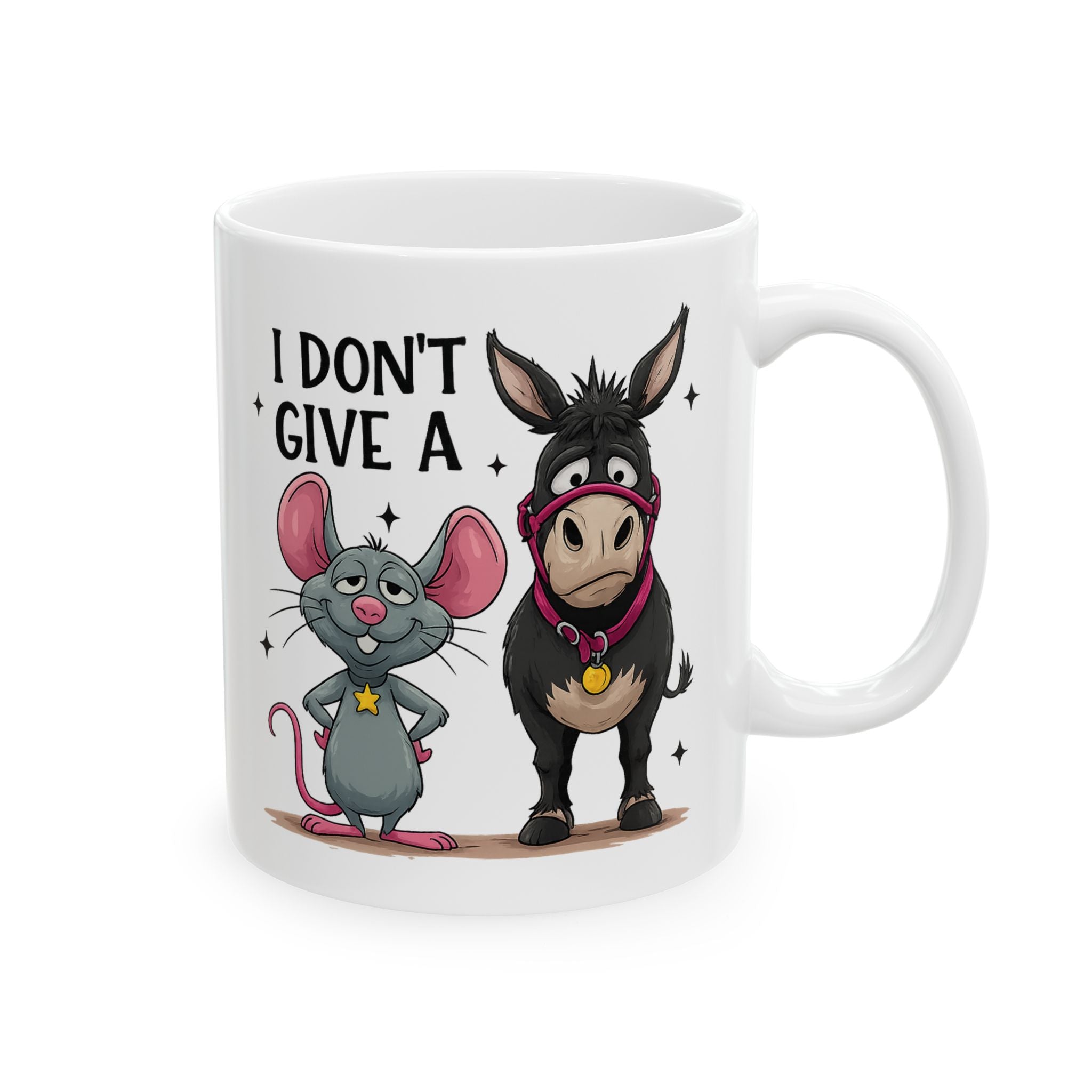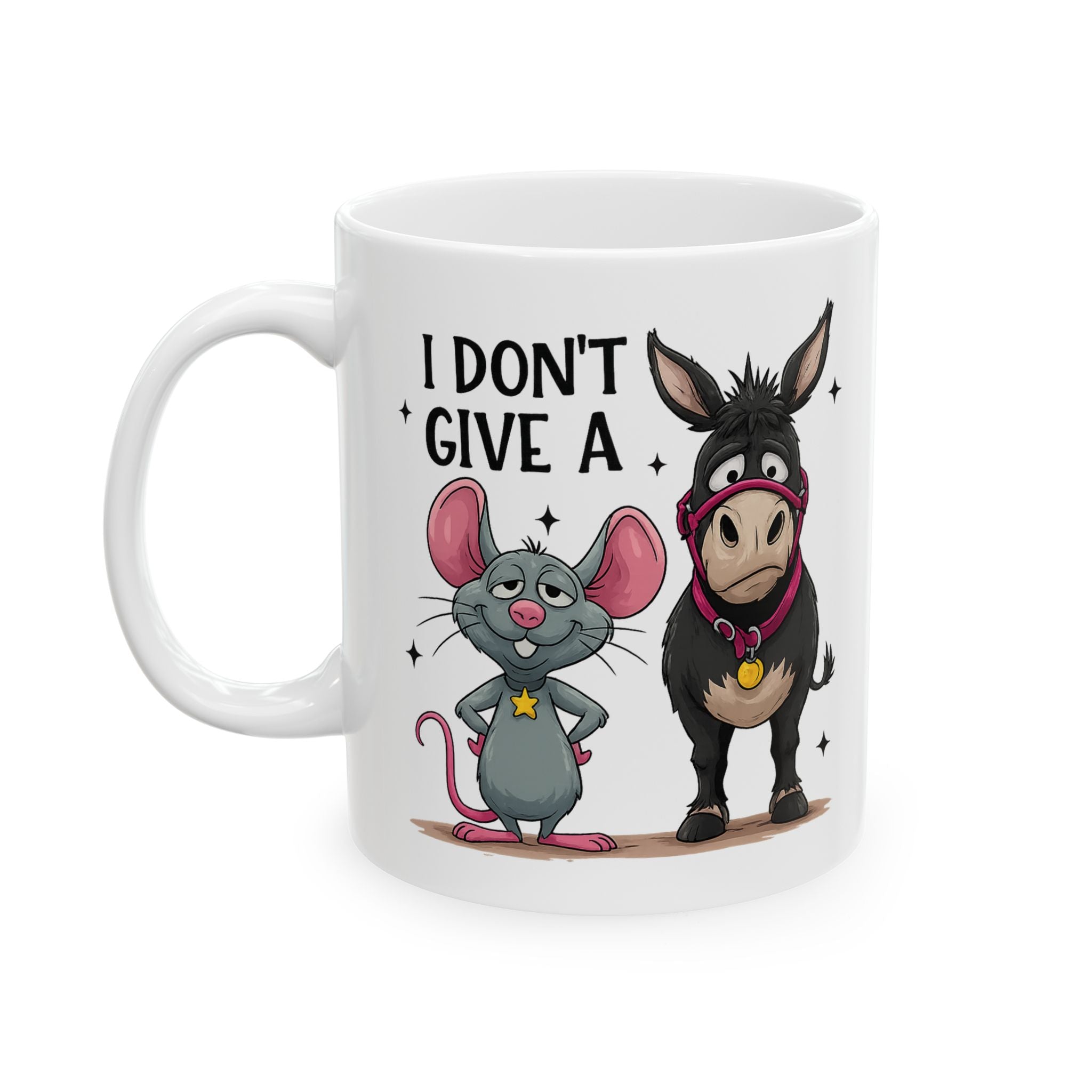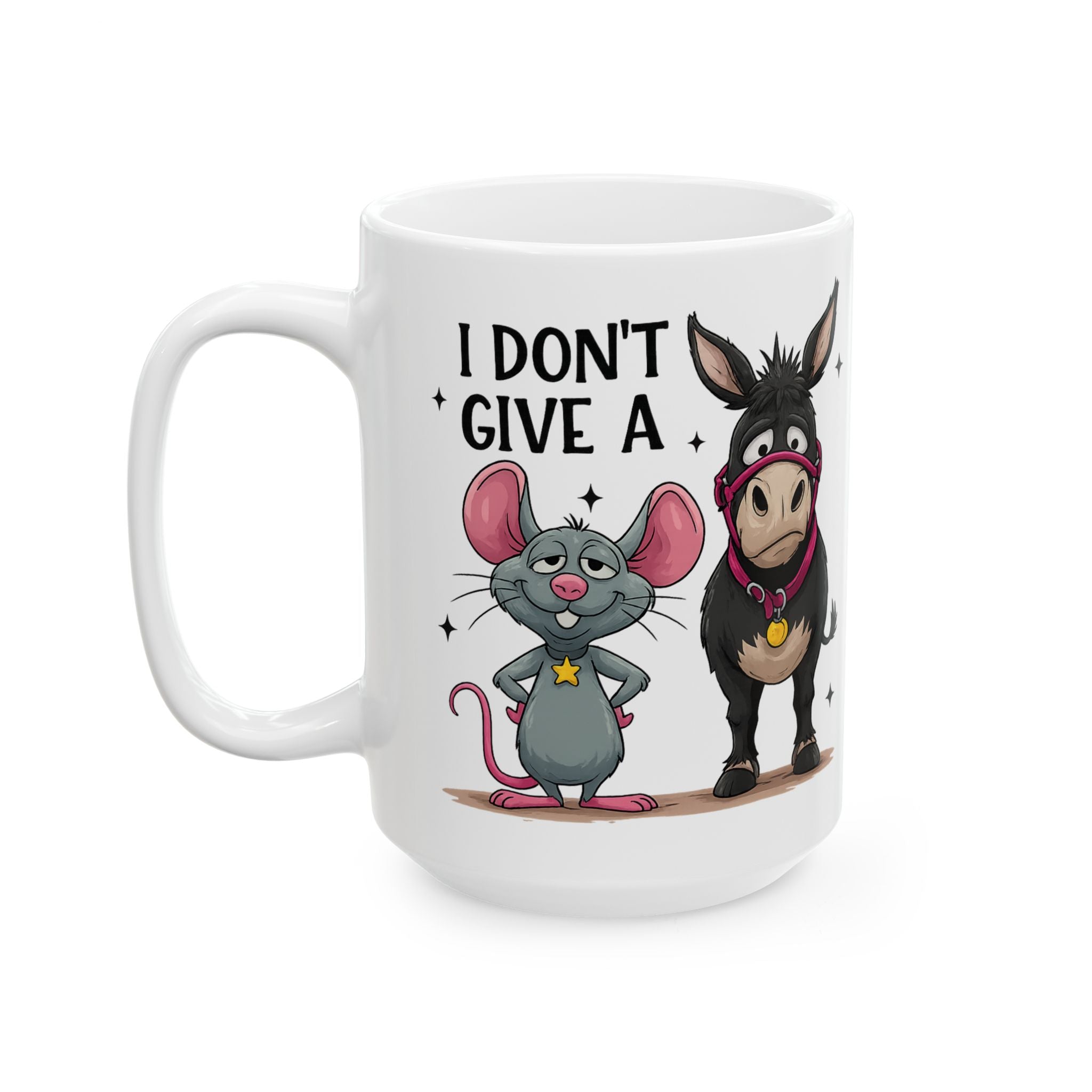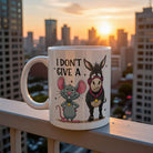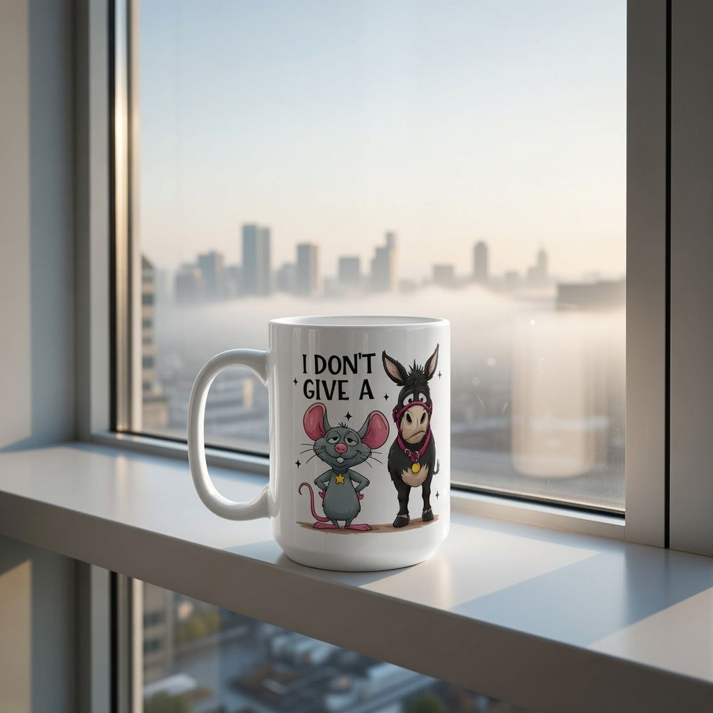 Start your morning with a kick of sarcasm using this hilarious "I Don't Give A Hoof" coffee mug. Featuring a stubborn donkey and his sidekick mouse, this cup is the perfect way to silently express your mood at the office or at home. Whether you're a farm animal lover or just appreciate a good pun, this quality ceramic mug makes a fantastic gift for friends, family, or coworkers who love a laugh.