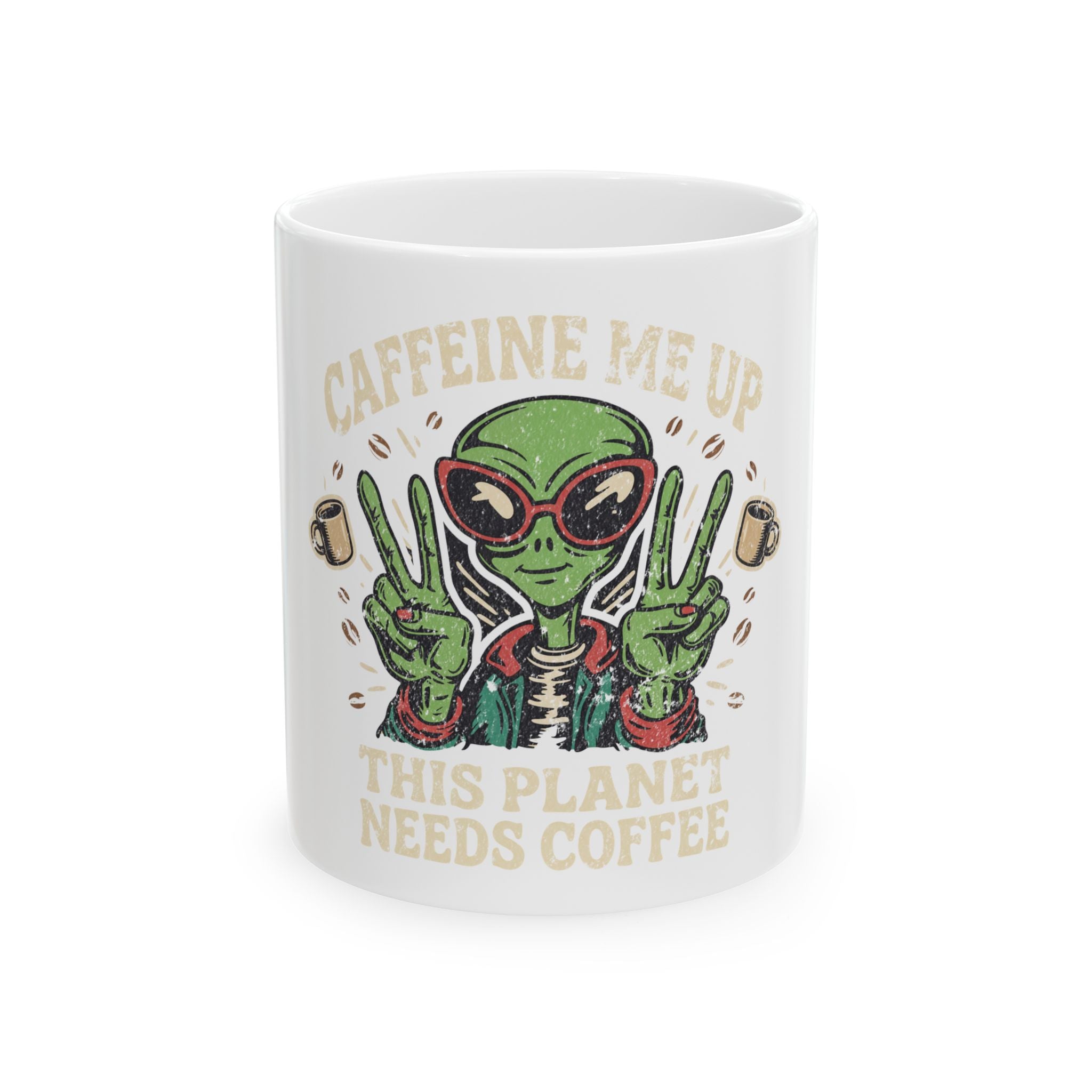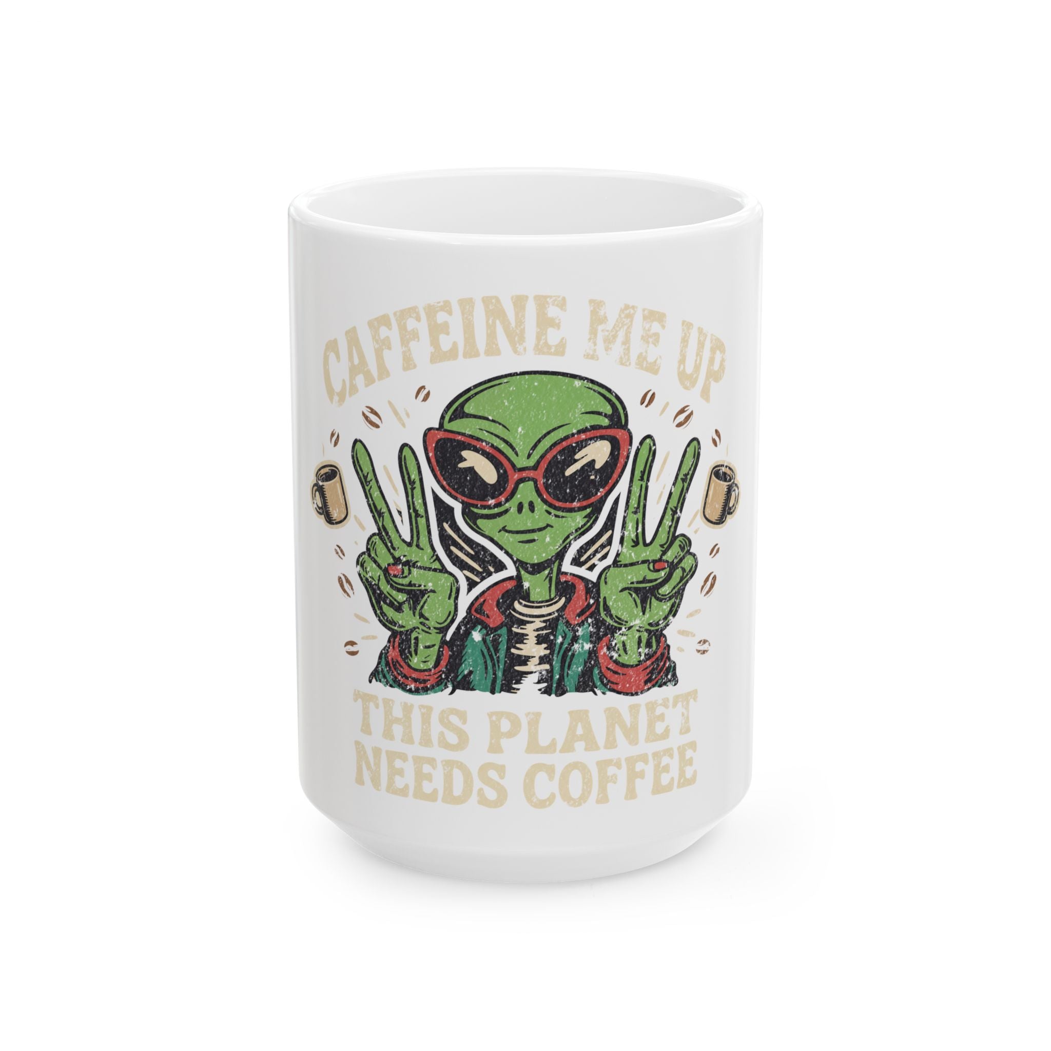 Alien Coffee Mug — “Caffeine Me Up / This Planet Needs Coffee” Ceramic Mug (11oz & 15oz)