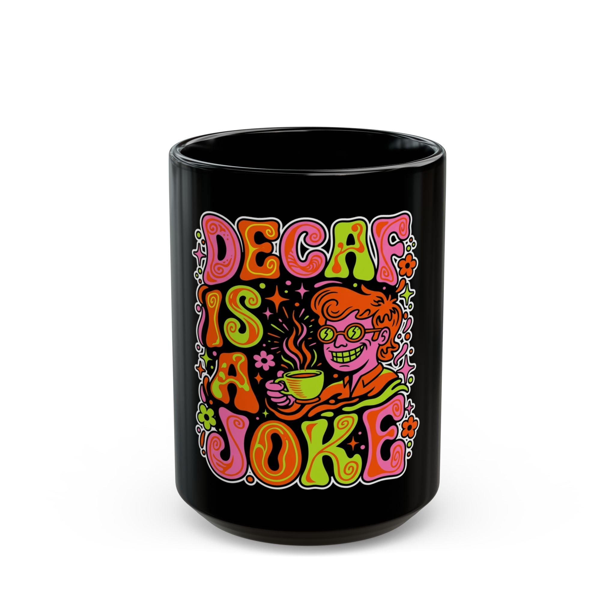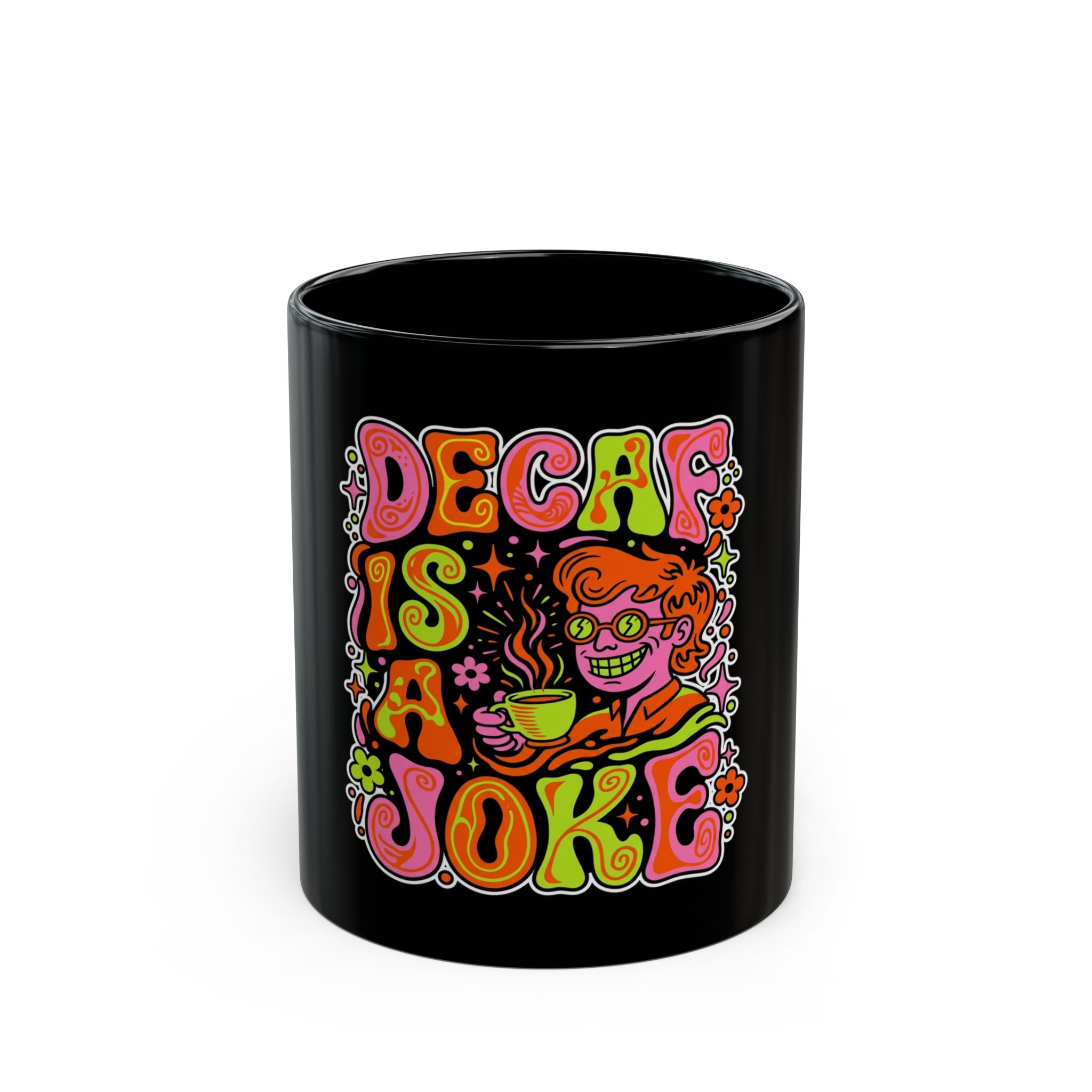 Black Mug — "Decaf Is a Joke" Retro Psychedelic Coffee Mug