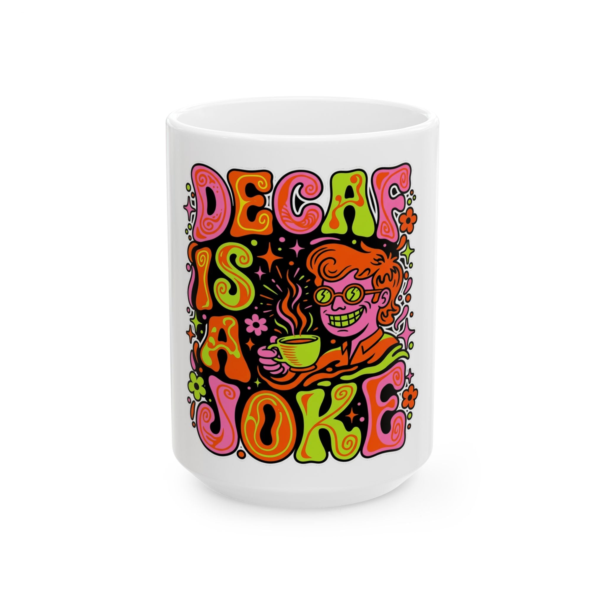 Ceramic Mug — "Decaf Is a Joke" Retro Psychedelic Coffee Mug