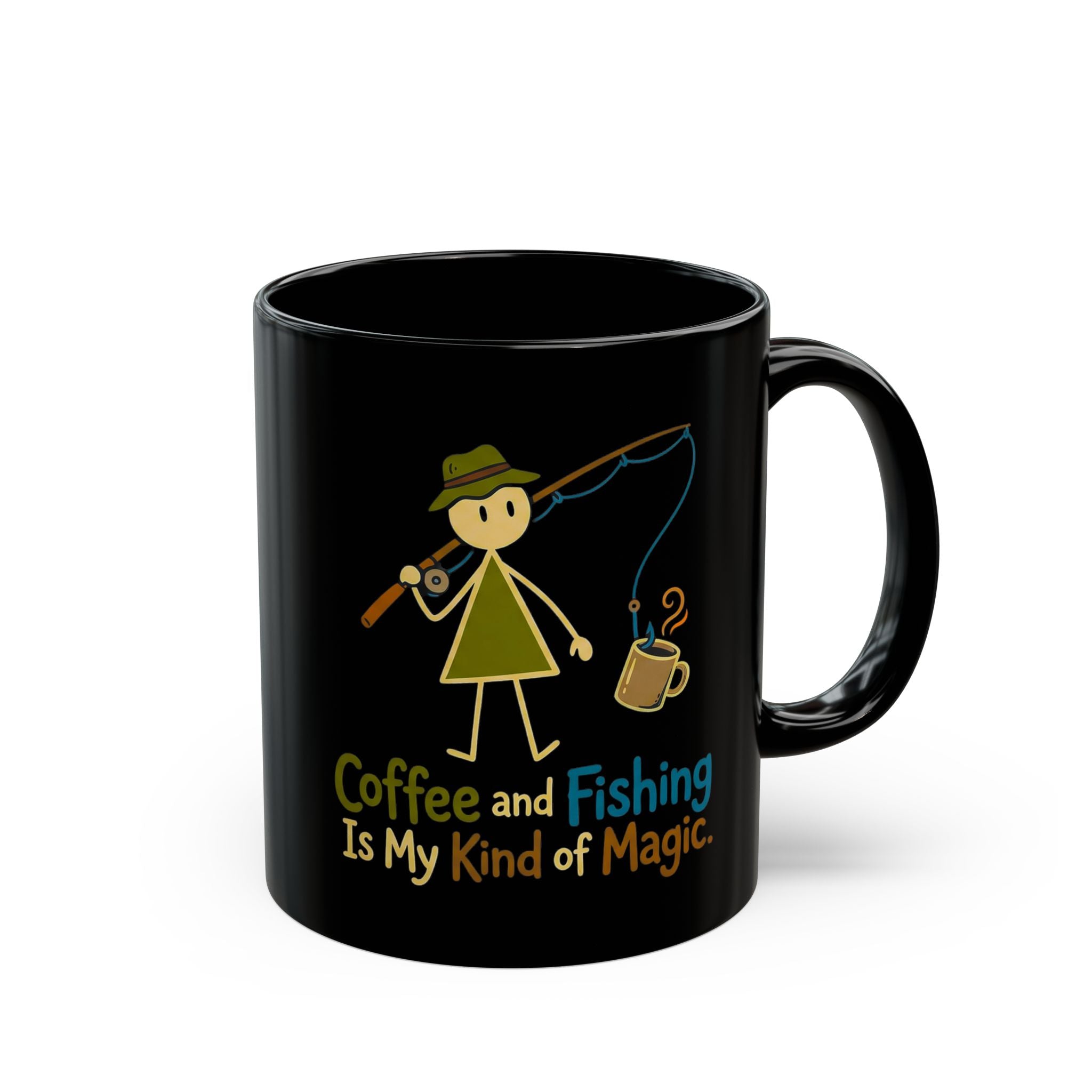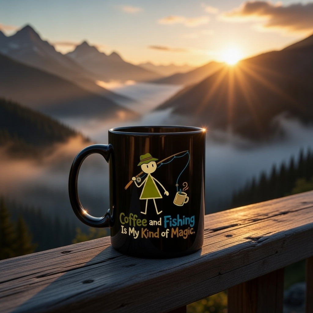 Combine your two favorite pastimes with this "Coffee and Fishing Is My Kind of Magic" premium black ceramic mug. Designed for anglers, outdoor enthusiasts, and caffeine lovers, this mug features a whimsical graphic that captures the simple joy of a morning brew and a day on the water.