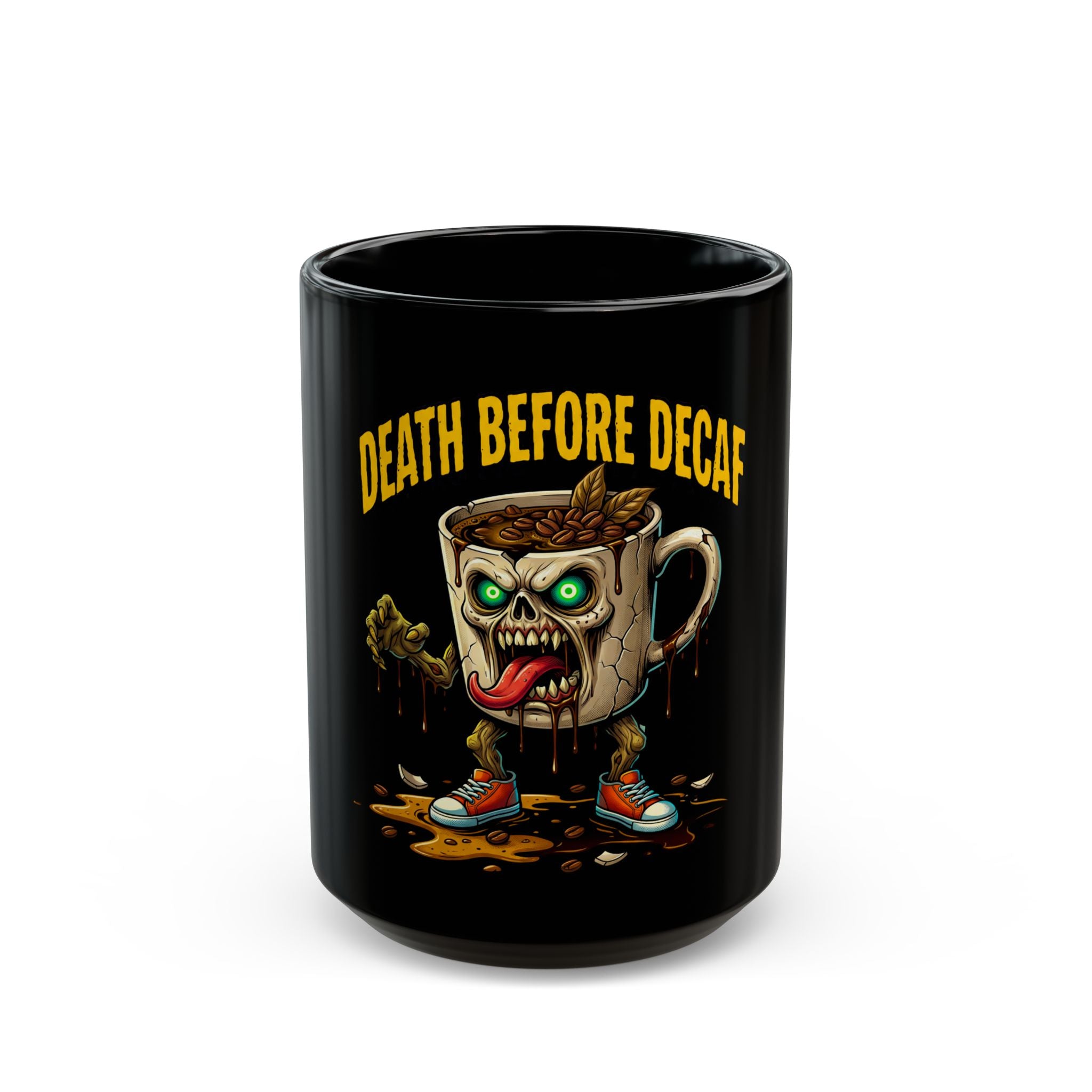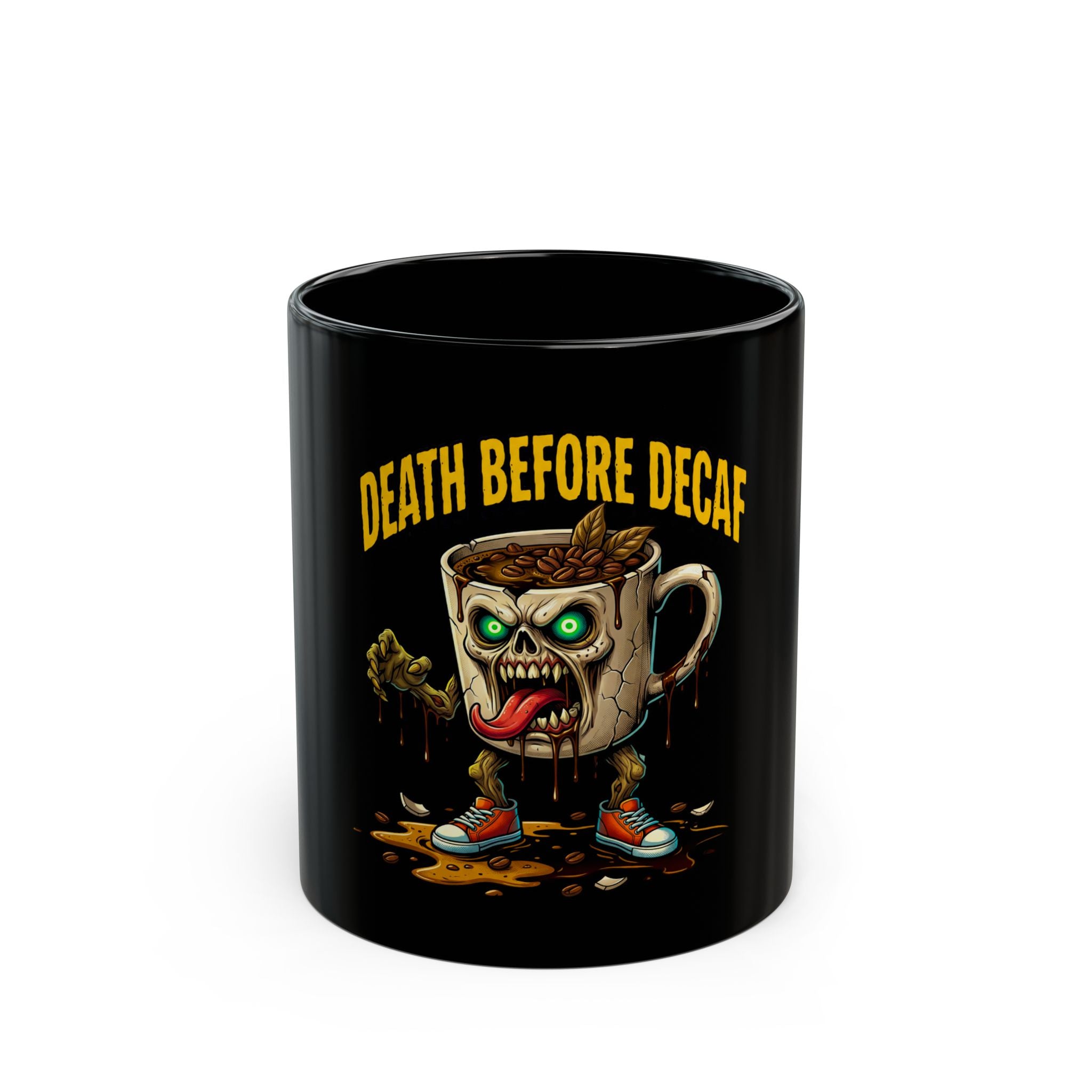 Death Before Decaf Black Mug — Funny Zombie Coffee Cup for Caffeine Lovers