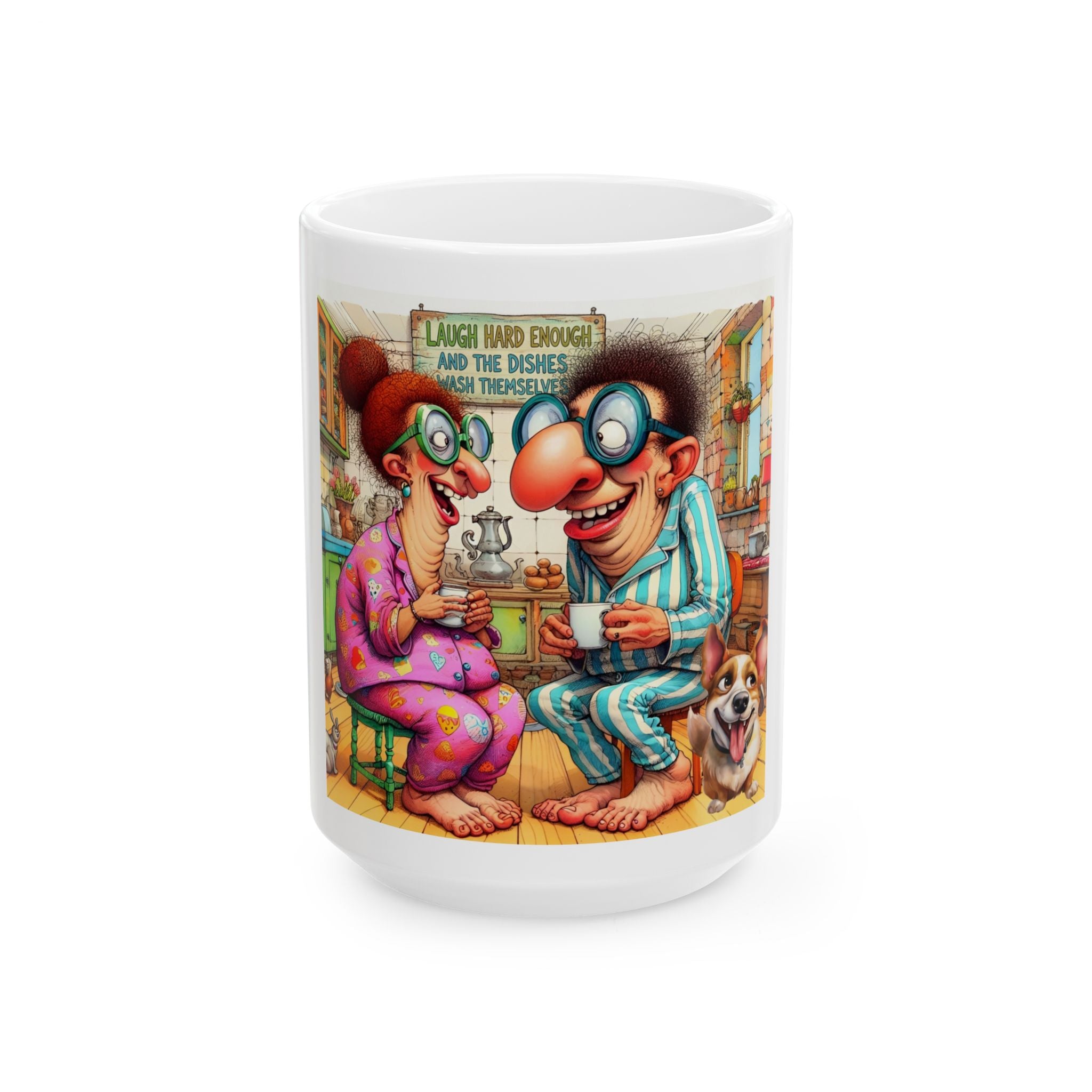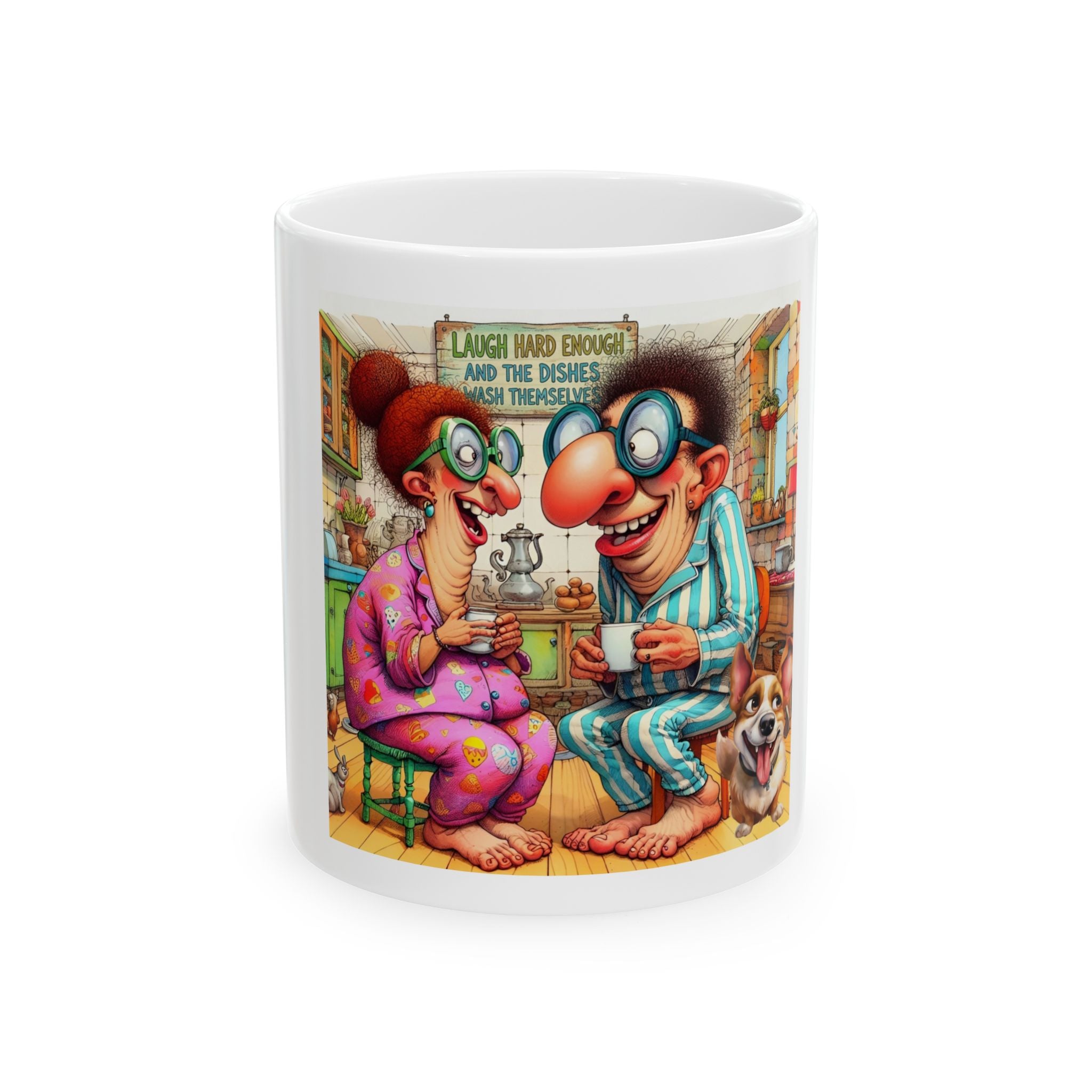 Warm, playful, and bright, this glossy white ceramic mug makes a fantastic retirement gift, an anniversary present for grandparents, or a fun gag gift for your favorite longtime couple. Lightweight enough for daily use, its vibrant print keeps the scene lively while the shiny finish makes the colors pop. It’s the perfect companion for slow mornings, pajama chats, and enjoying the simple rituals of home.