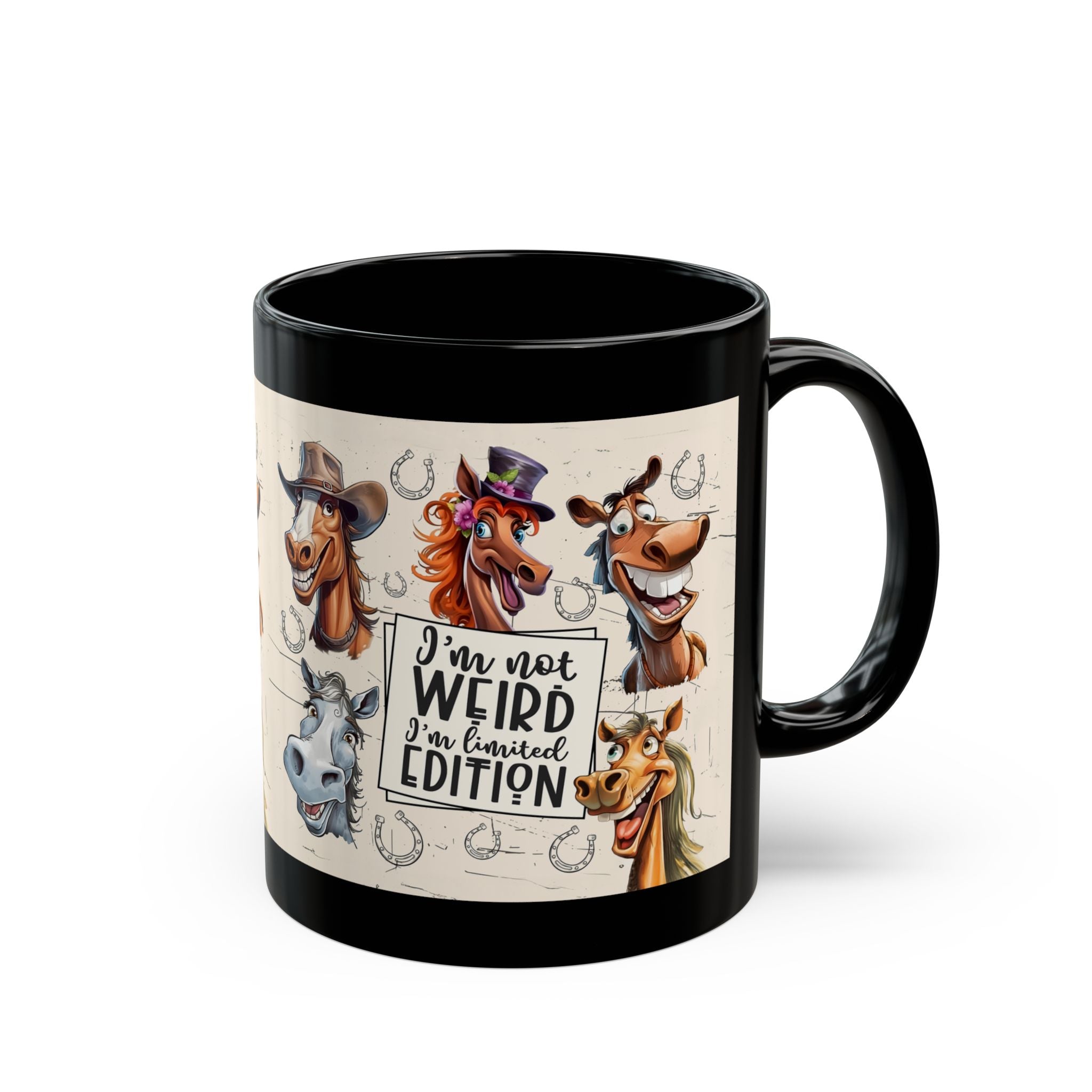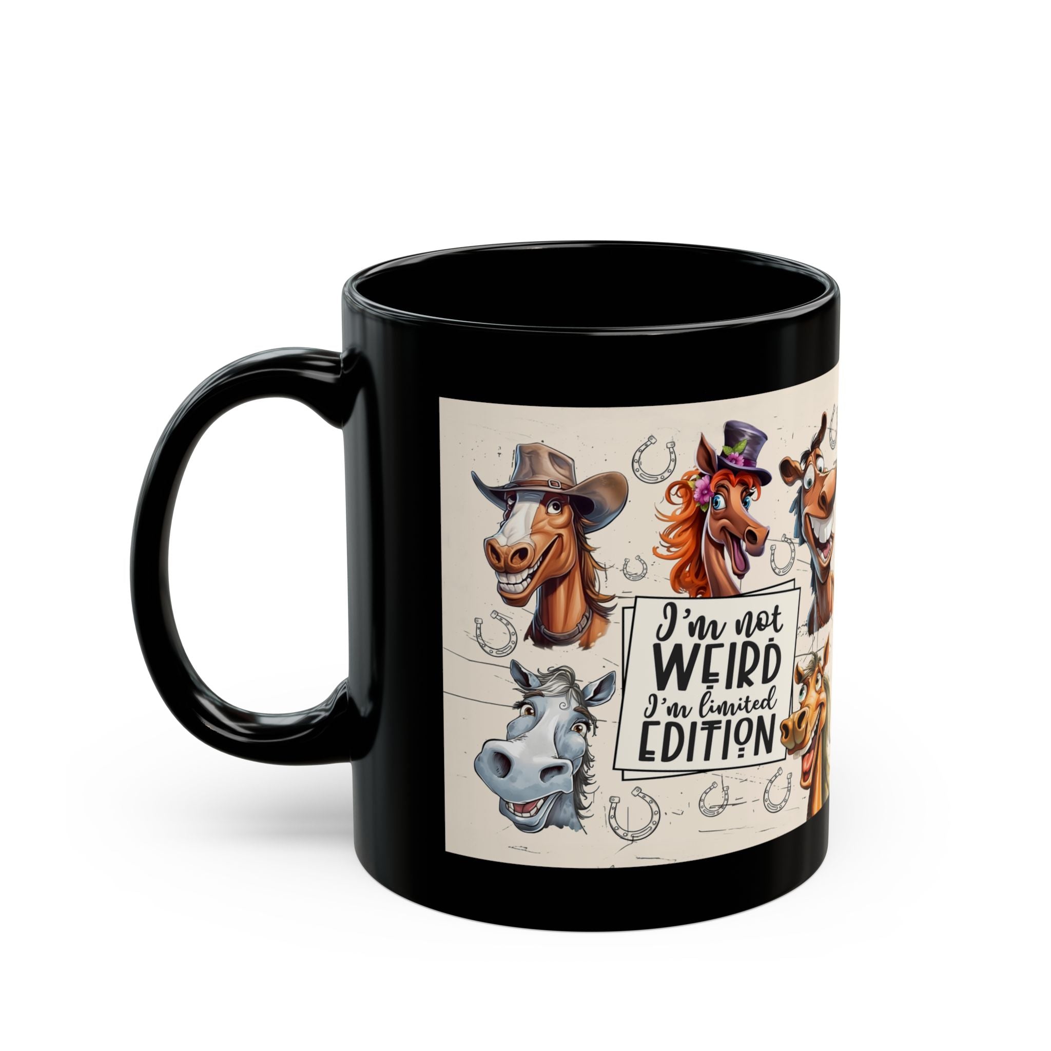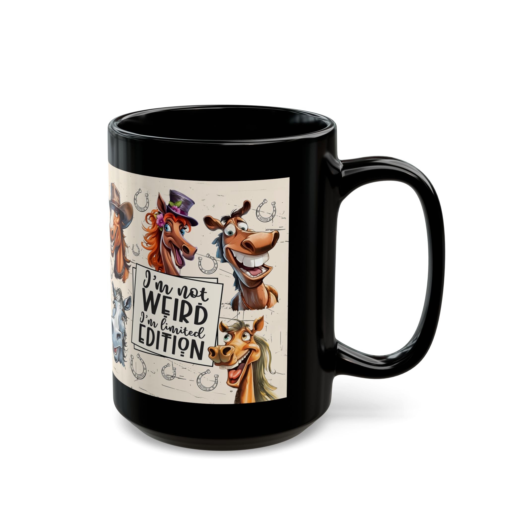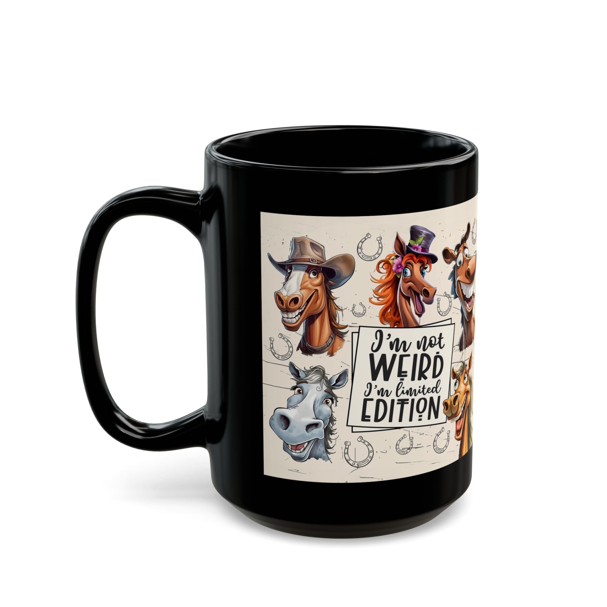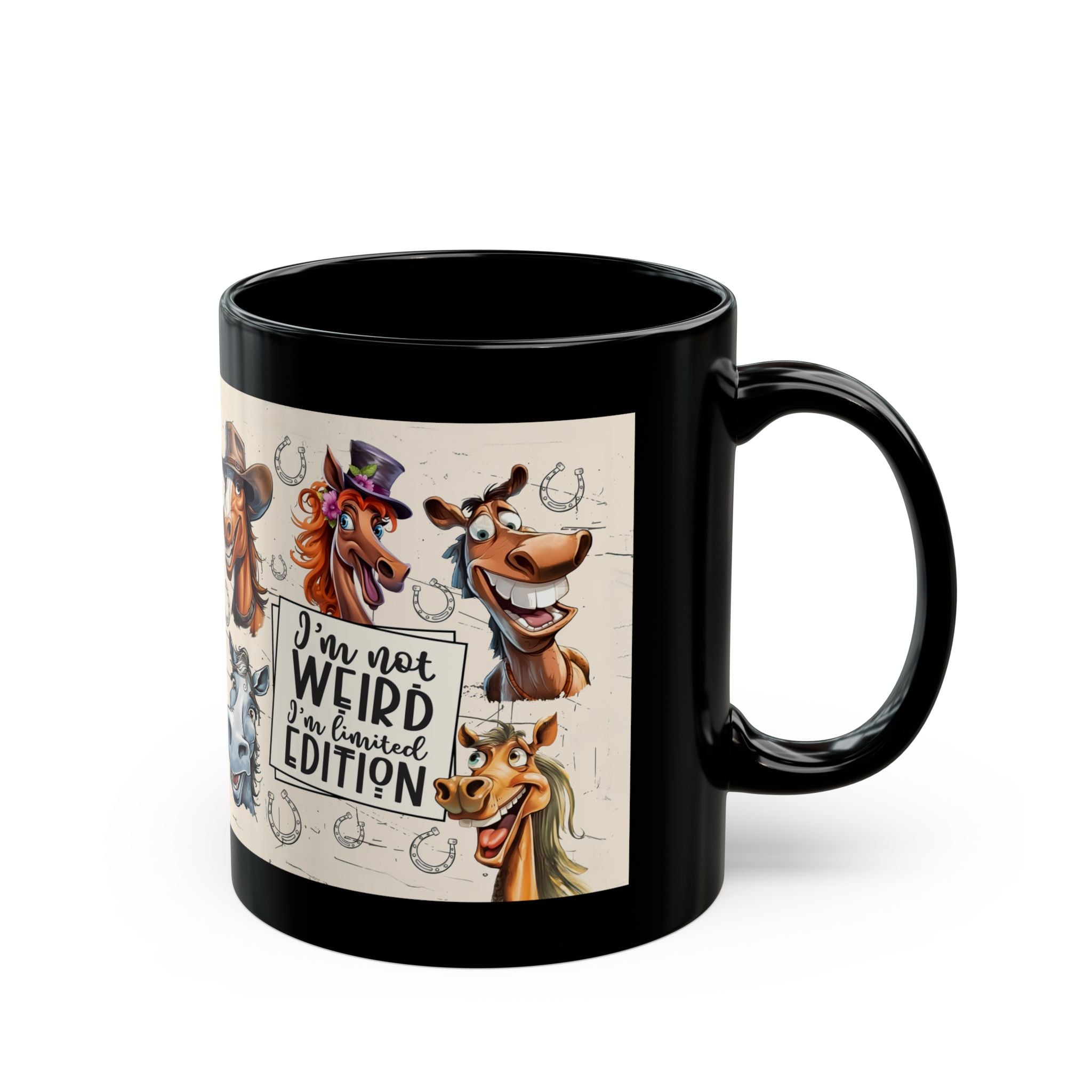 This Im Not Weird Mug is the perfect Horse Lover Gift, designed to bring personality to your coffee break. Crafted from 100% durable black ceramic, it features the playful quote, "I'm Not Weird, I'm Limited Edition," rendered in vibrant colors that pop against the dark, high-end finish.