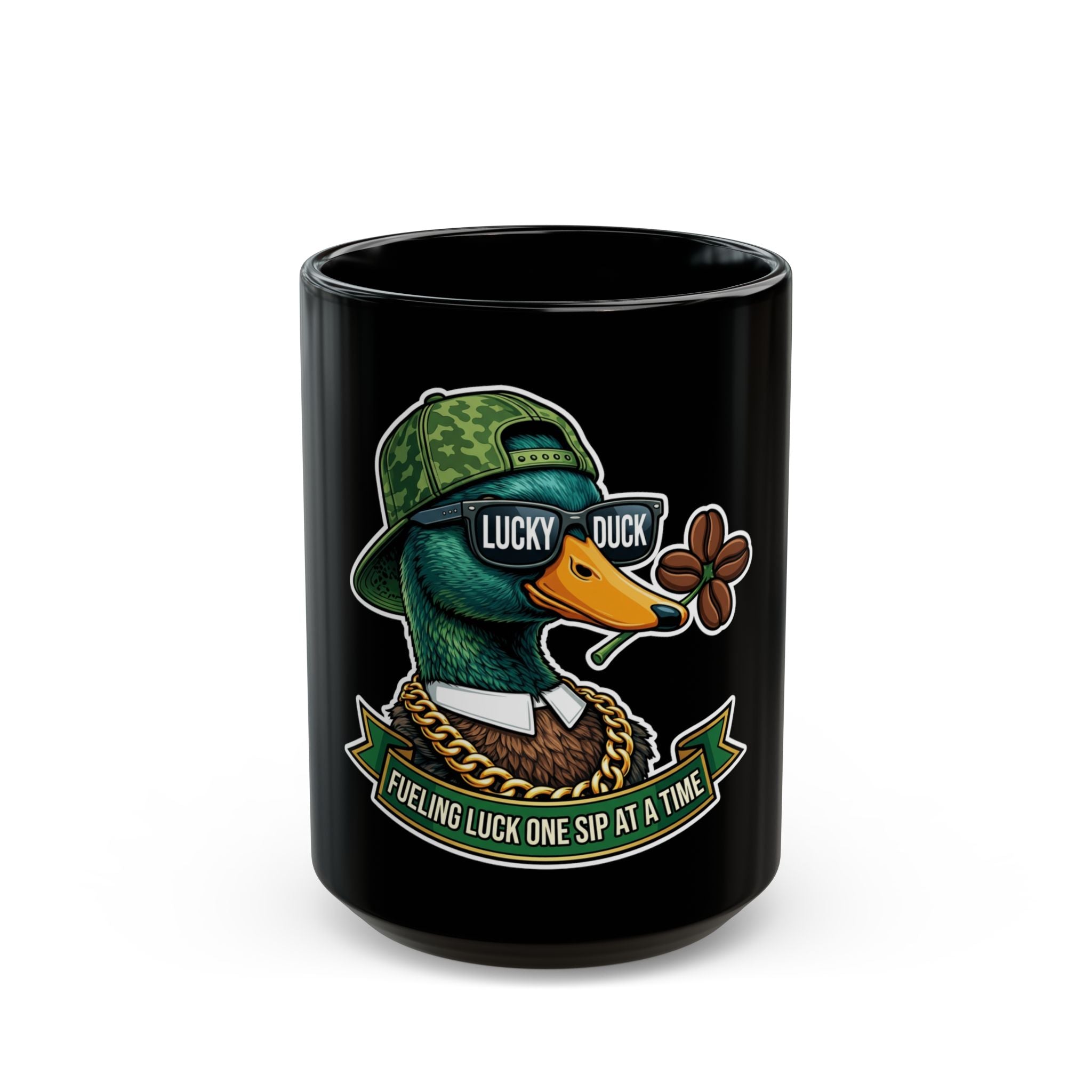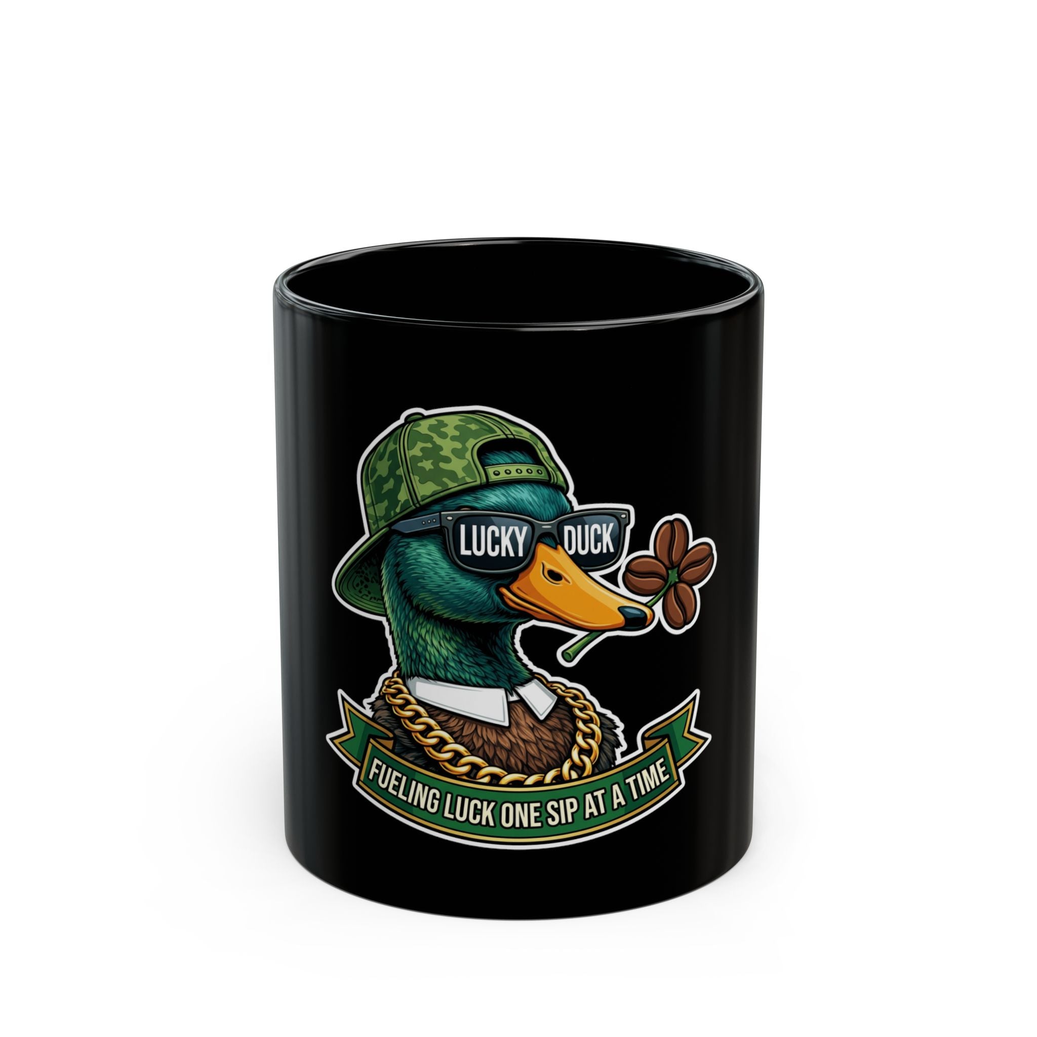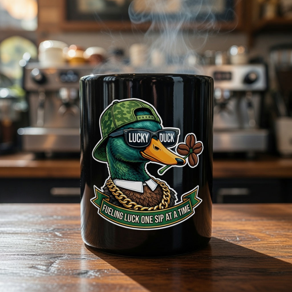 Slide into your morning routine with a bit of swagger and a whole lot of luck. Featuring a playful, streetwise duck rocking a camo cap, gold chain, and "Lucky Duck" sunglasses alongside a jaunty four-leaf clover, this sleek black ceramic coffee mug is the perfect companion for St. Patrick's Day and beyond.
