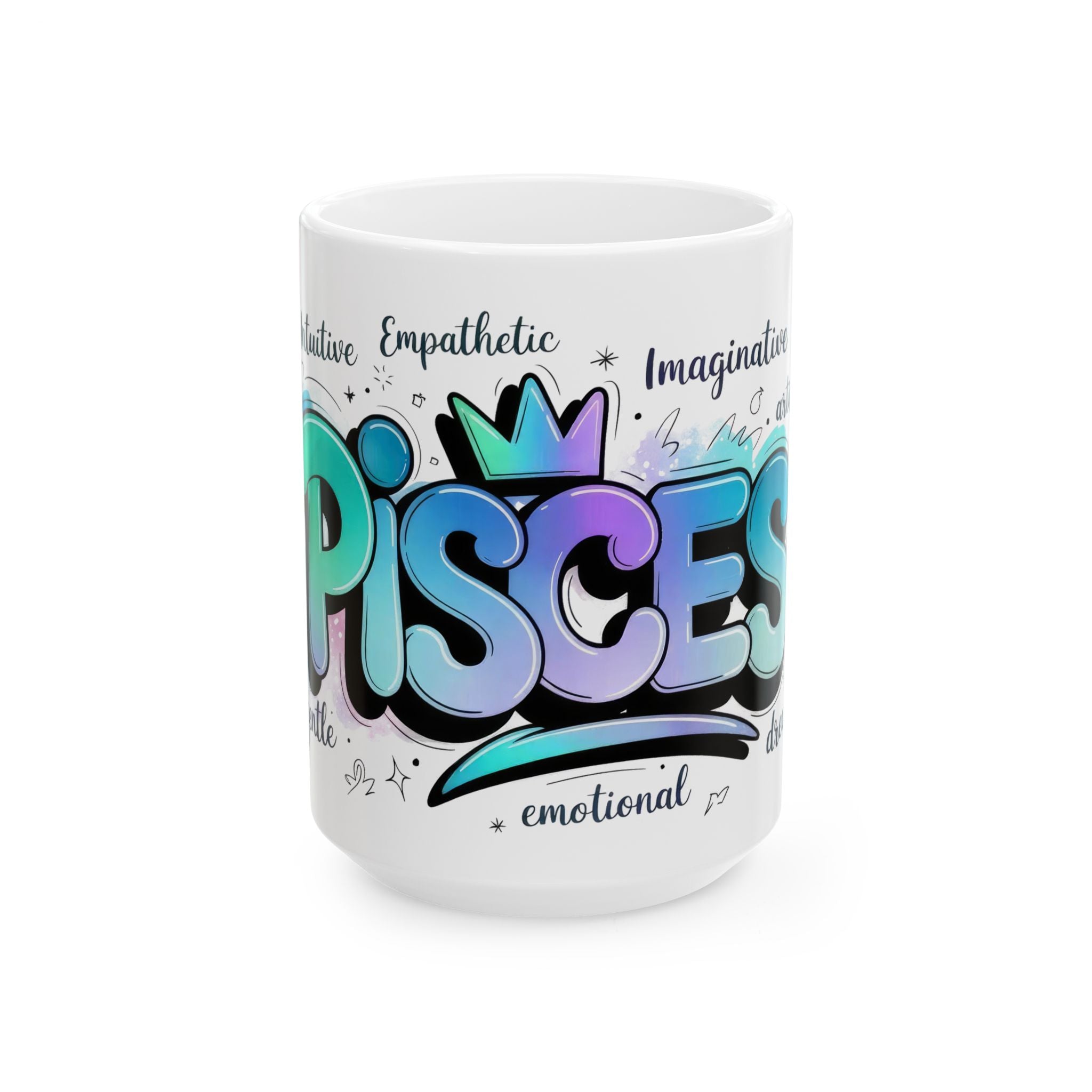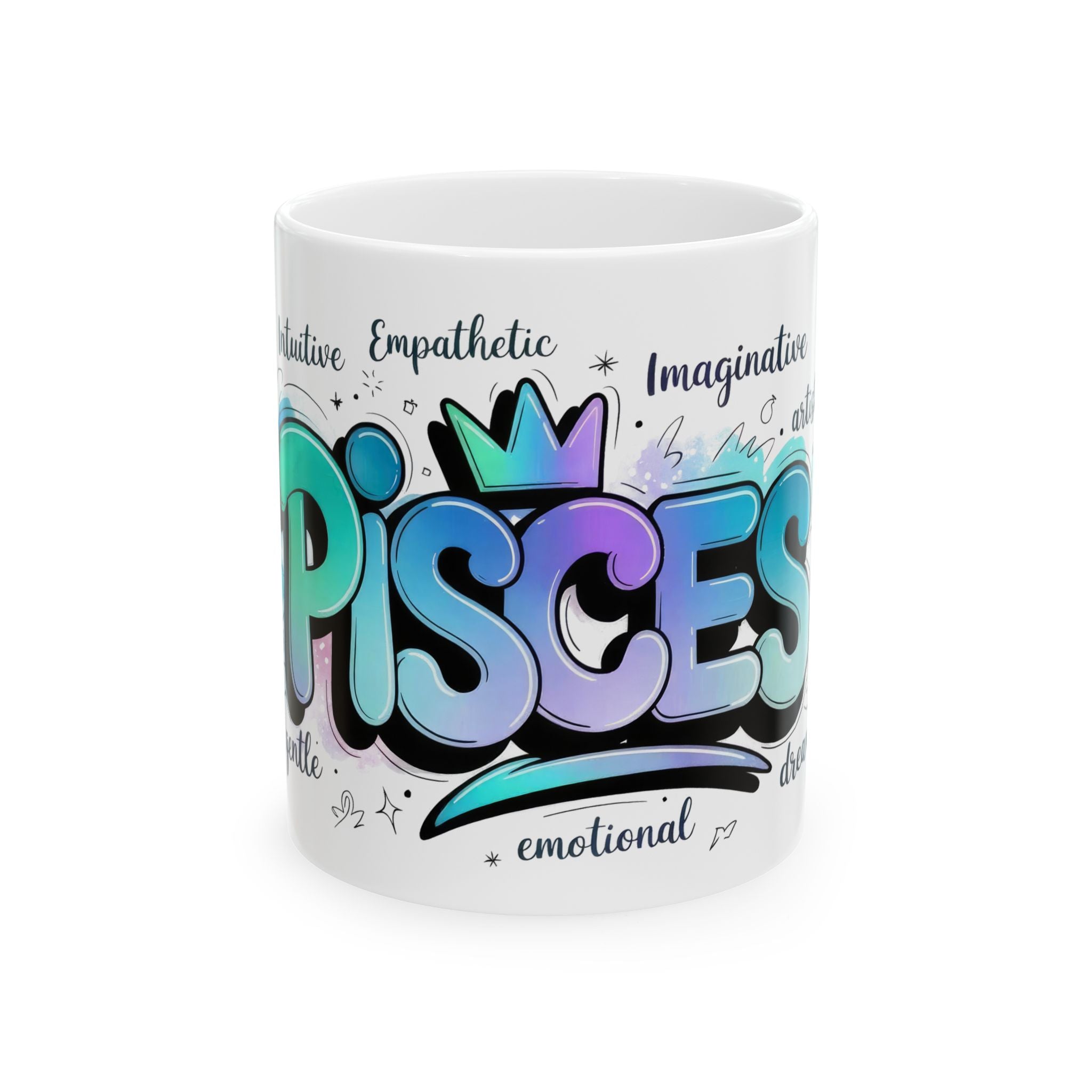 Sip from a mug that feels personally made for dreamers and deep-feel thinkers. This glossy ceramic mug wraps a bold, hand-lettered Pisces design in ocean-gradient blues and purples, surrounded by tiny affirming words that nod to empathy, imagination, and sensitivity. It sits warm and weighty in your hands, holding morning coffee or midnight tea while you plan, ponder, or simply breathe. The vibrant print pops against the white ceramic, a little daily reminder of who you are and the quiet strengths you bring to the world.