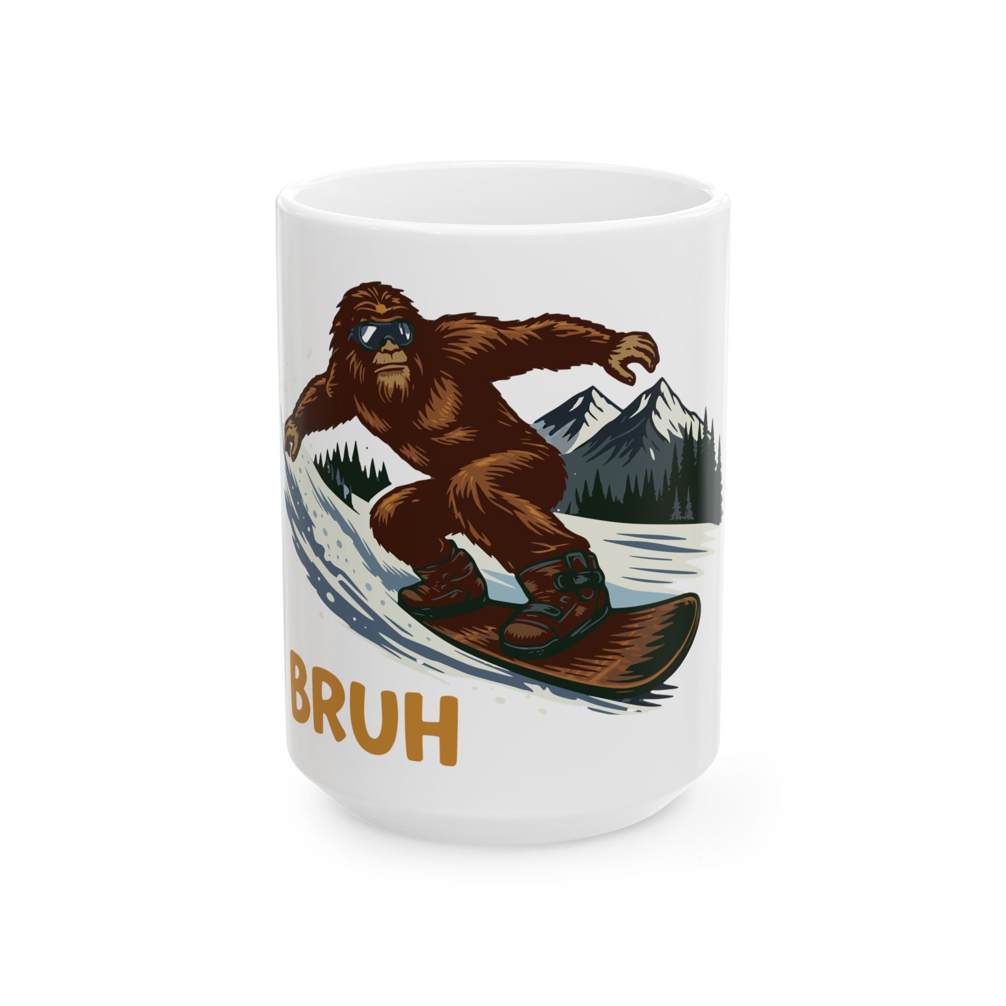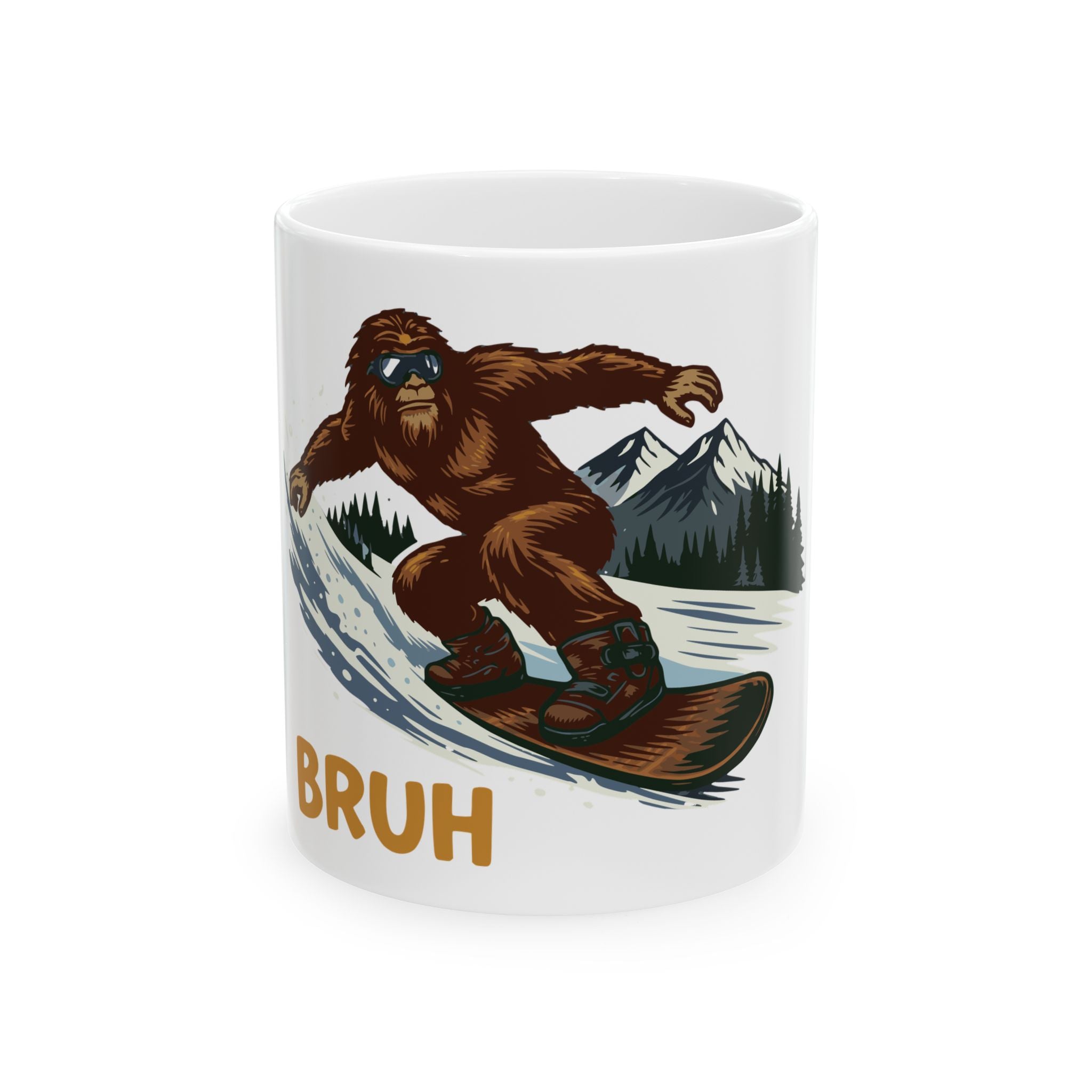 There’s a slow, cold morning at the cabin. Steam rises from your mug and the pines are dusted in fresh powder. On the side, a grinning Sasquatch carves a slope and launches off a jump while a bold "Bruh" cracks the scene—funny, a little rebellious, and unmistakably winter. This ceramic mug brings that cabin-at-sunrise energy to your coffee, cocoa, or post-run hot chocolate. It feels like trading ski-lift lines for a secret run, laughing with friends between laps, and warming frozen fingers with something that actually gets the vibe. Bright, glossy artwork pops against the white ceramic, and the sturdy C-handle makes it easy to cradle on frosty mornings. Use it on slow weekends, after a day on the mountain, or while plotting the next snow day—this mug speaks the language of people who love cold air, hot drinks, and a little outdoorsy humor.