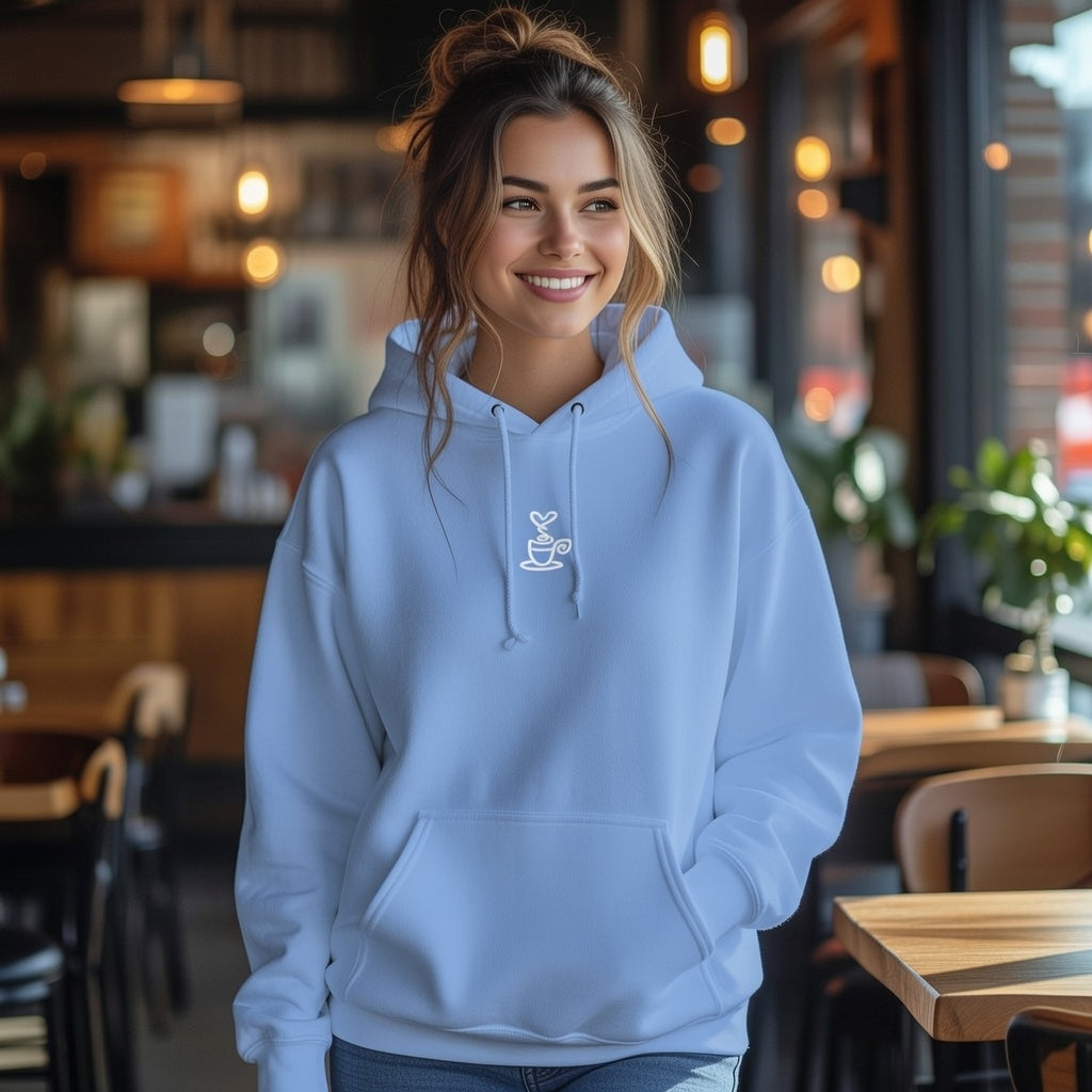 Start your morning with a smile. The Coffee Love Hoodie features a playful, hand-drawn graphic of a smiling coffee cup, screen-printed directly onto our softest fleece.