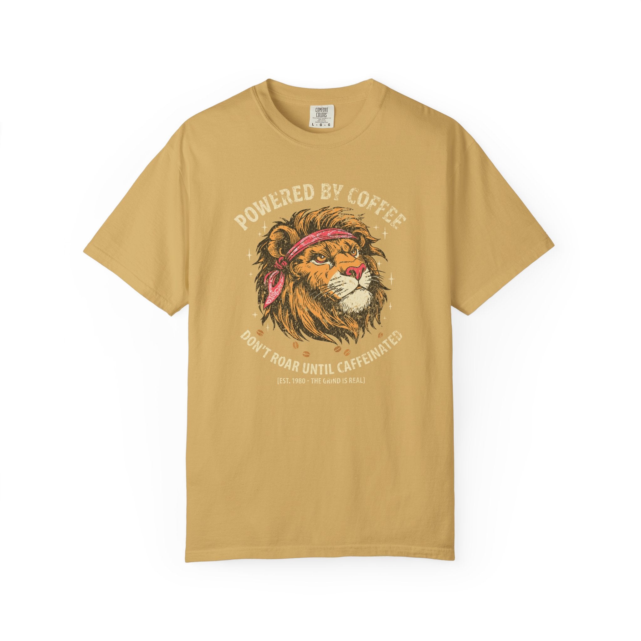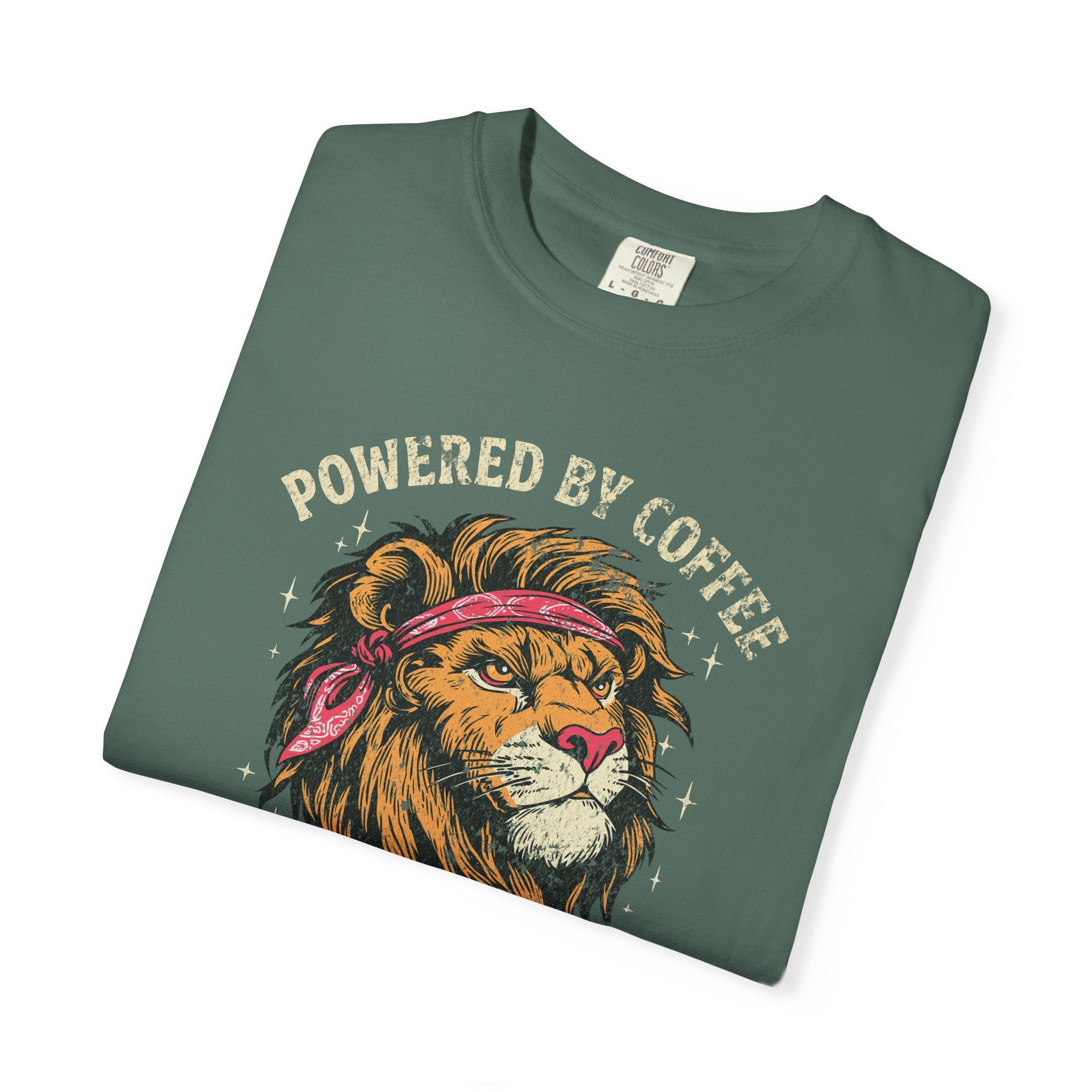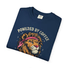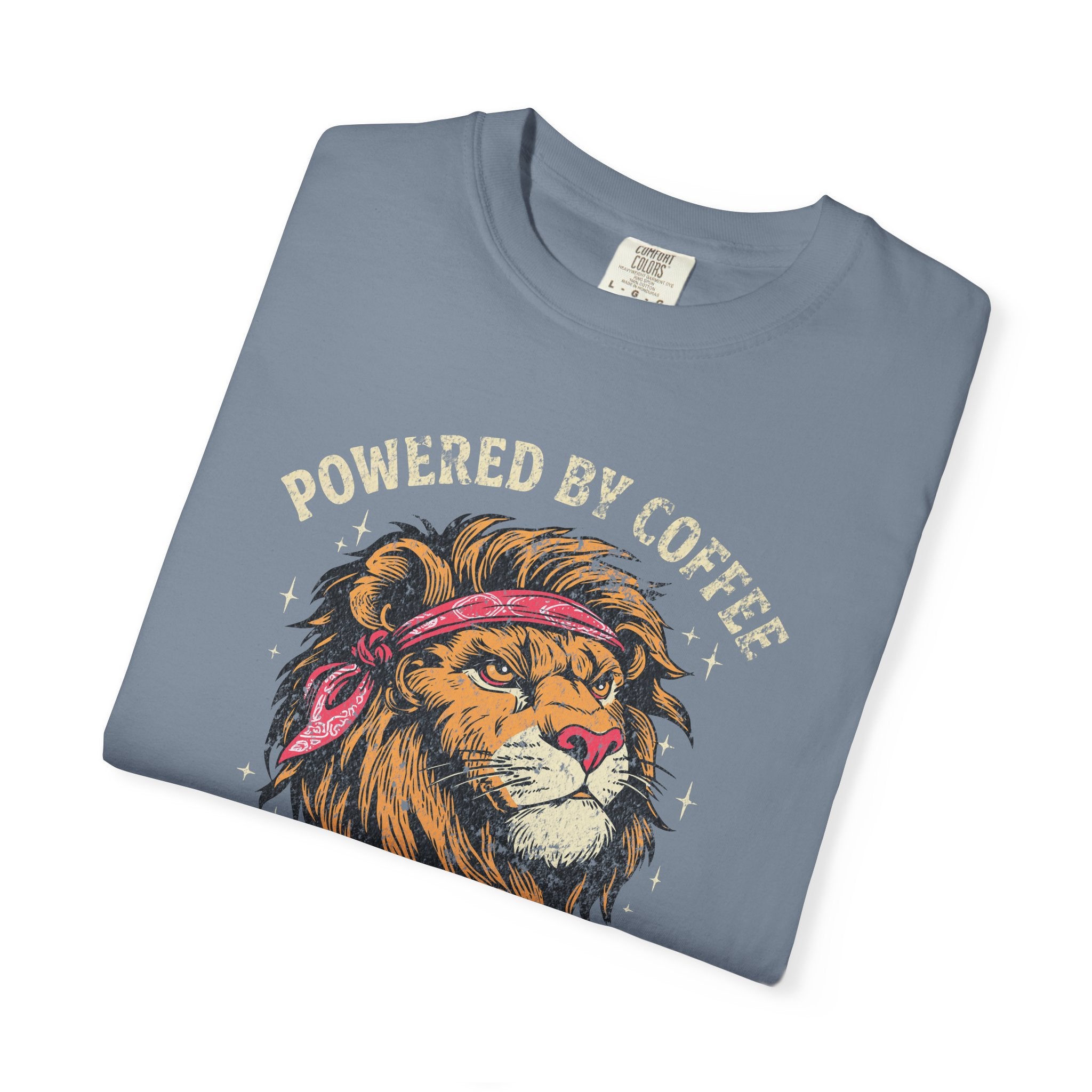 Distressed Print Powered by Coffee Lion T-Shirt — Don't Roar Until Caffeinated Graphic Tee