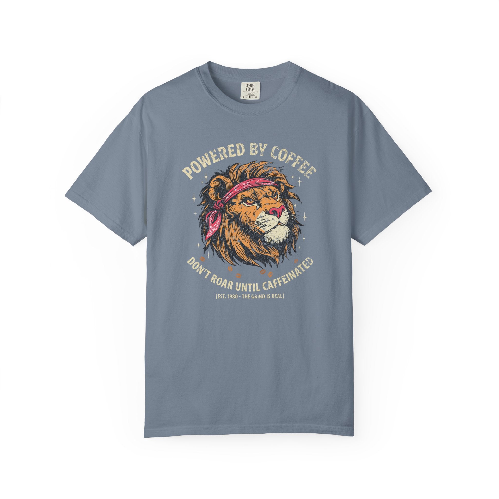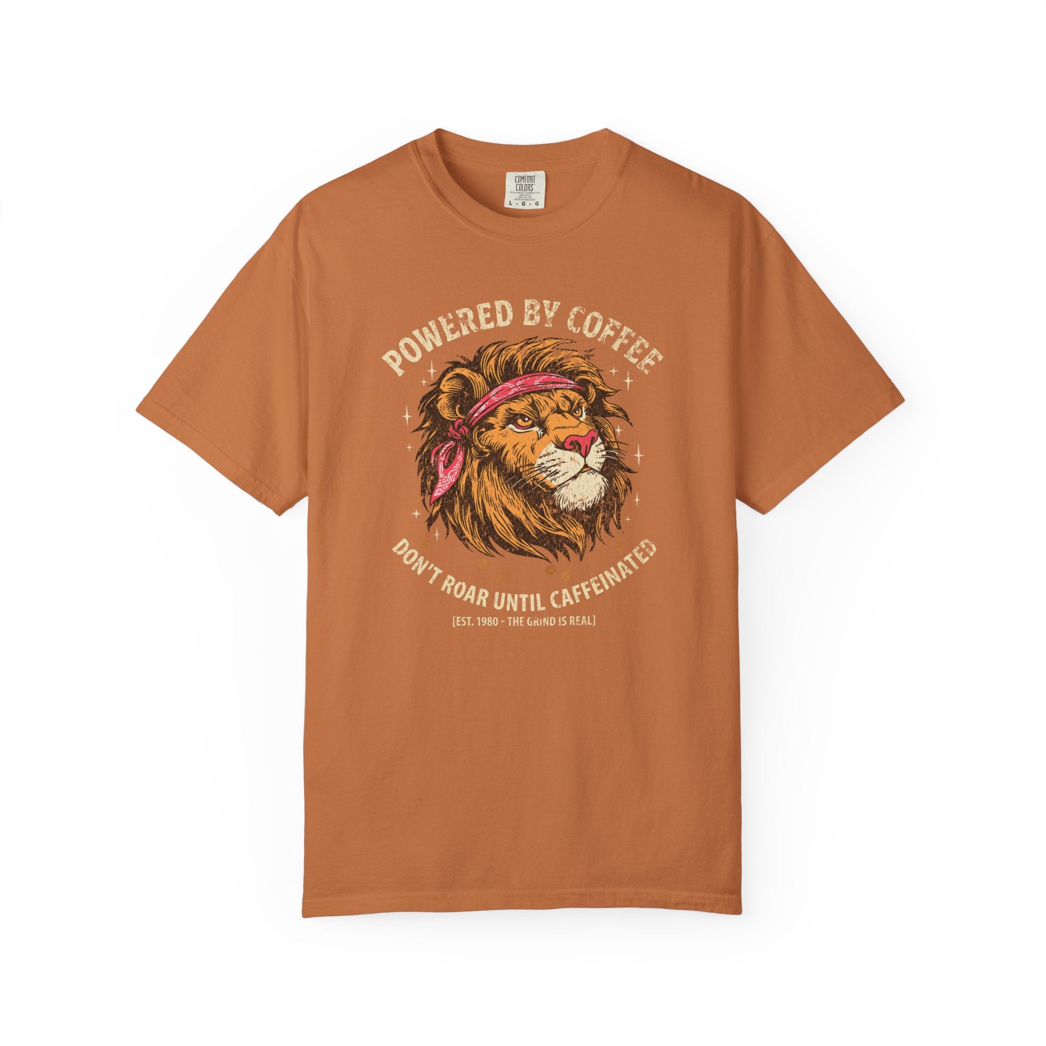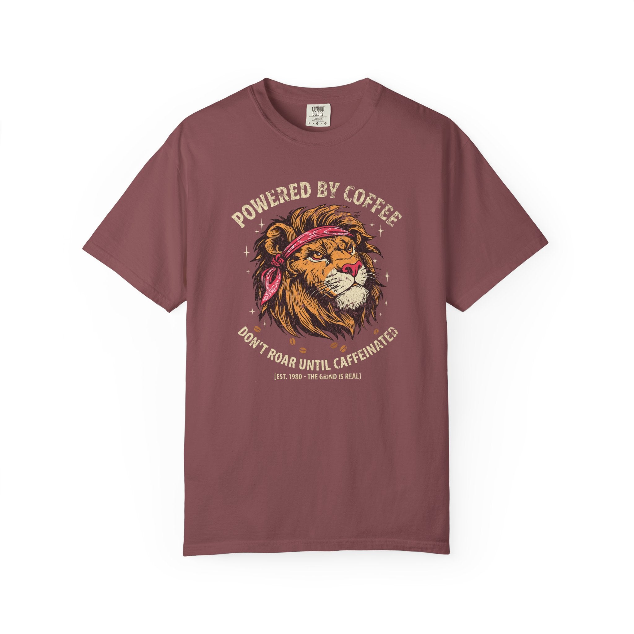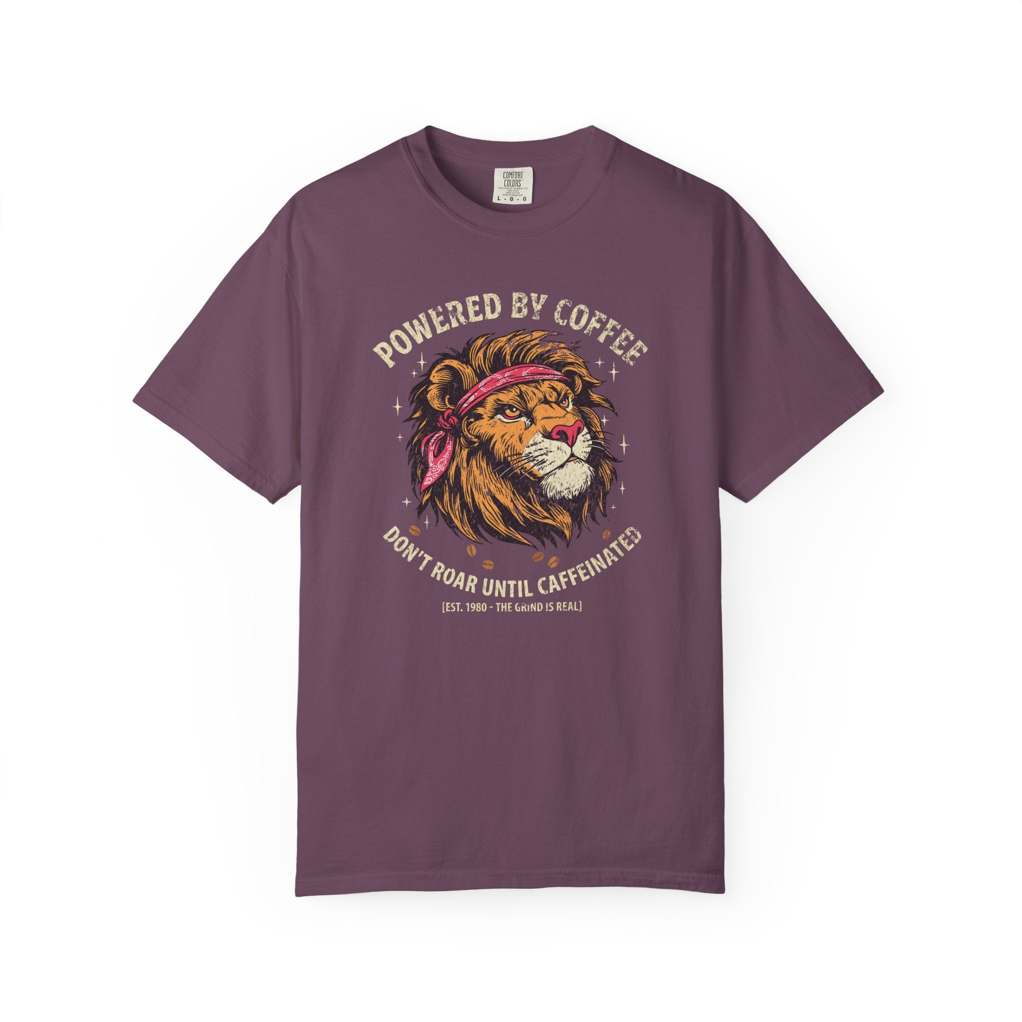 Distressed Print Powered by Coffee Lion T-Shirt — Don't Roar Until Caffeinated Graphic Tee
