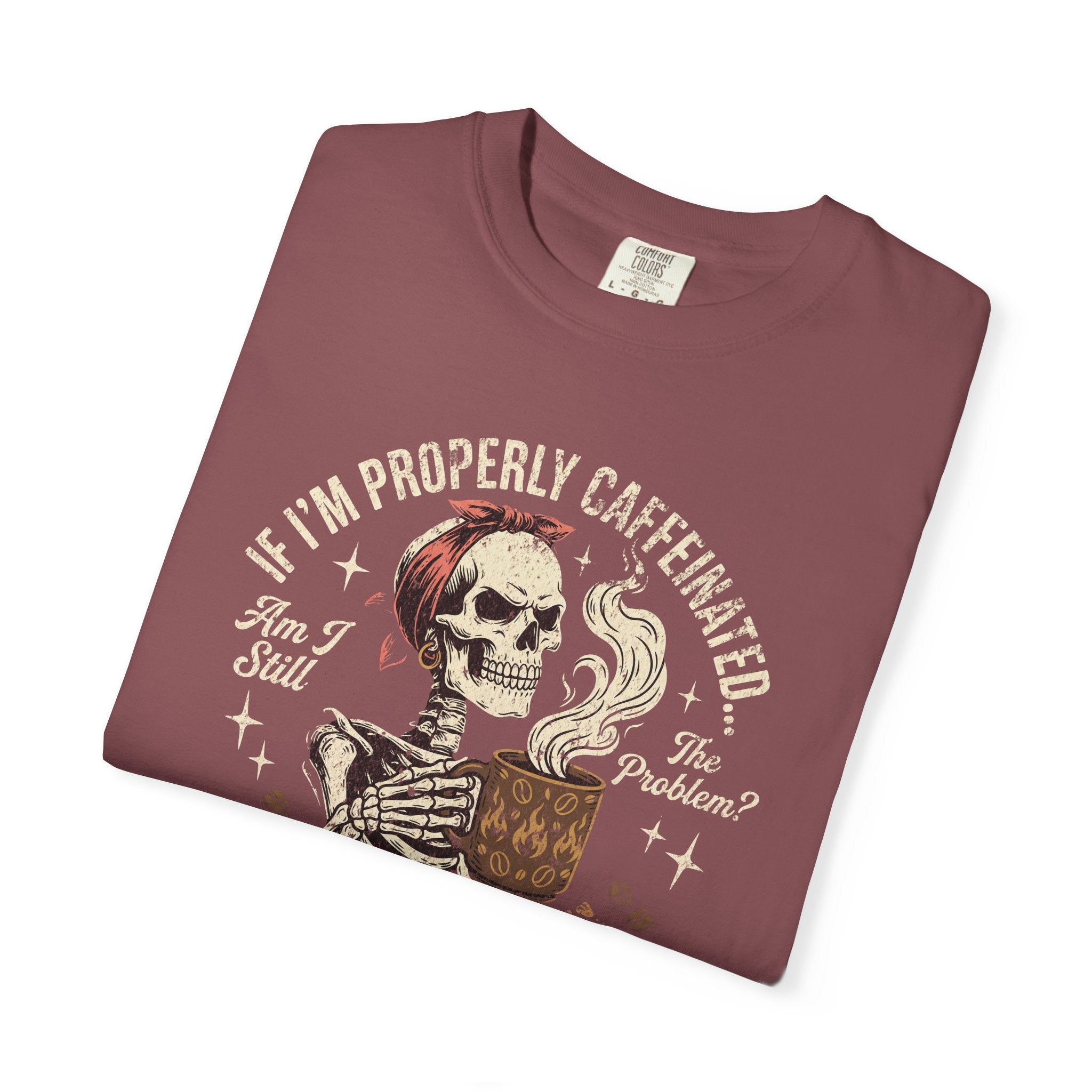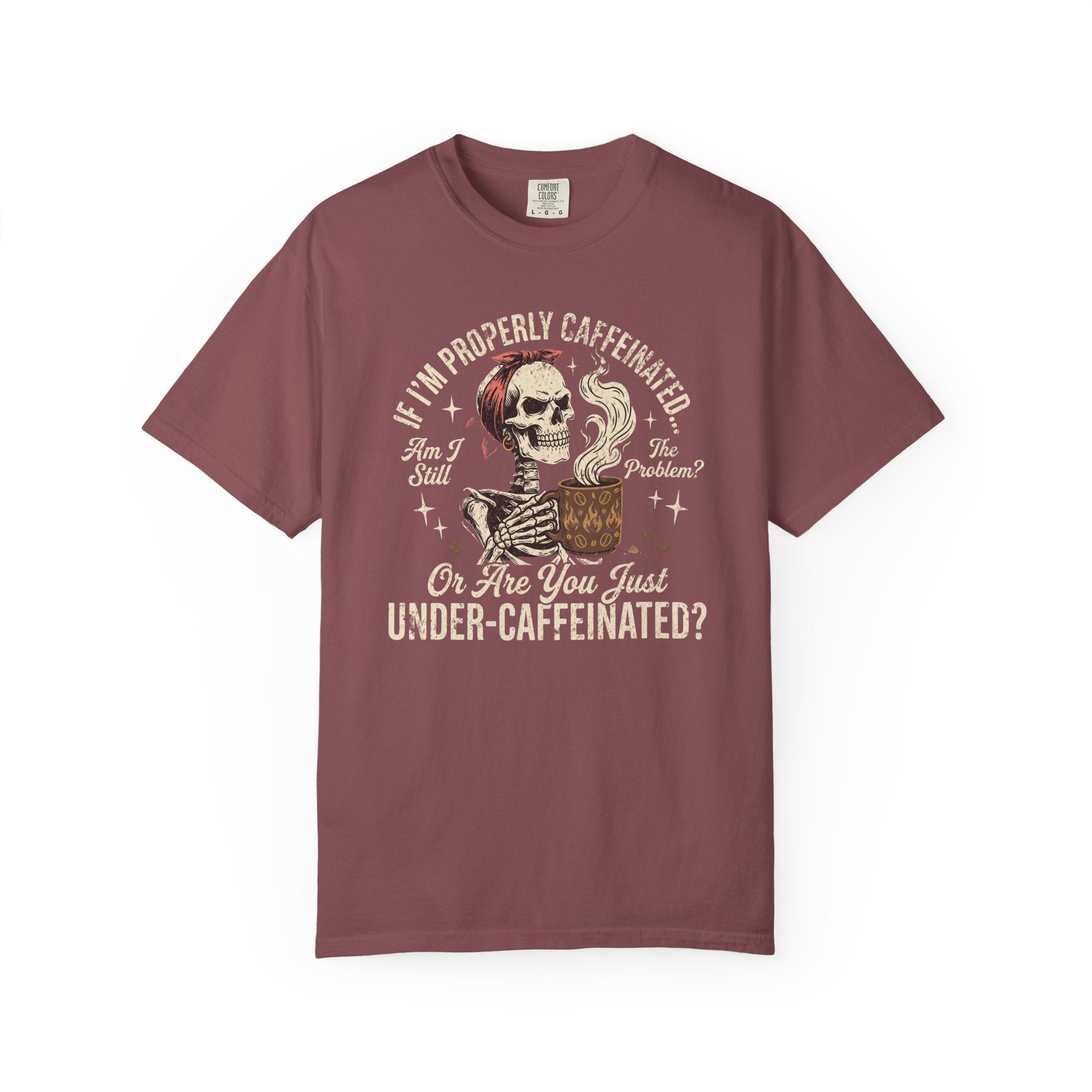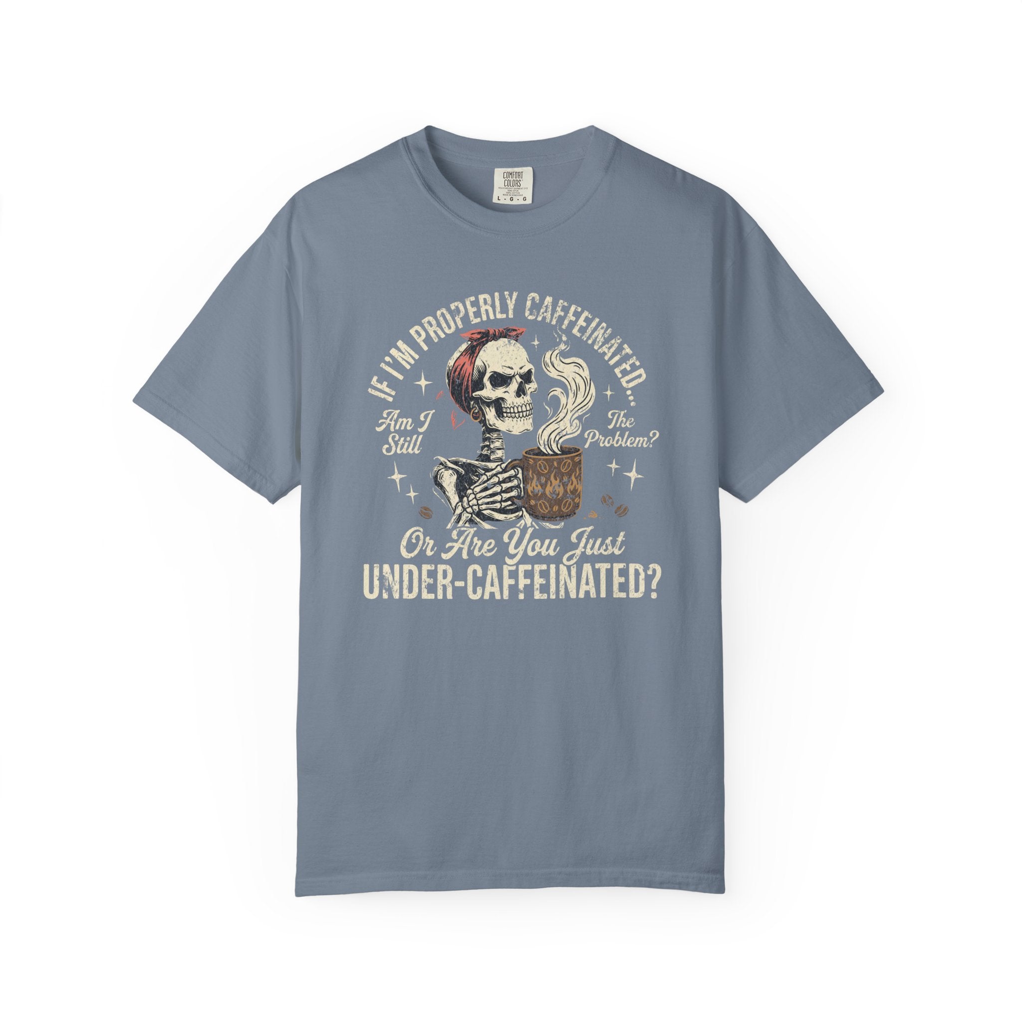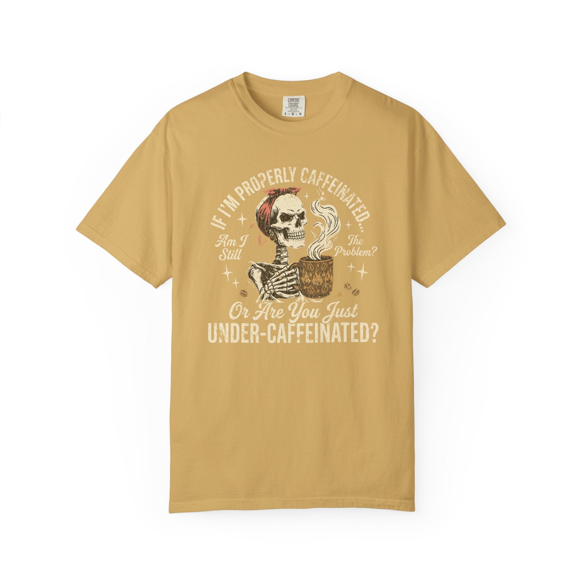 Distressed Print Caffeinated Skull T-Shirt — “If I'm Properly Caffeinated…Are You Just Under‑Caffeinated?”