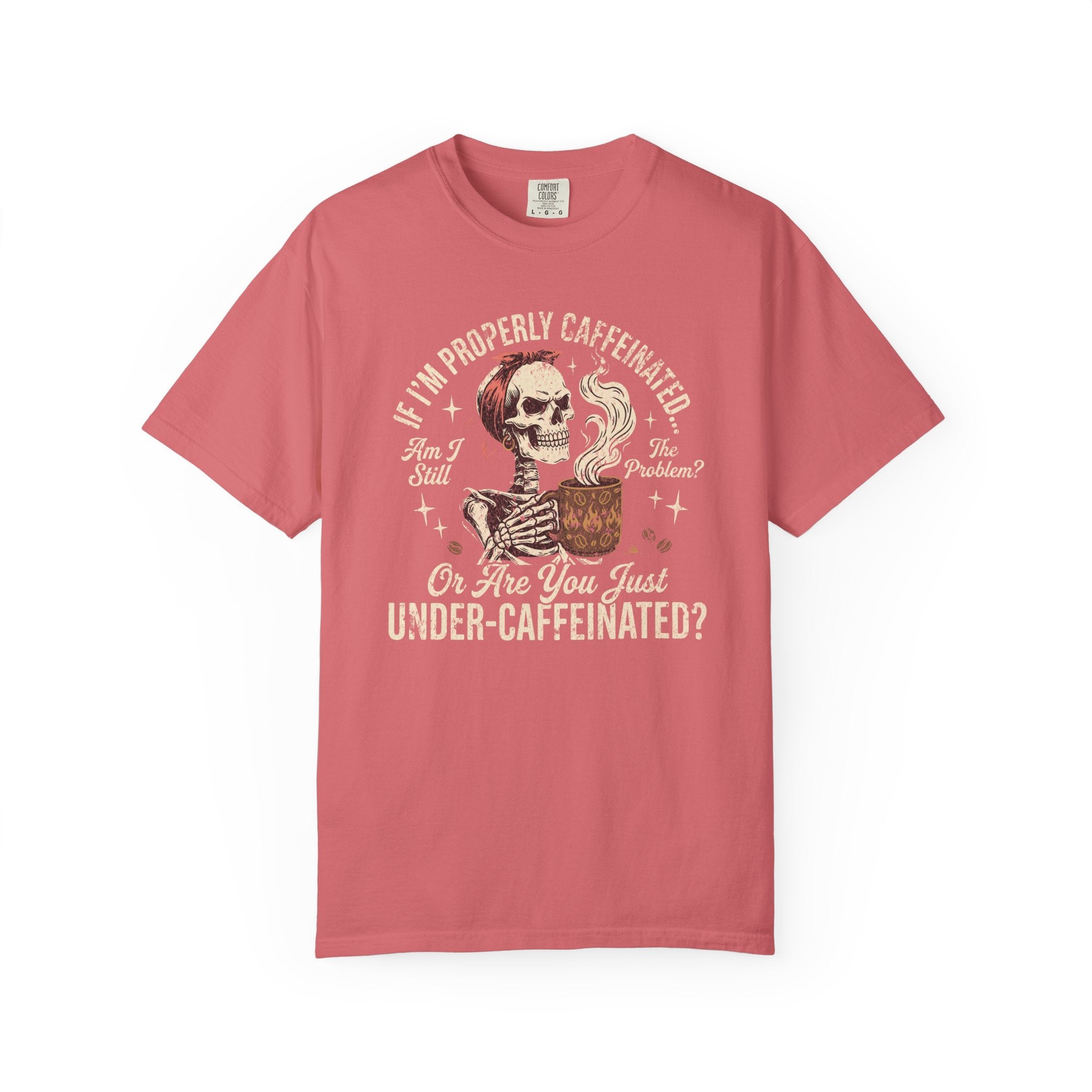 Start your morning with a healthy dose of dark humor and ultimate comfort. Our edgy "If I'm Properly Caffeinated... Or Are You Just Under-Caffeinated?" graphic tee perfectly captures the daily struggle before that first cup of coffee kicks in. Featuring a vintage-inspired skull clutching its essential steaming brew, this unisex cotton t-shirt effortlessly blends a witty, sarcastic personality with premium everyday casual wear. Whether you are hitting the local cafe for a double espresso, surviving a chaotic day at the office, or simply lounging on a lazy Sunday, this highly versatile shirt delivers the exact cozy vibe you need to survive.