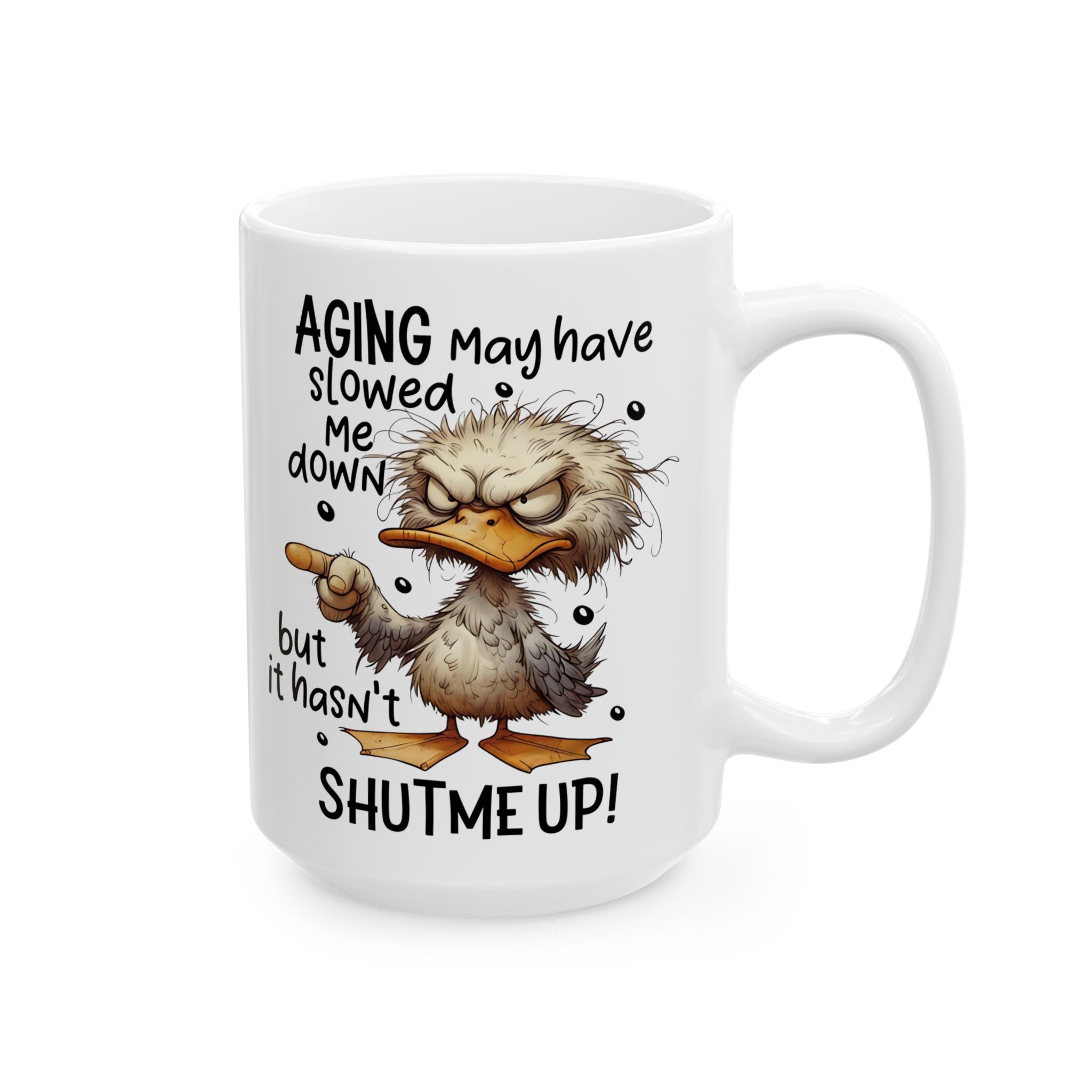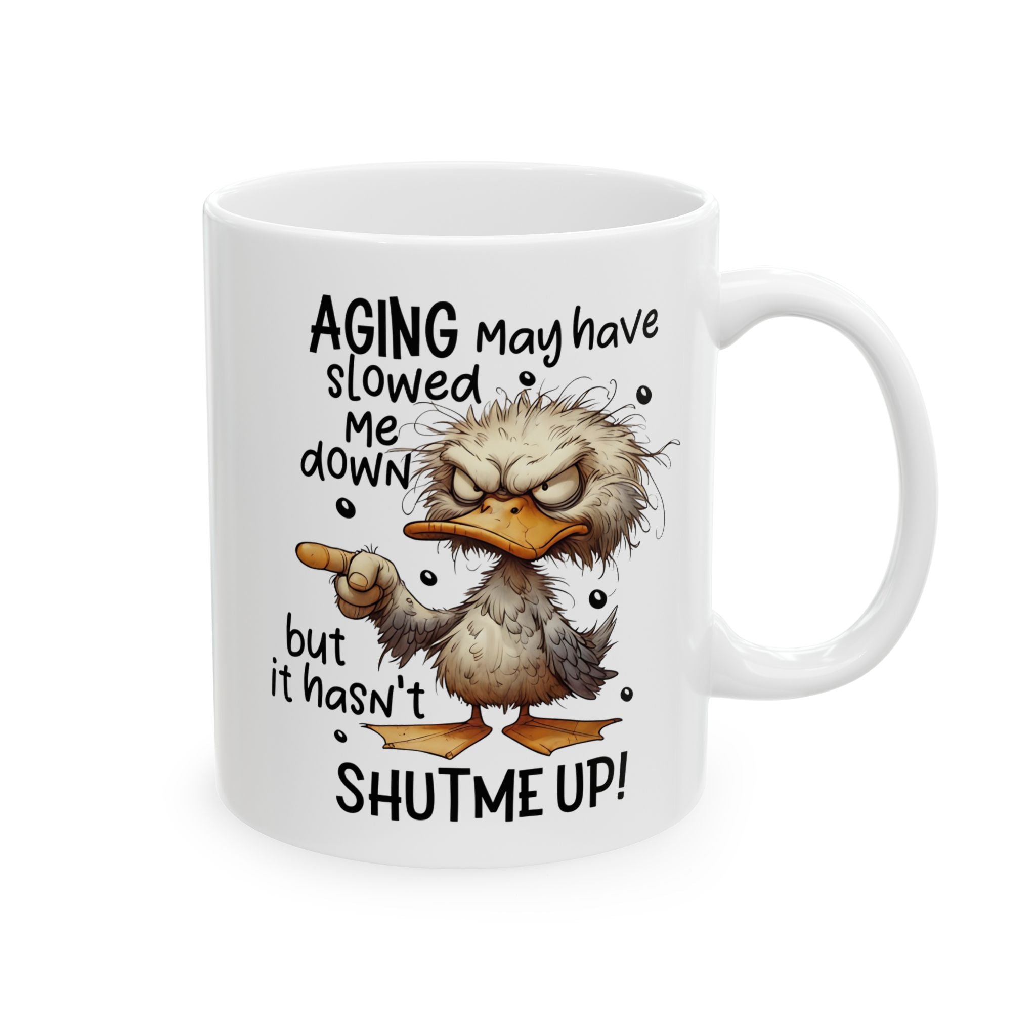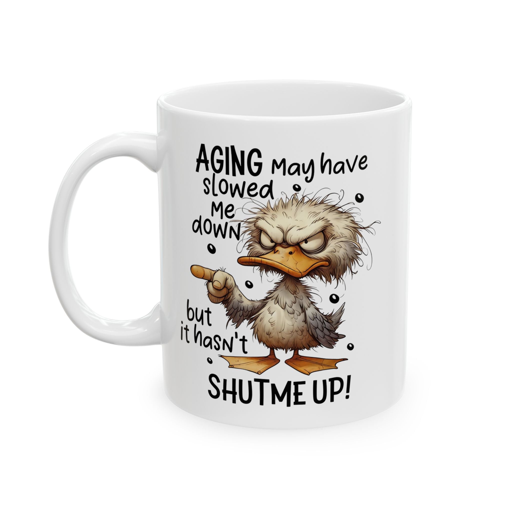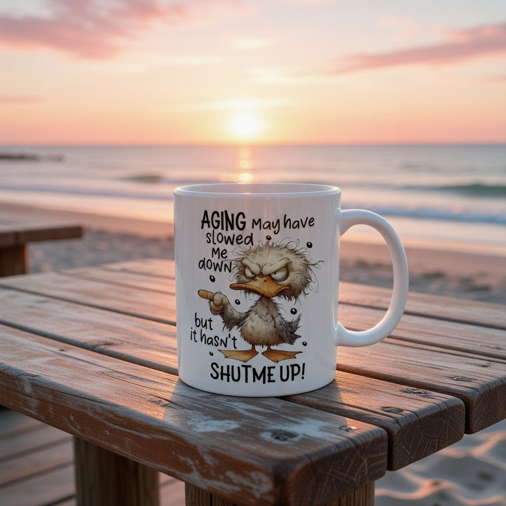 The Perfect Mug for Those With Plenty Still to Say Add a touch of wit to your morning routine with this hilarious ceramic mug. Featuring a charming illustration and the bold message Aging May Have Slowed Me Down But It Has Not Shut Me Up, this cup is the ultimate companion for anyone who embraces their age with a side of sass. The vibrant design wraps around the glossy white surface, ensuring the playful character and quote stay vivid through every refill.