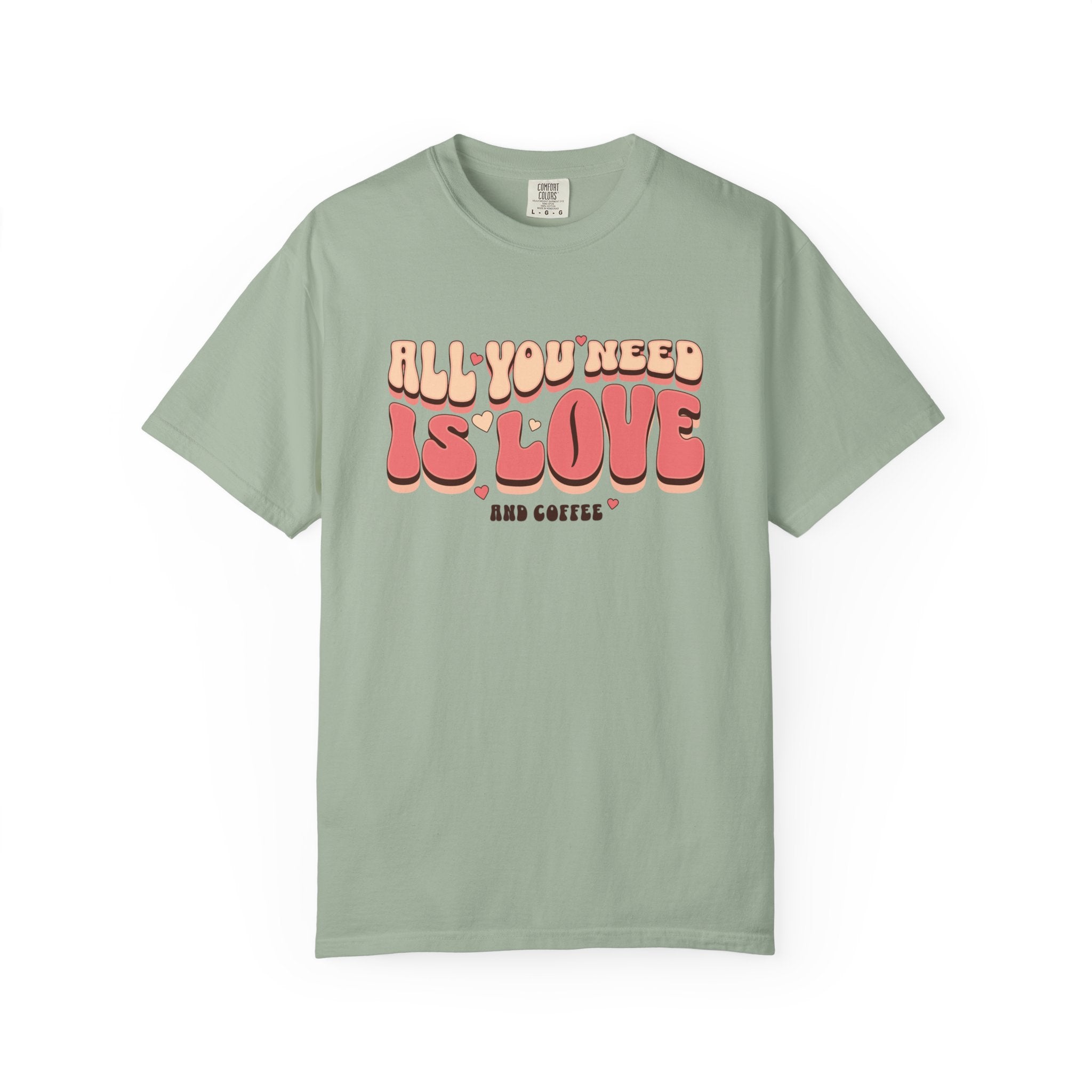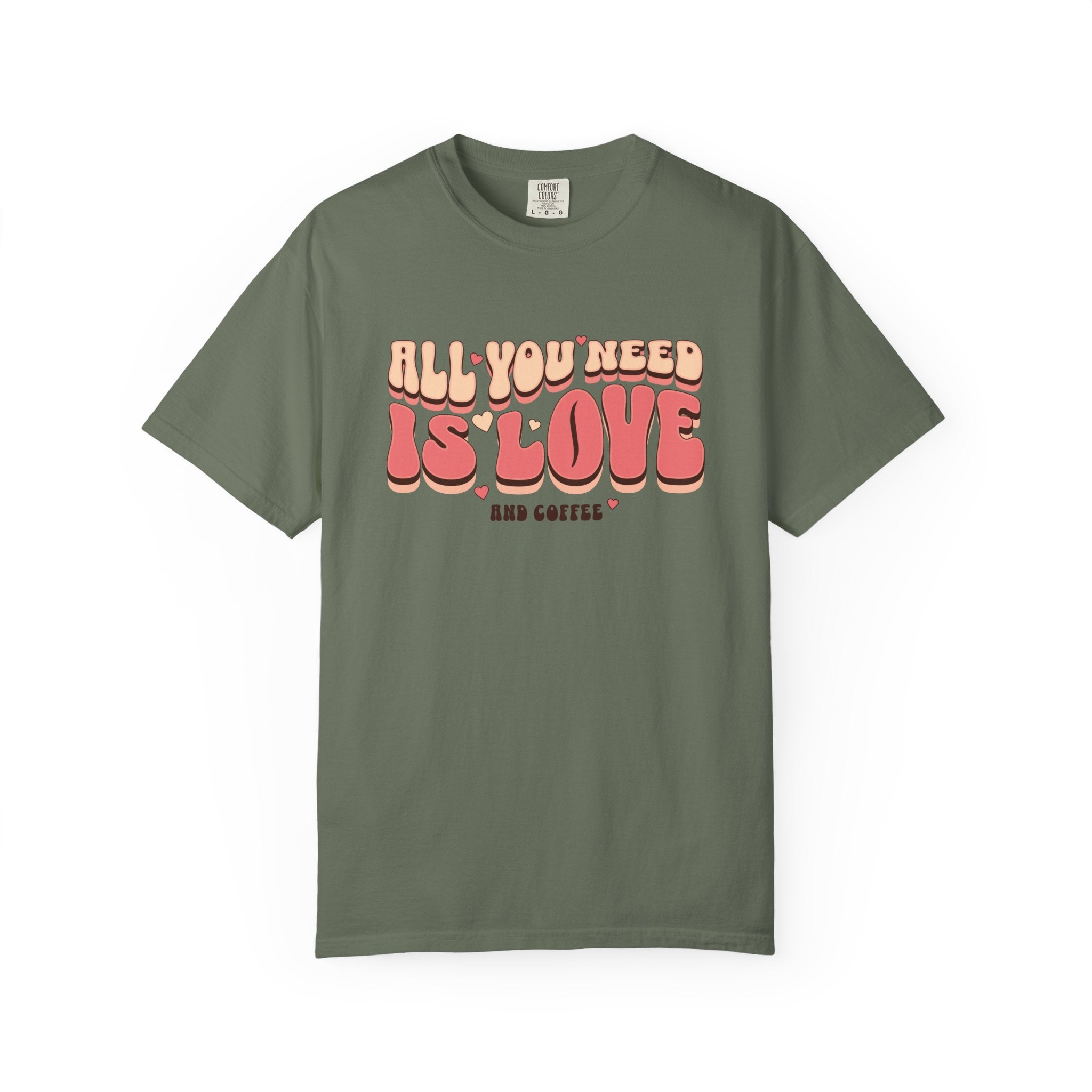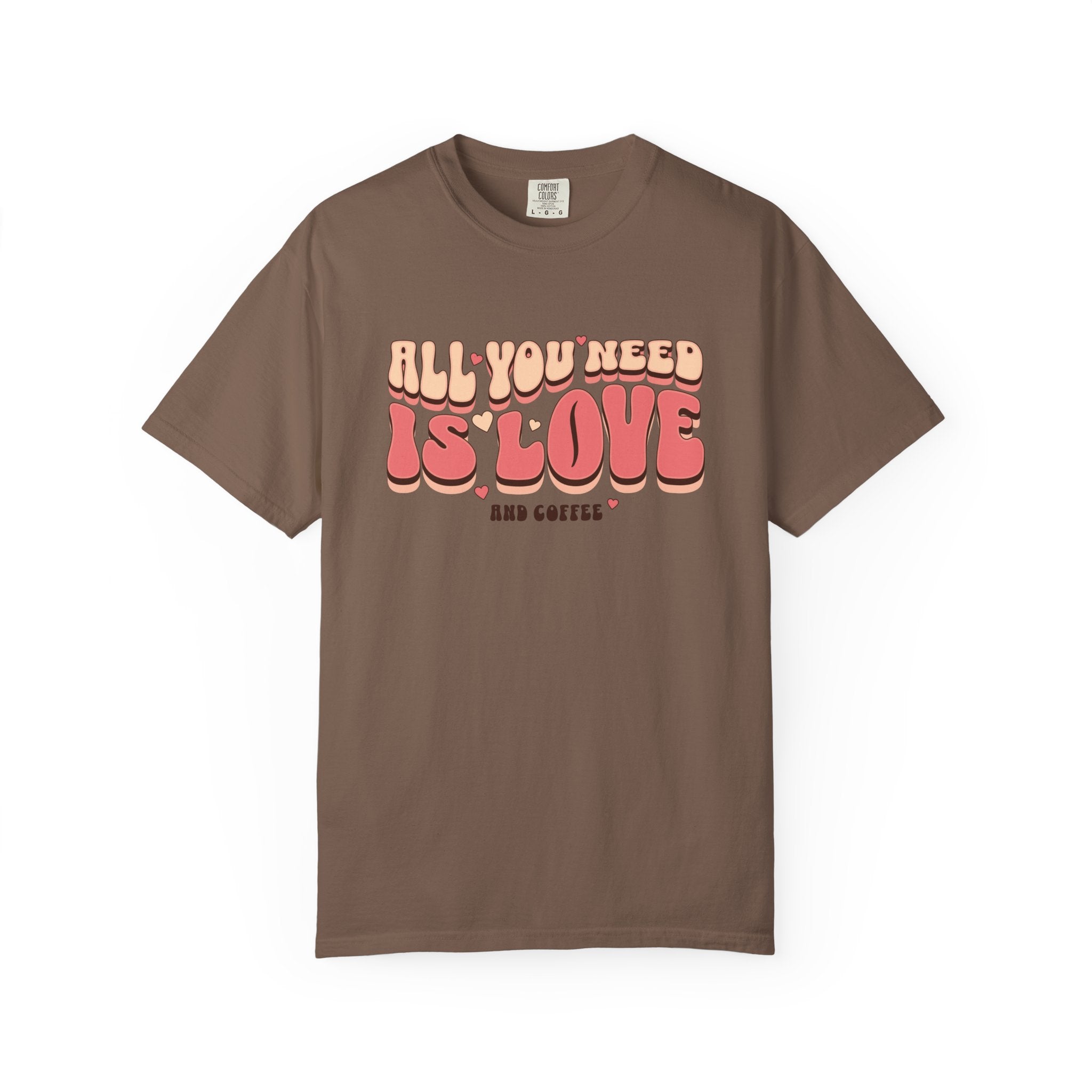 The Ultimate Blend of Comfort and Caffeine Celebrate your favorite daily ritual with this premium garment dyed t shirt. Featuring a warm and vintage inspired design that reads All You Need Is Love And Coffee in retro bubble lettering, this tee is the perfect choice for slow mornings at your local cafe or cozy afternoons at home. The soft, muted colors and relaxed drape give it an immediate lived-in feel that pairs perfectly with denim or your favorite lounge wear.