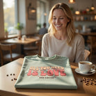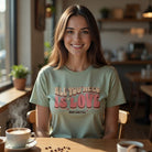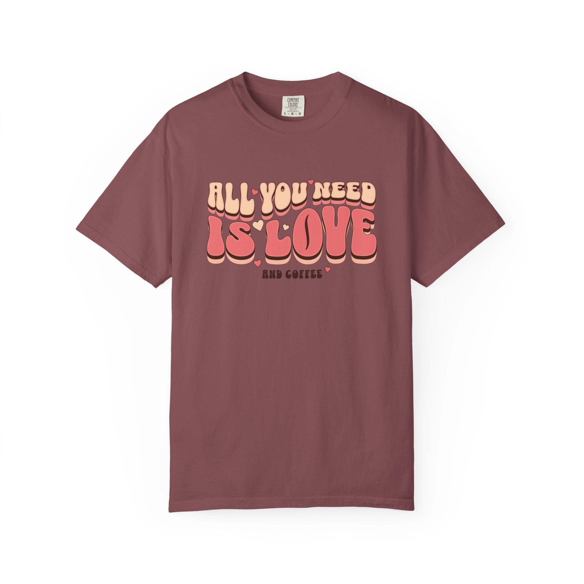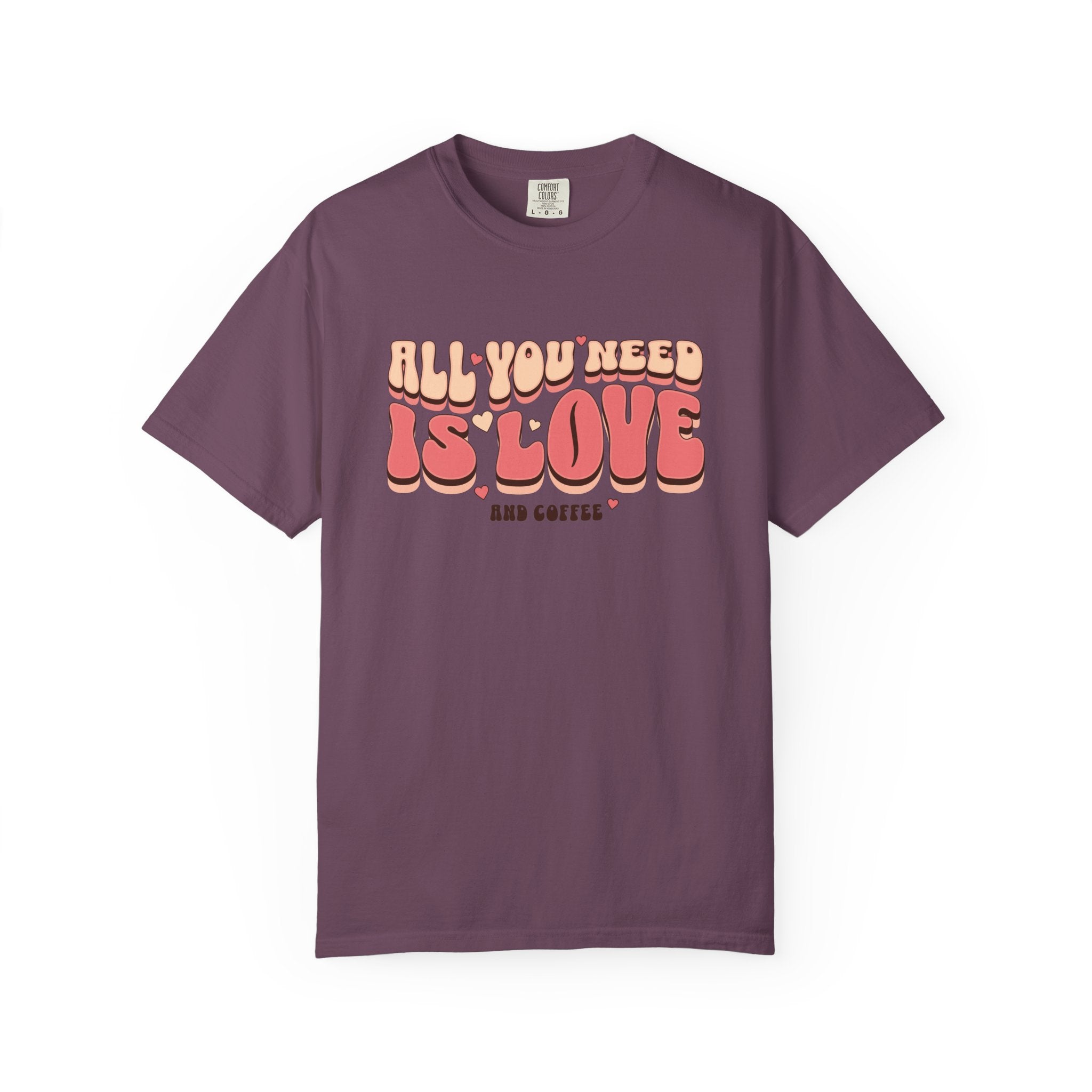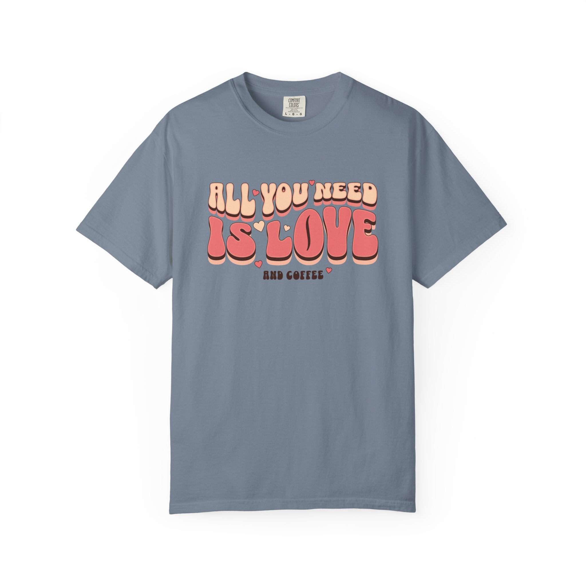 The Ultimate Blend of Comfort and Caffeine Celebrate your favorite daily ritual with this premium garment dyed t shirt. Featuring a warm and vintage inspired design that reads All You Need Is Love And Coffee in retro bubble lettering, this tee is the perfect choice for slow mornings at your local cafe or cozy afternoons at home. The soft, muted colors and relaxed drape give it an immediate lived-in feel that pairs perfectly with denim or your favorite lounge wear.