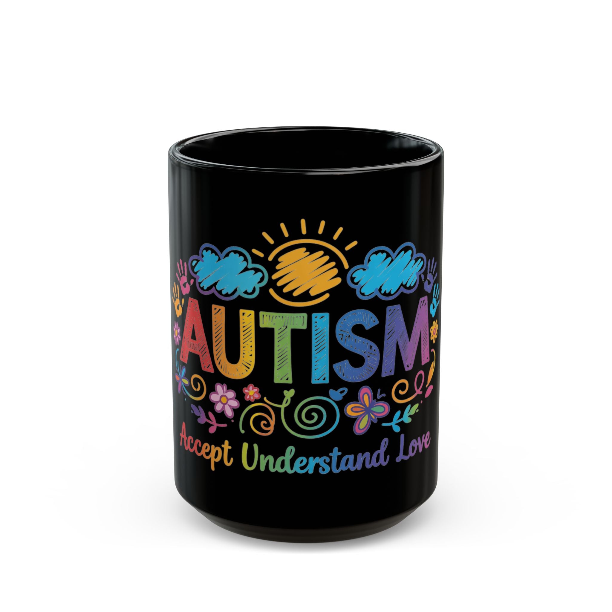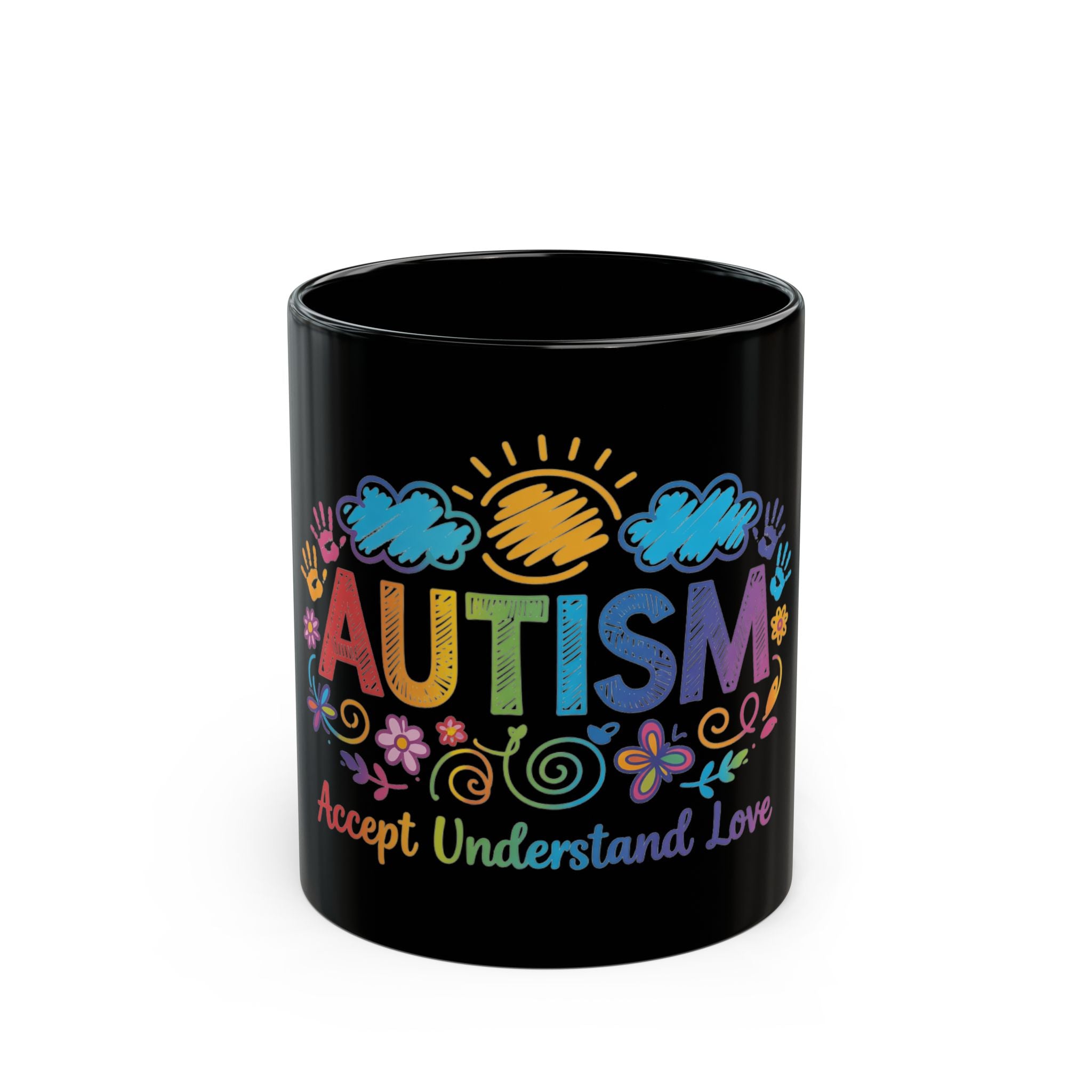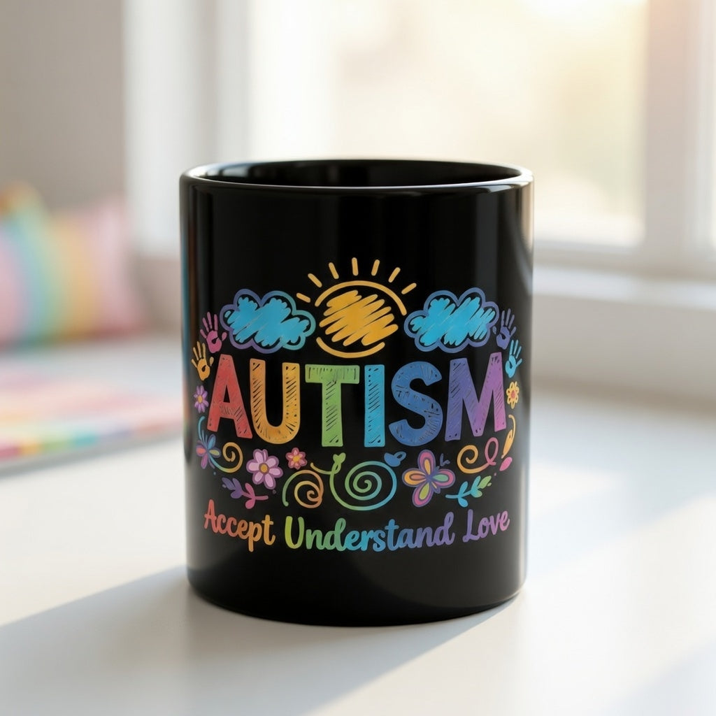 Show your support with this Autism Awareness Black Coffee Mug, featuring the uplifting "Accept, Understand, Love" rainbow design. Perfect for Autism parents, educators, and therapists, this mug is a vibrant celebration of neurodiversity. Whether it's a gift for Autism Acceptance Month (April) or a daily reminder of inclusion, the colorful handprints and sun-and-flower doodles make this black ceramic cup a standout piece.