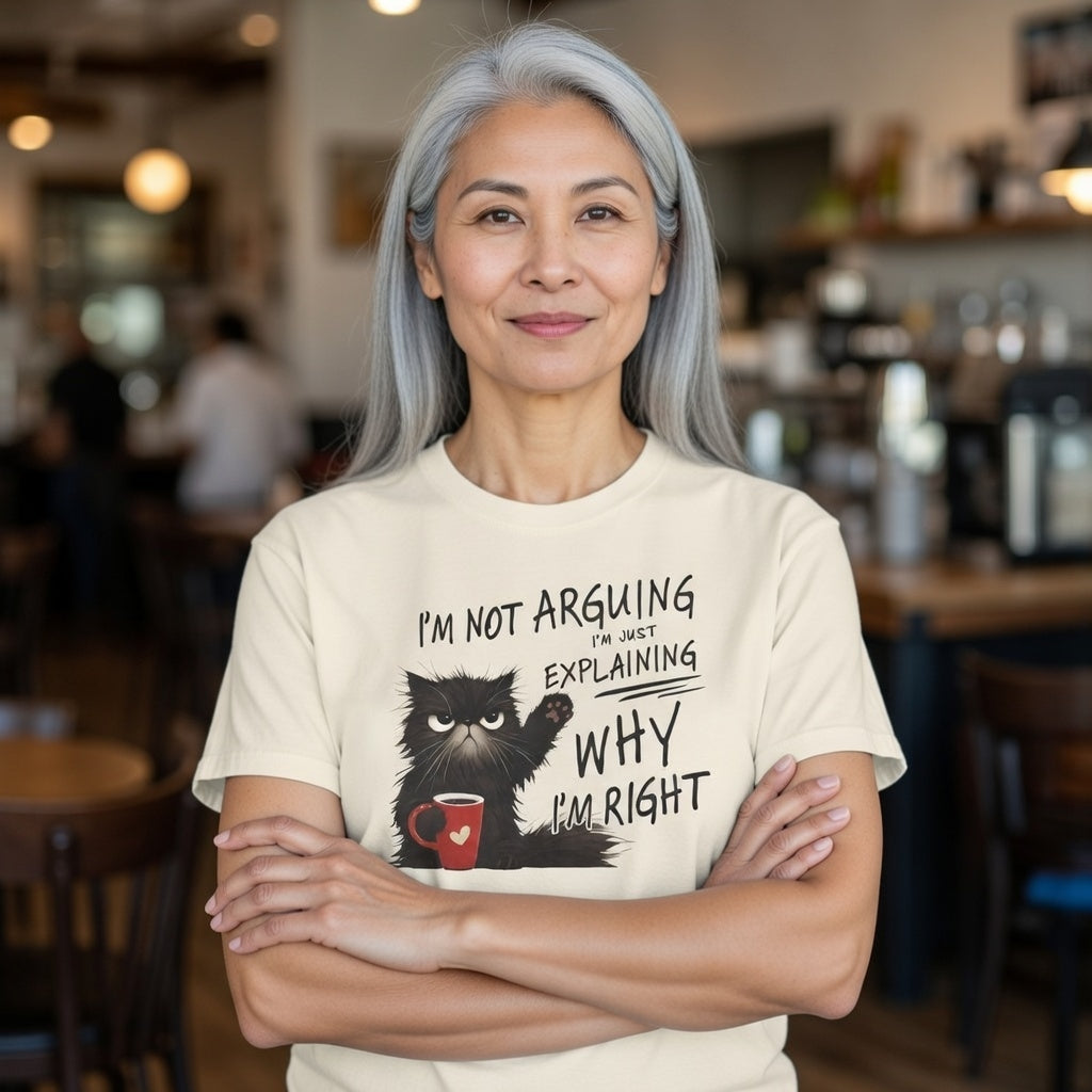 Win every debate with this sassy grumpy cat tee: Im Not Arguing, Im Just Explaining Why Im Right. Featuring a feisty black cat raising its paw while clutching a red coffee mug with a heart, this design captures the ultimate caffeinated confidence—because sometimes explaining is just proving you're right, one sip at a time.