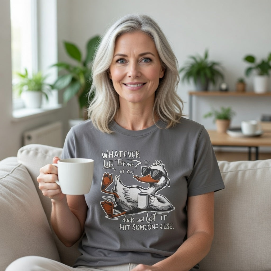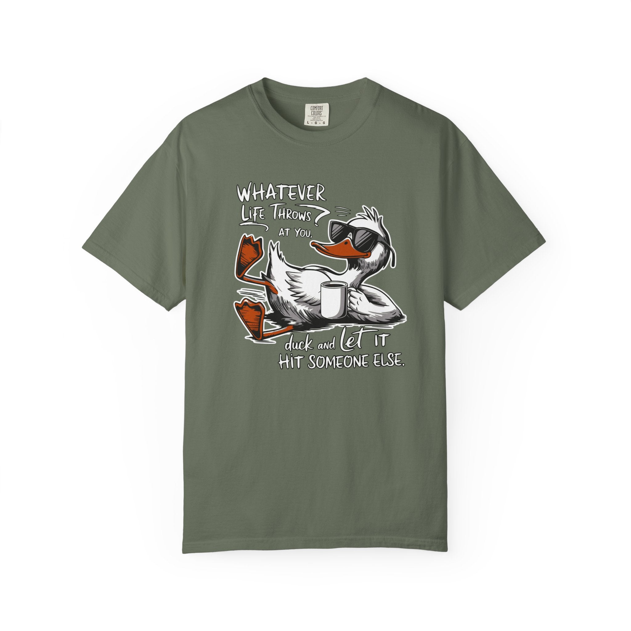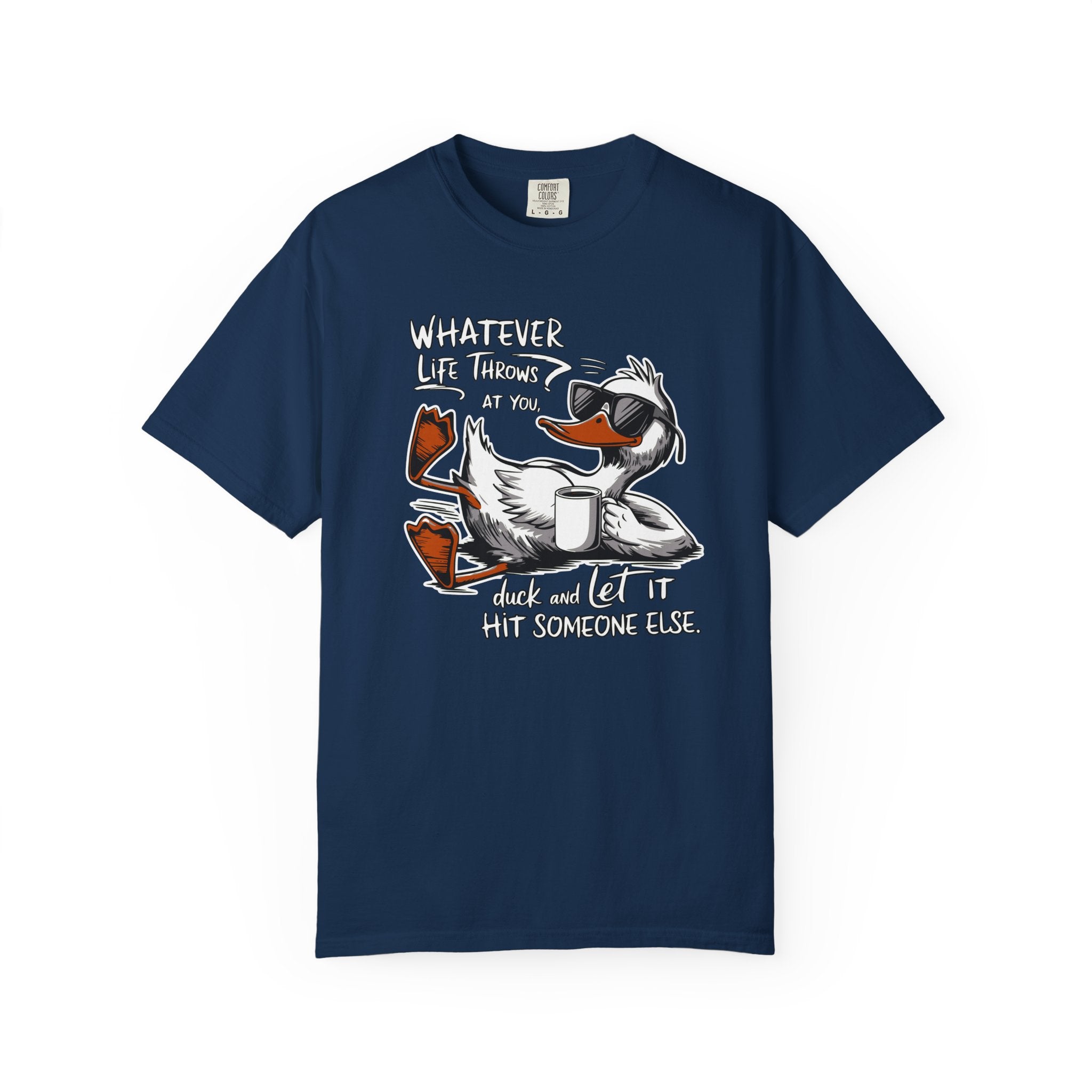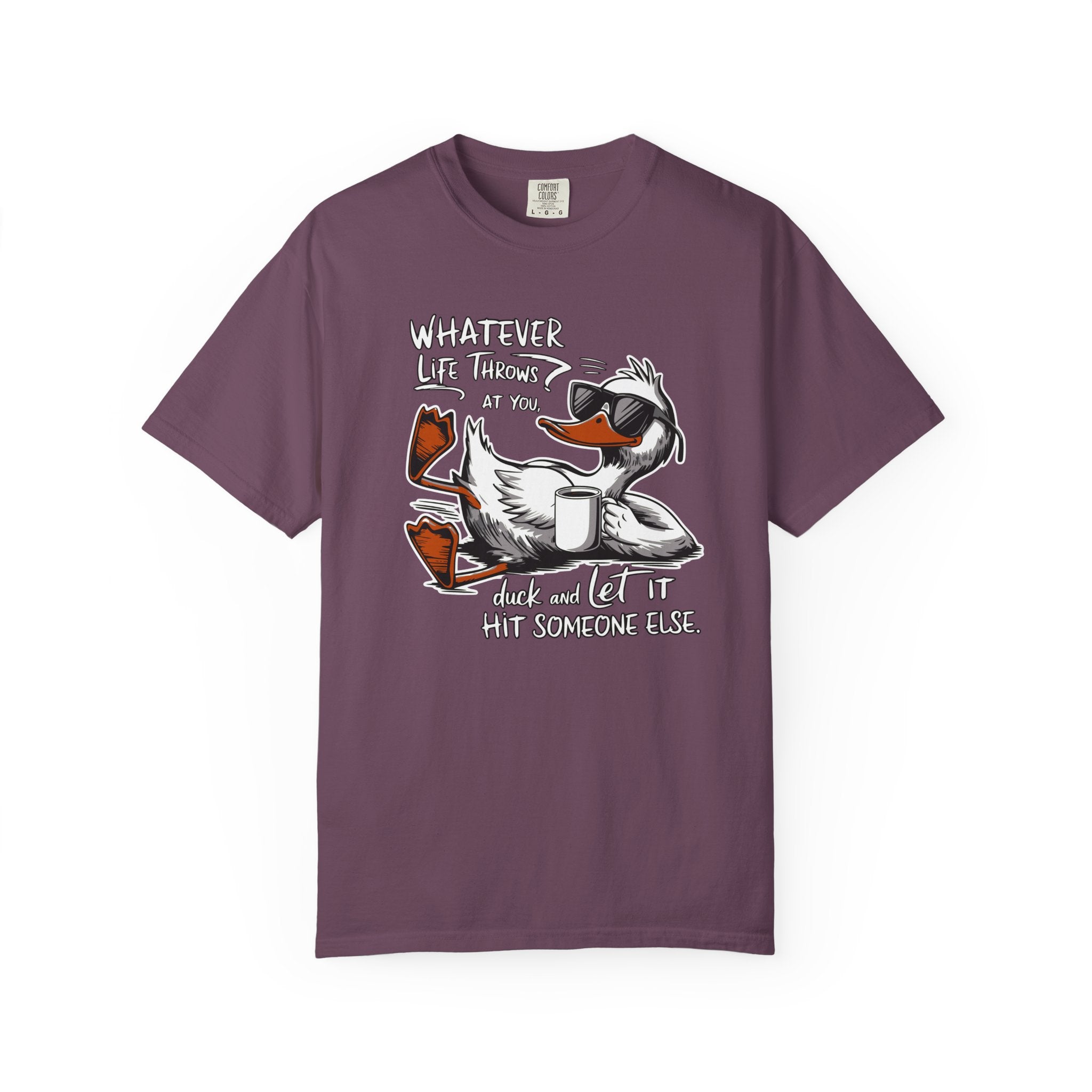 The Ultimate Relaxed Tee for a Stress Free Vibe Step out with a sense of humor and a lot of style in this premium garment dyed t shirt. Featuring a cool sunglasses wearing duck lounging without a care, this tee delivers the perfect piece of snarky advice Whatever Life Throws At You Duck And Let It Hit Someone Else. It is the ideal shirt for weekend hangouts, casual road trips, or those lazy afternoons when you want to look great while keeping it low key.