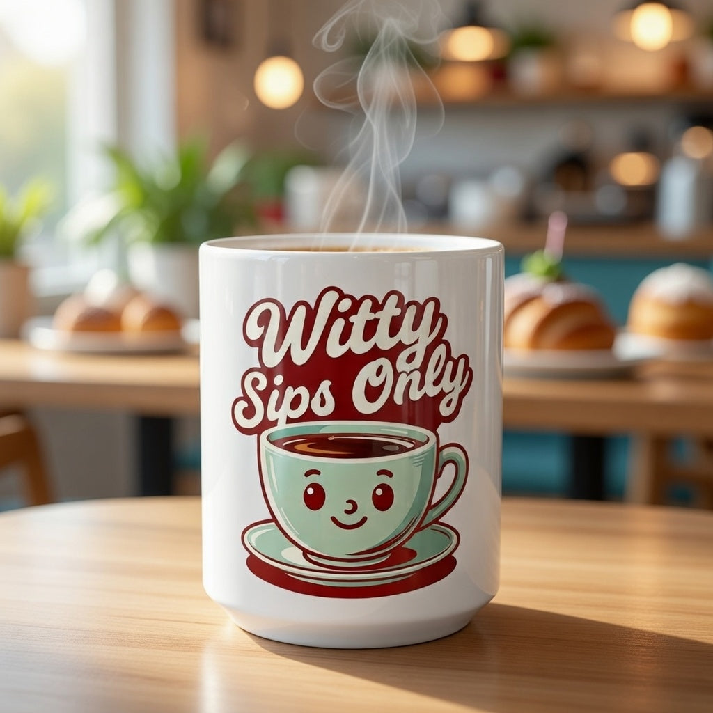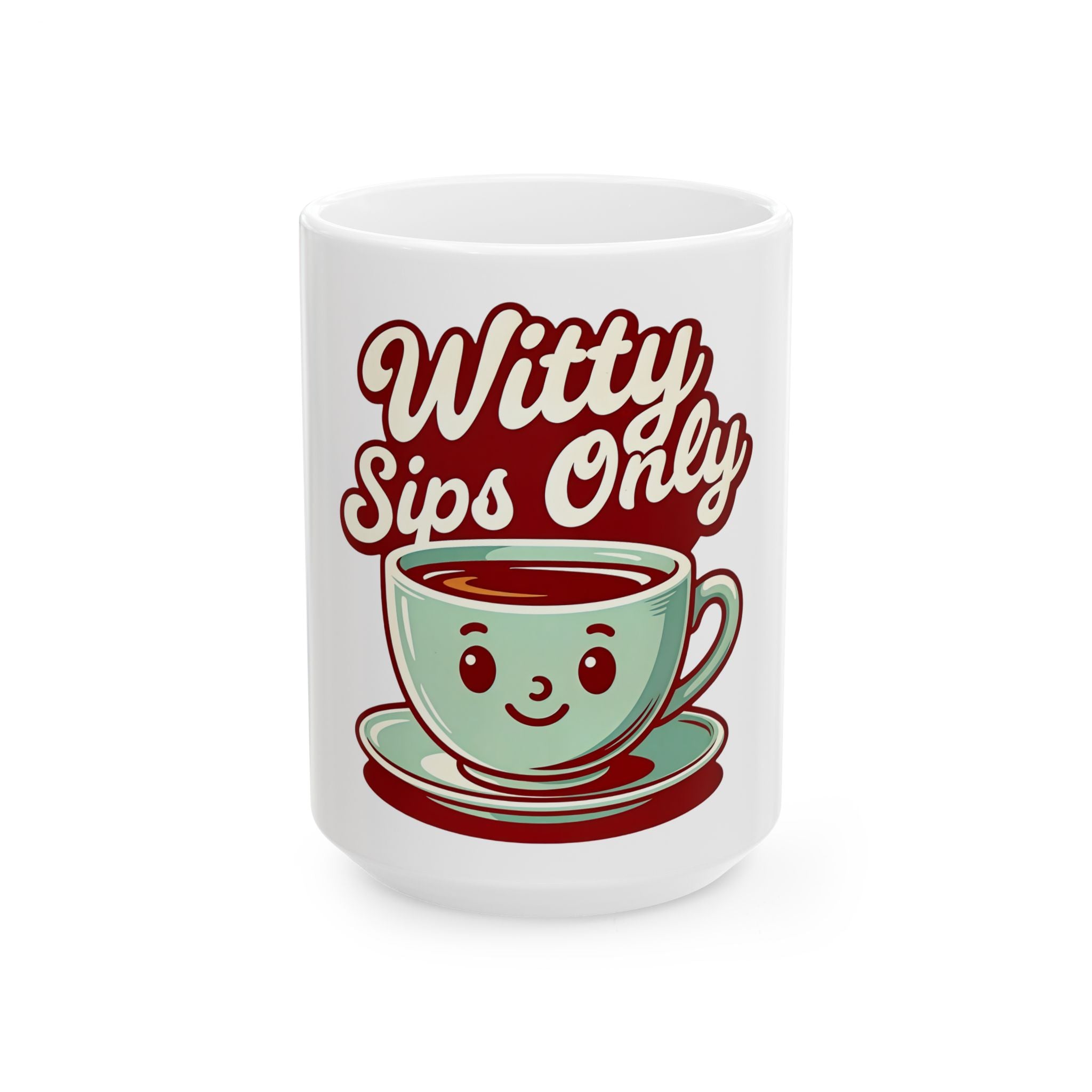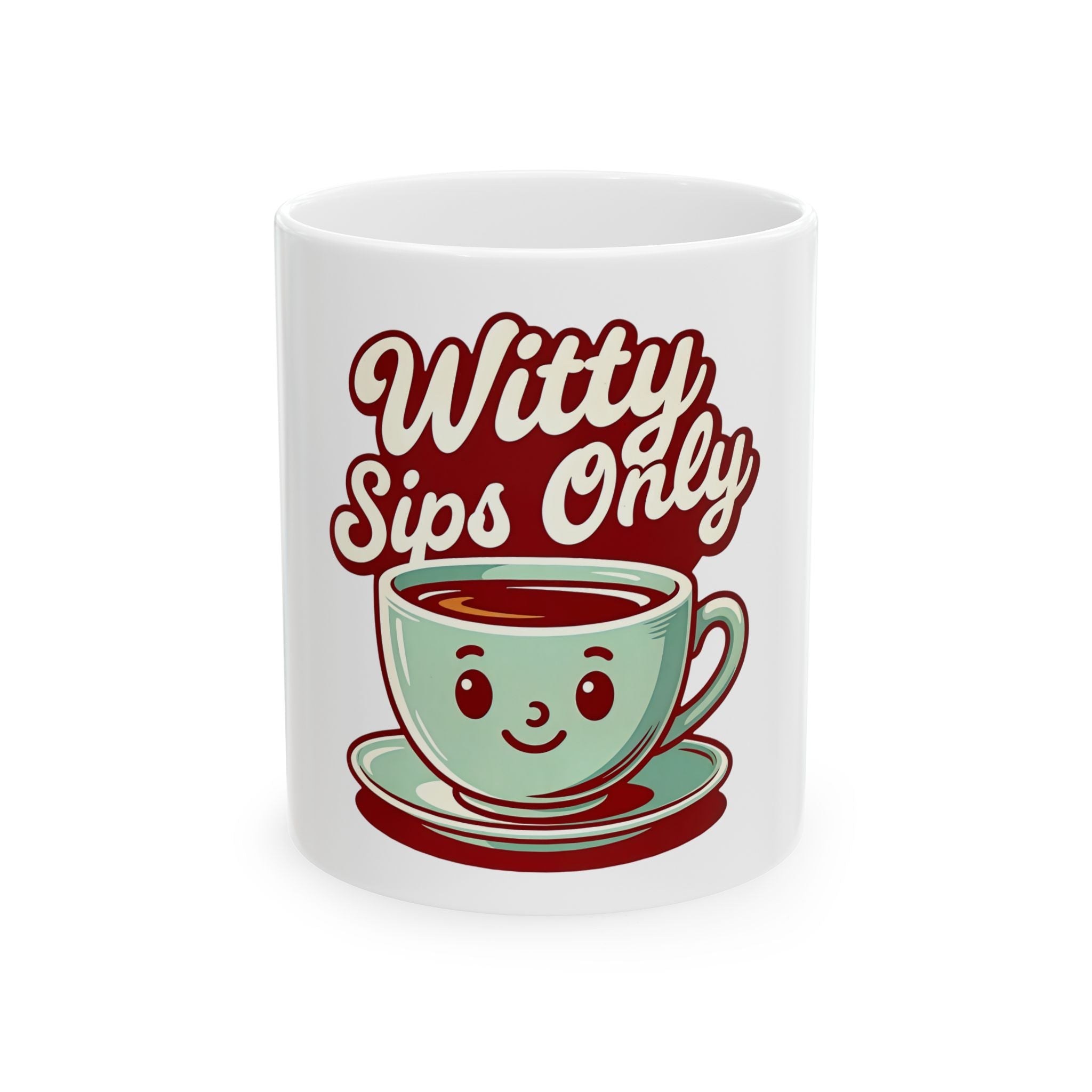 The Ultimate Mug for Your Daily Dose of Wit Brighten your morning routine with this charming white ceramic mug. Featuring a cheerful smiling teacup illustration and the cheeky message Witty Sips Only, this mug is the perfect companion for those who appreciate a side of humor with their caffeine. The lighthearted retro design pops against the glossy white surface, making it a favorite for your kitchen or office.