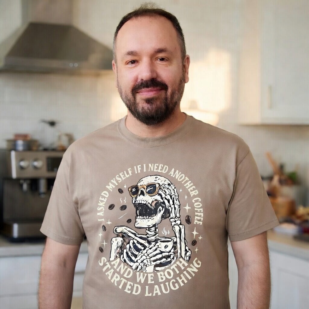 Distressed Print - Soft Relaxed Fit Skeleton Coffee Tee | Casual Everyday Comfort