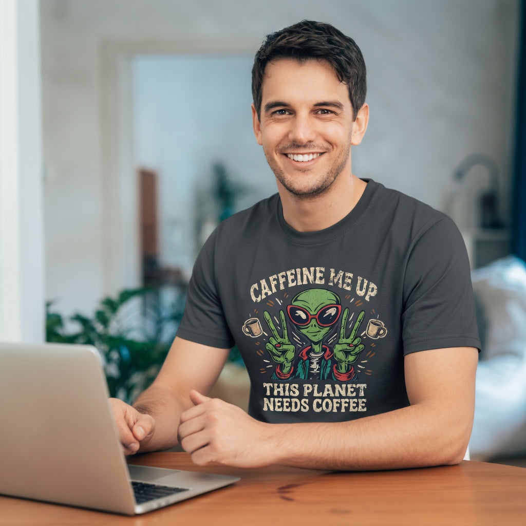 Distressed Print Alien Coffee Tee | Soft Relaxed Fit Unisex Cotton Graphic Shirt